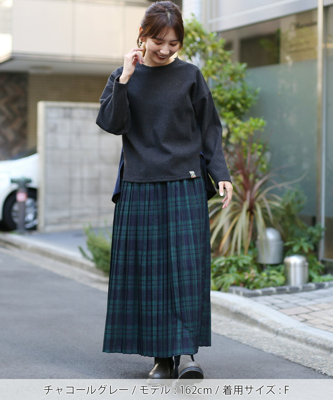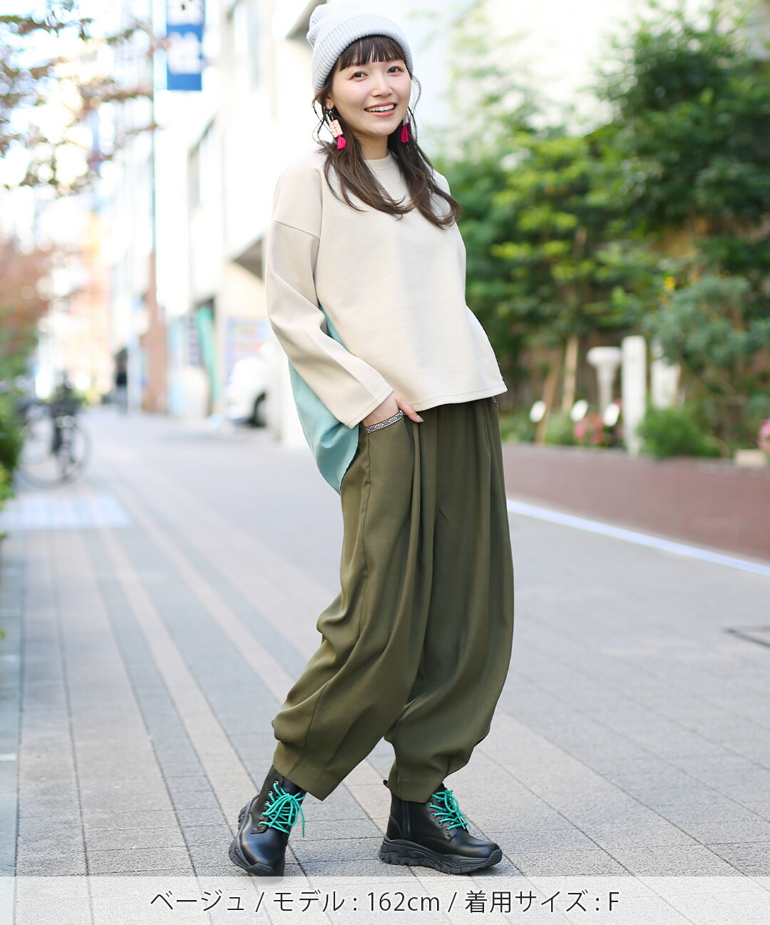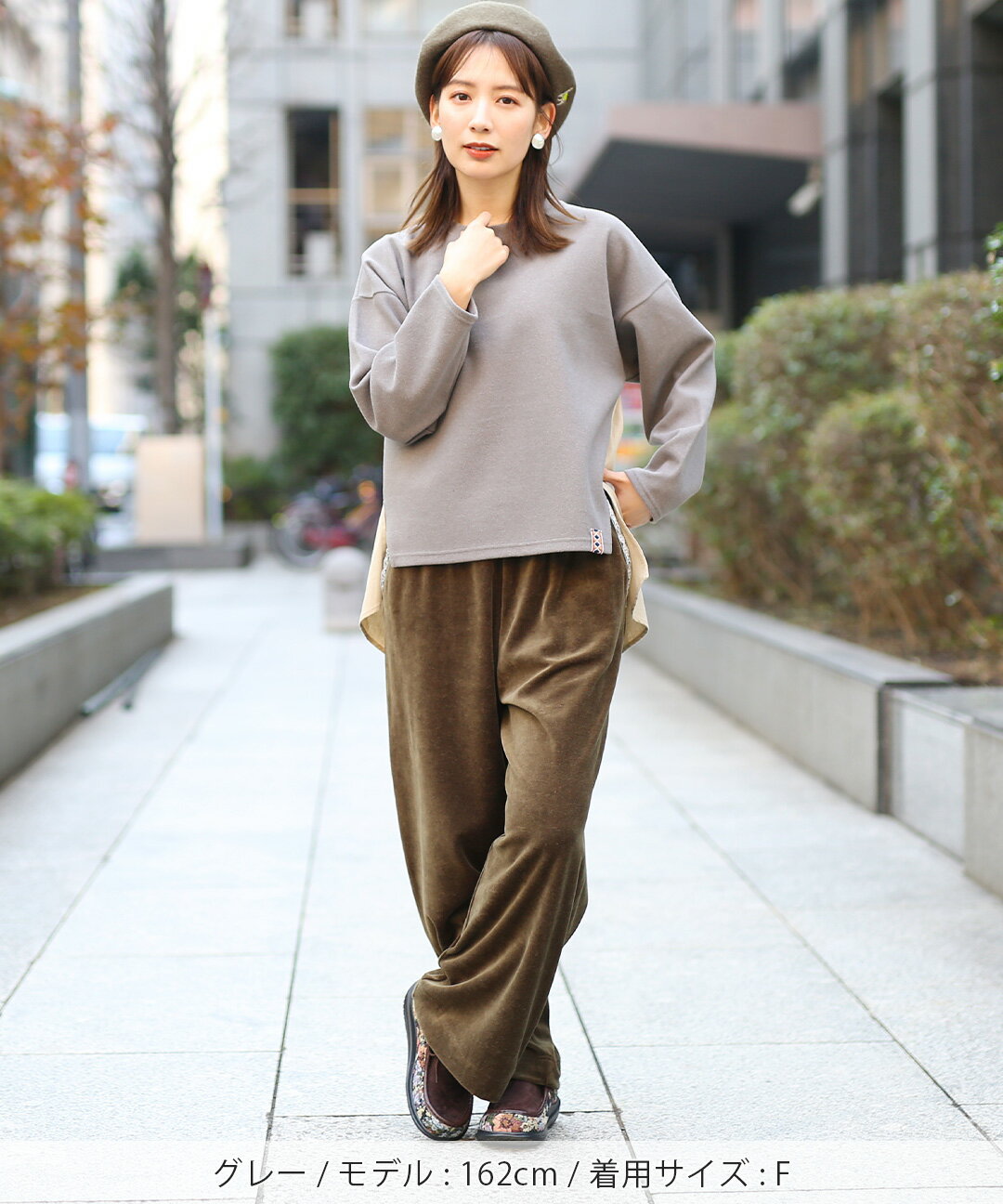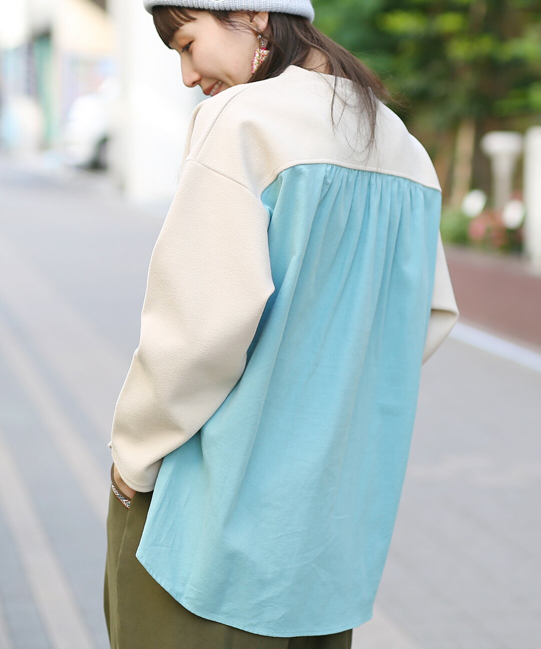 異素材コンビプルオーバー / デザイントップス レディース 秋 冬 無地 配色 ベージュ グレー チャコールグレー ゆったり 長袖 クルーネック バックシャン ウールライク フェイクウール カットソー スウェット カジュアル エスニック チチカカ TITICACA