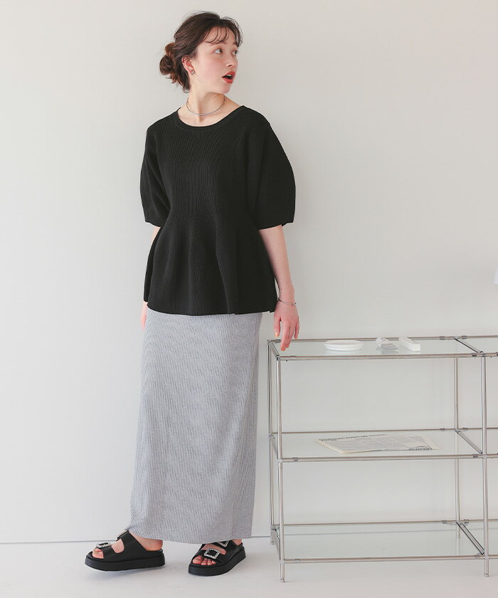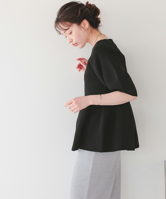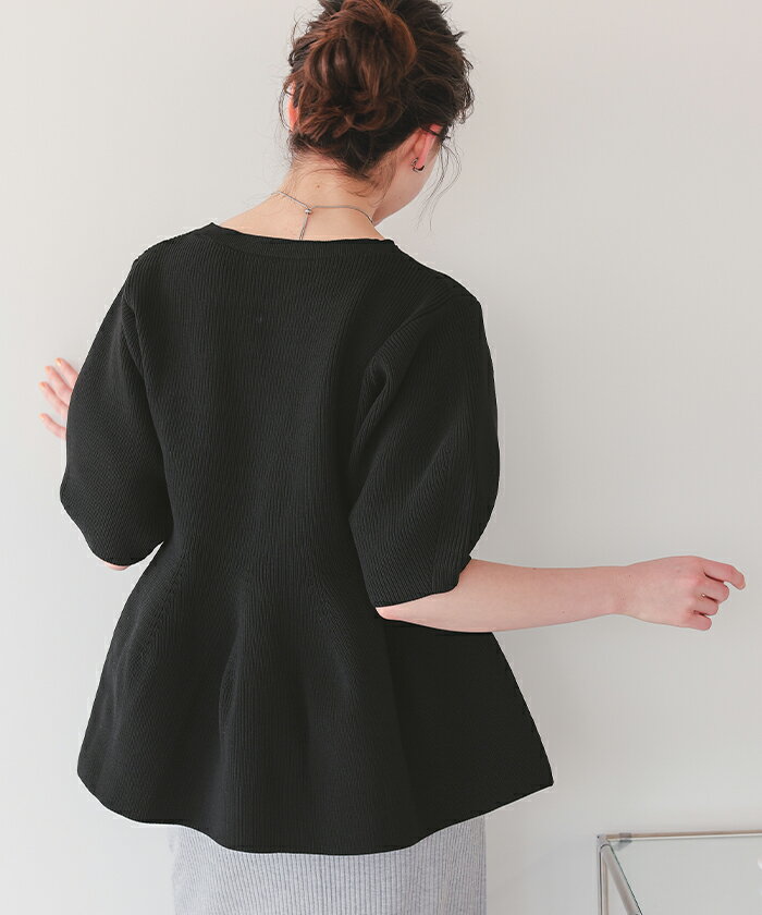 フレアデザインニットトップス ペプラムシルエットが女性らしい トップス レディース ニット 半袖 バルーンスリーブ クルーネック ペプラム フレア シンプル