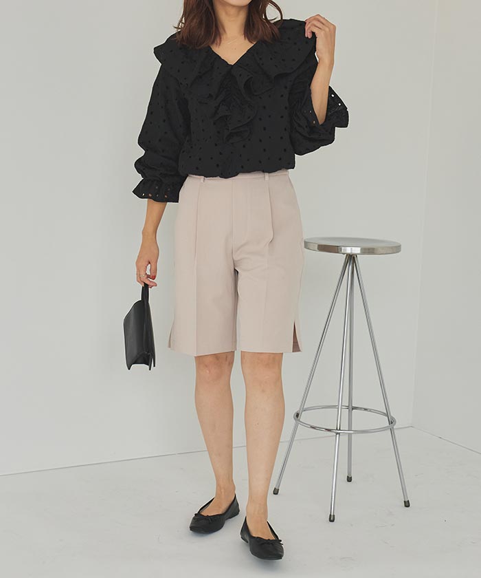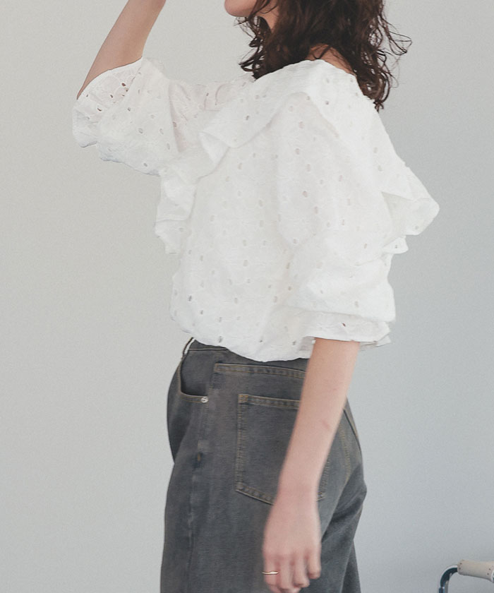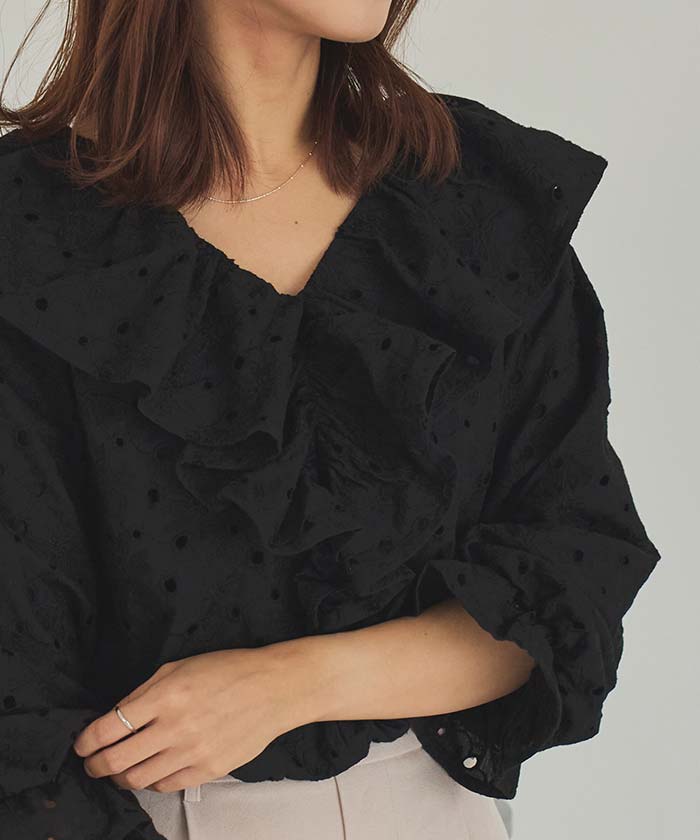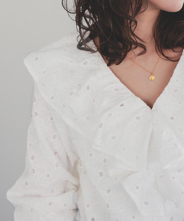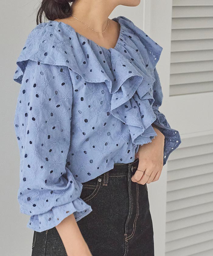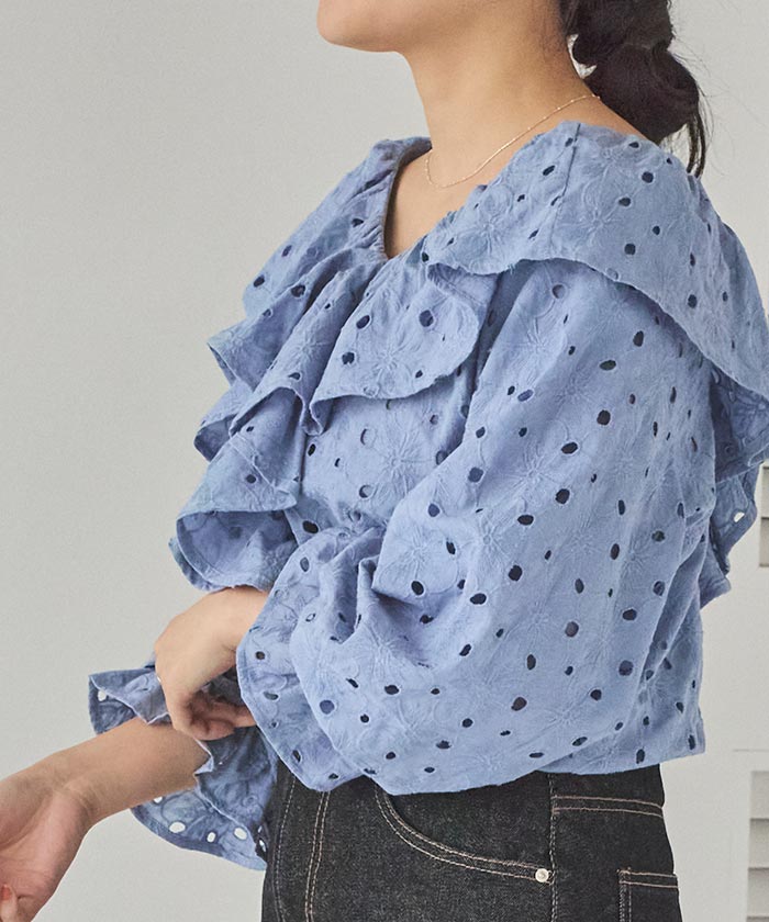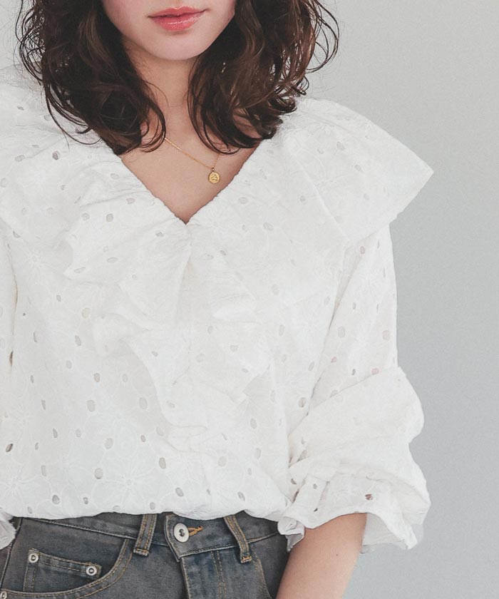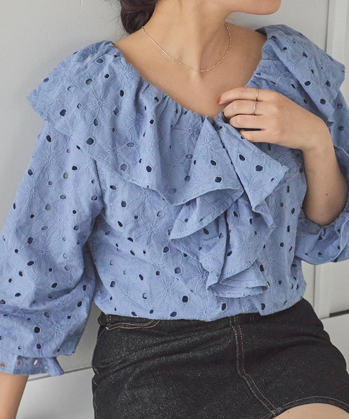 【店内全品20%offクーポン】2/23 1:59まで■ コットンレースフリルブラウス トップス レディース ブラウス レース フリル 花柄 Vネック 五分袖 七分袖 大人可愛い ギャザー トレンド