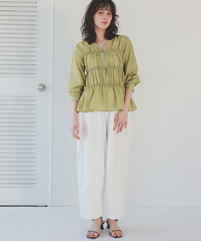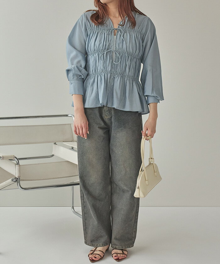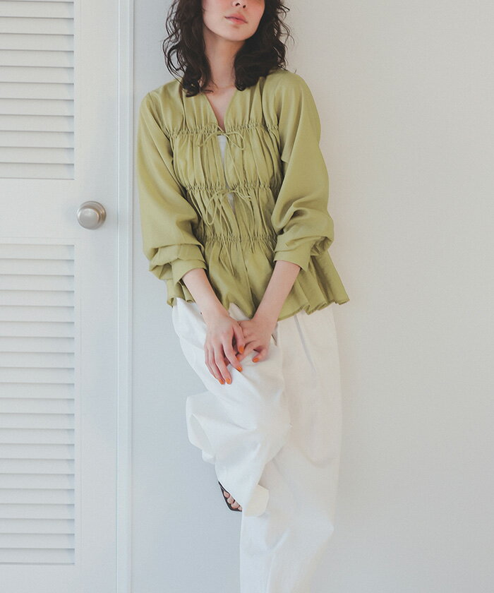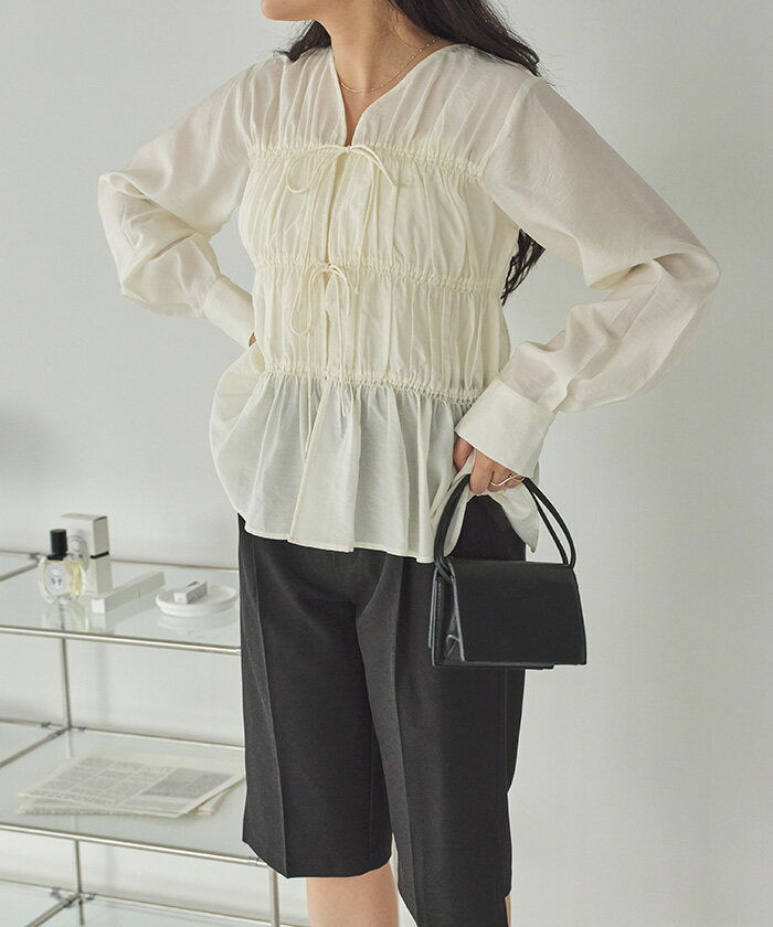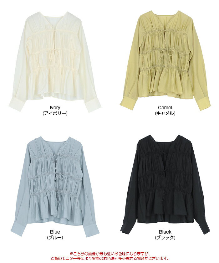 【店内全品20%offクーポン】2/23 1:59まで■ シャーリングギャザーリボンブラウス トップス レディース シャツ ブラウス リボン シャーリング 大人可愛い 羽織り ギャザー気映え トレンド