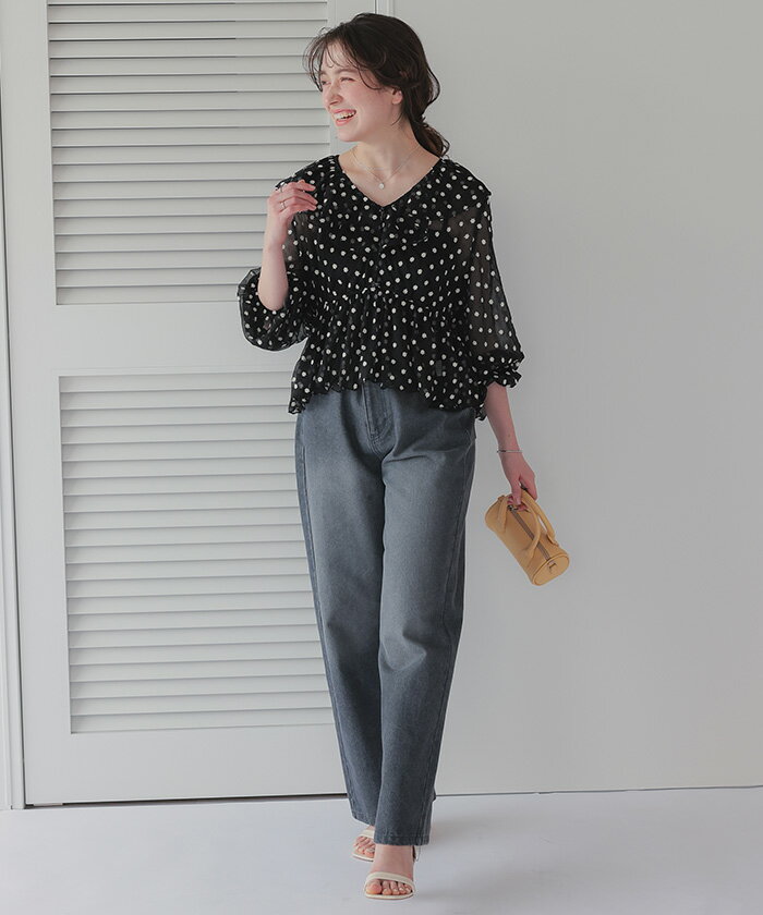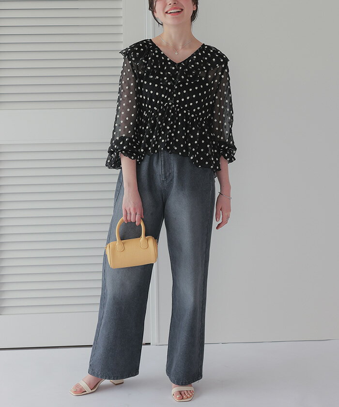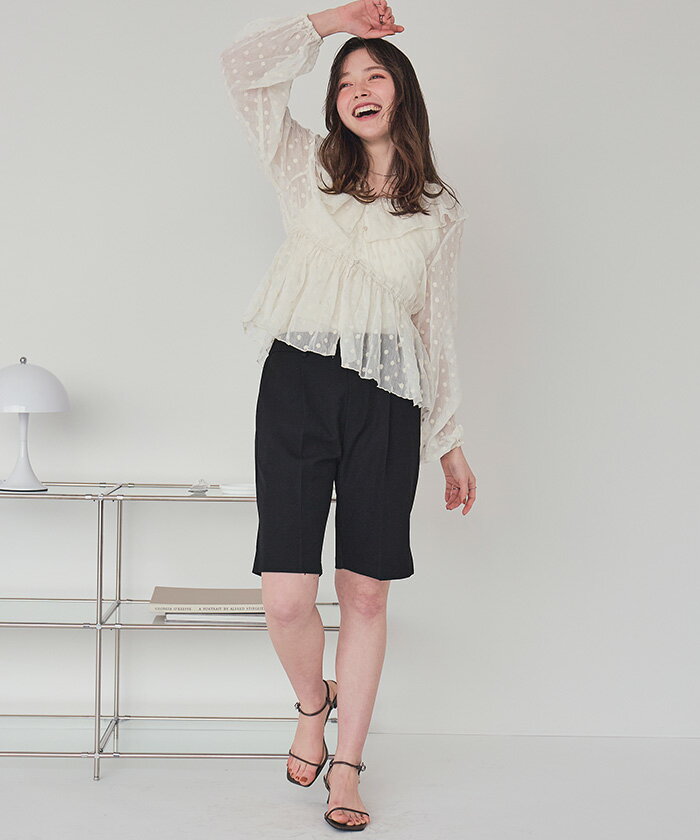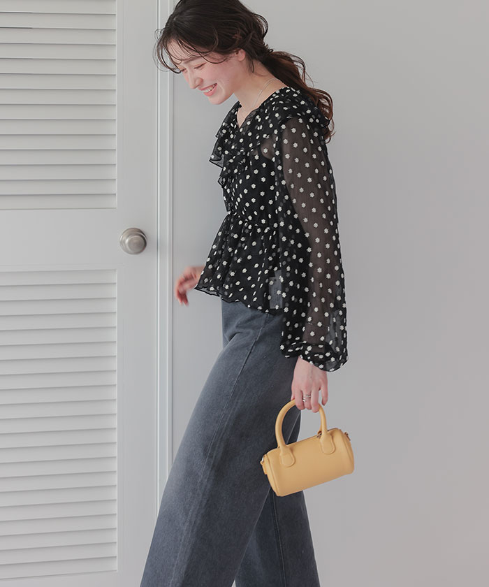 【20%offクーポン発行】4/10 1:59まで■フラワー刺繍フリルブラウス トップス レディース ブラウス シャツ フラワー 刺繍 花柄 シアー 羽織り レイヤード フリル ボリューム袖 Vネック'