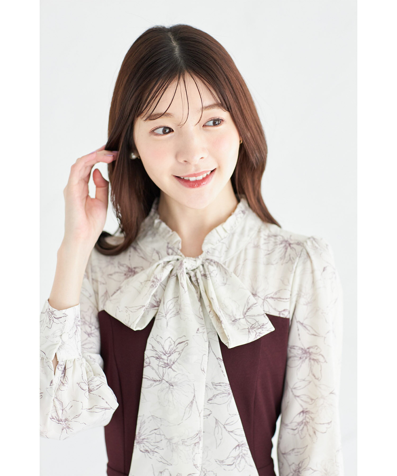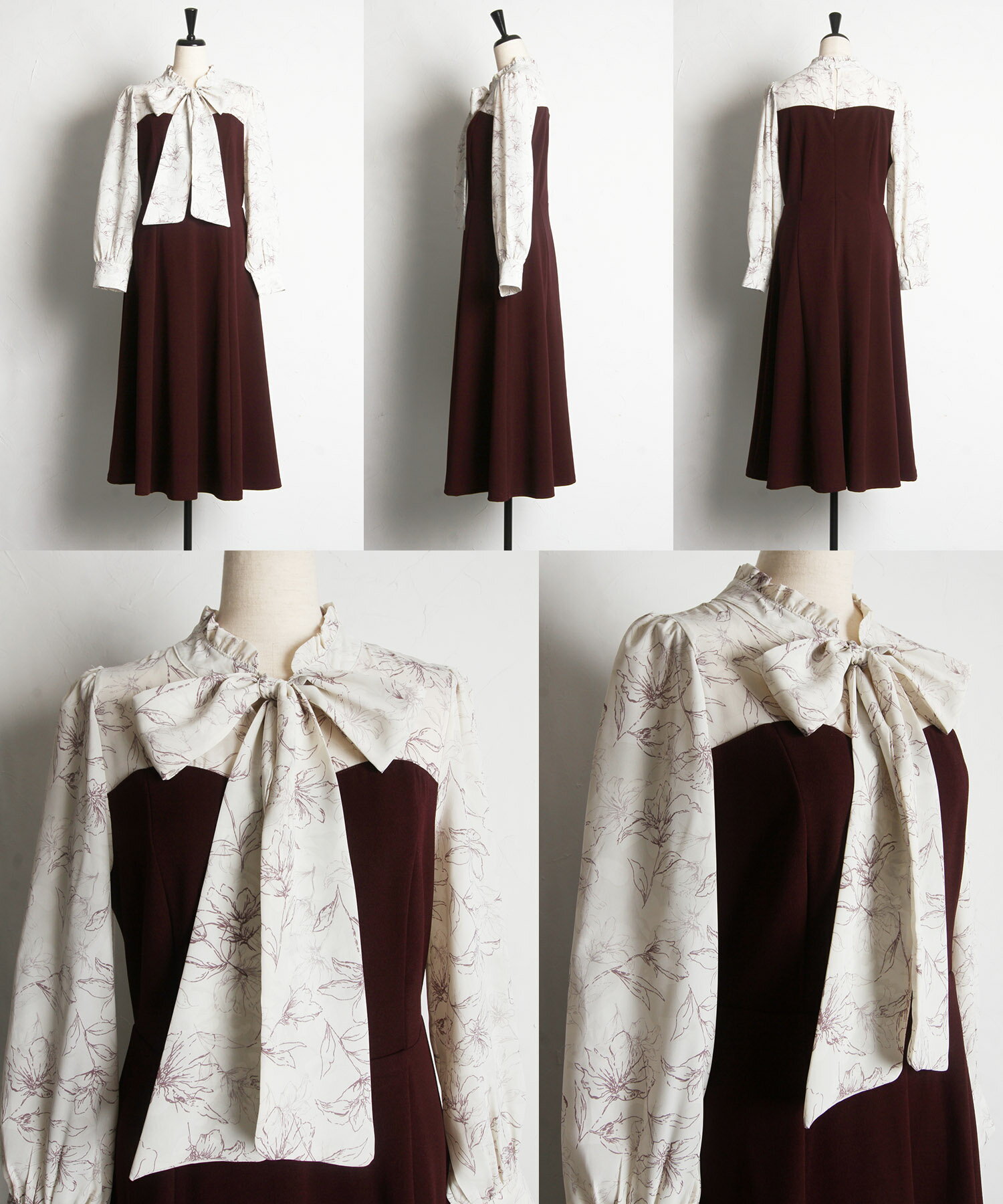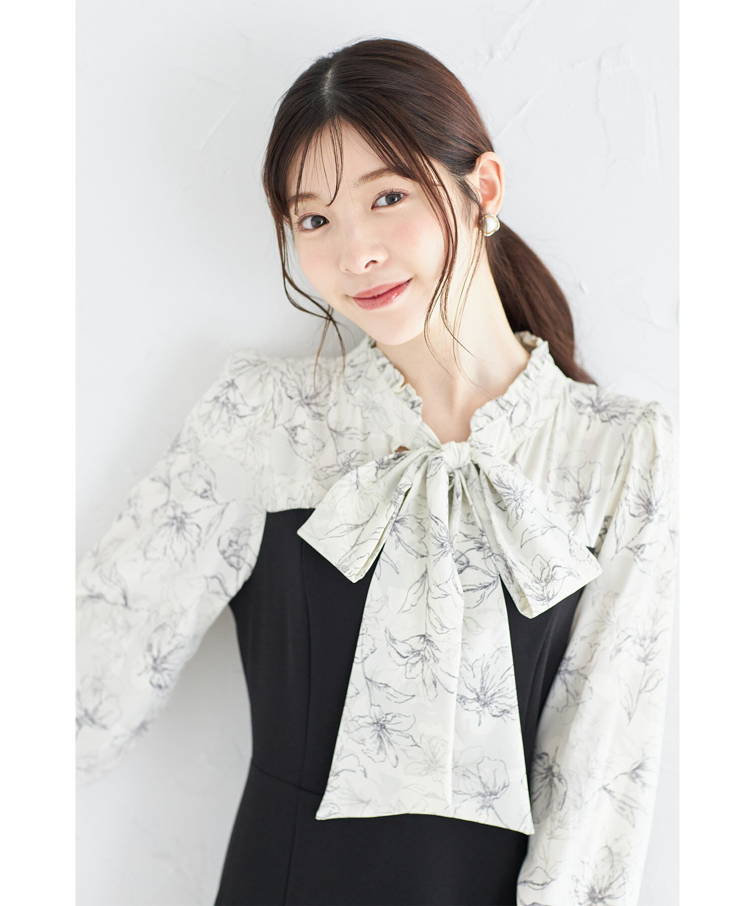 ボウタイリボンフラワープリントドッキングワンピース【jenive ジェニーヴ】tocco closet(トッコクローゼット) ※宇垣美里さんはバーガンディ着用 バーガンディ ブラック 商品番号:186-179495