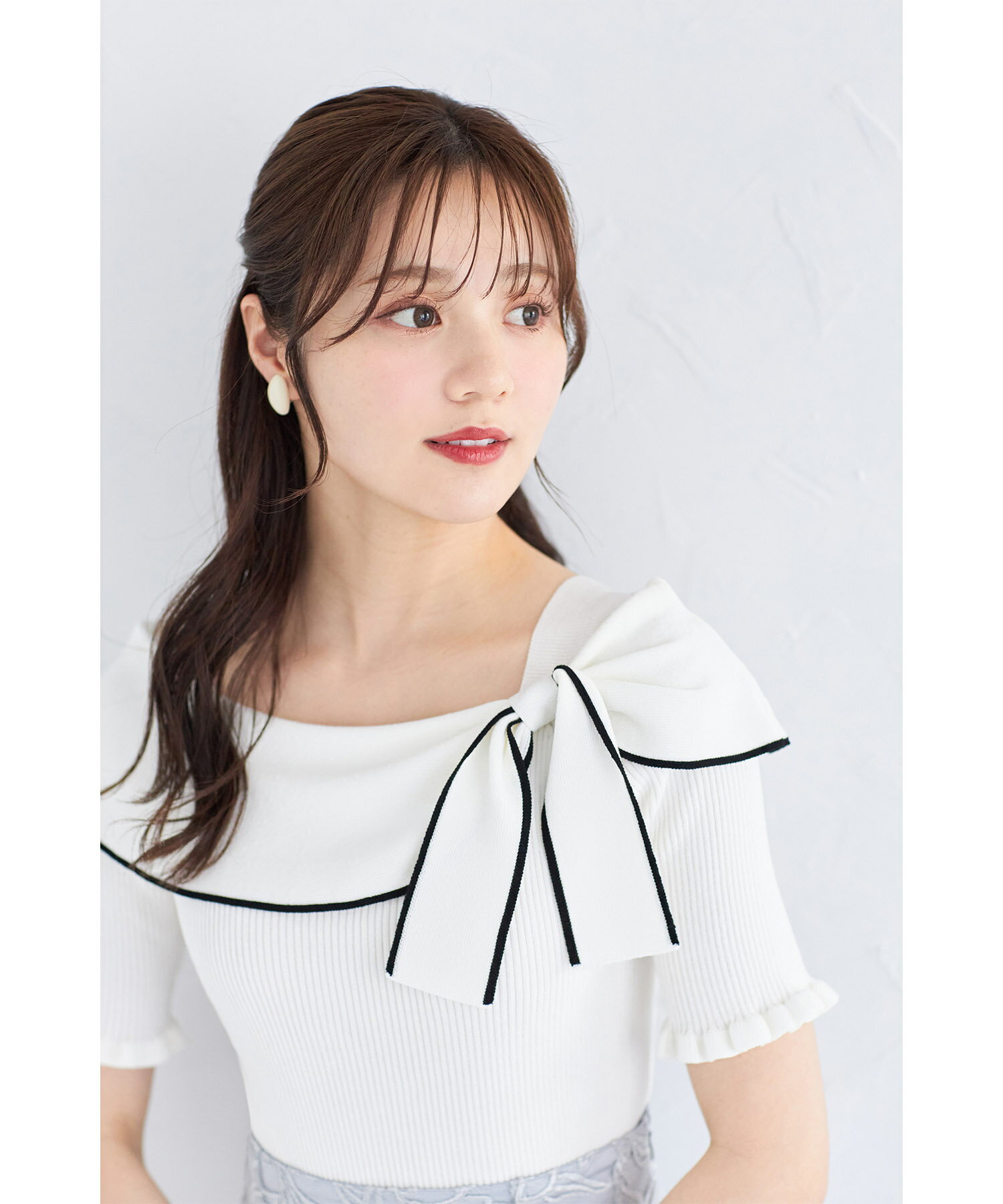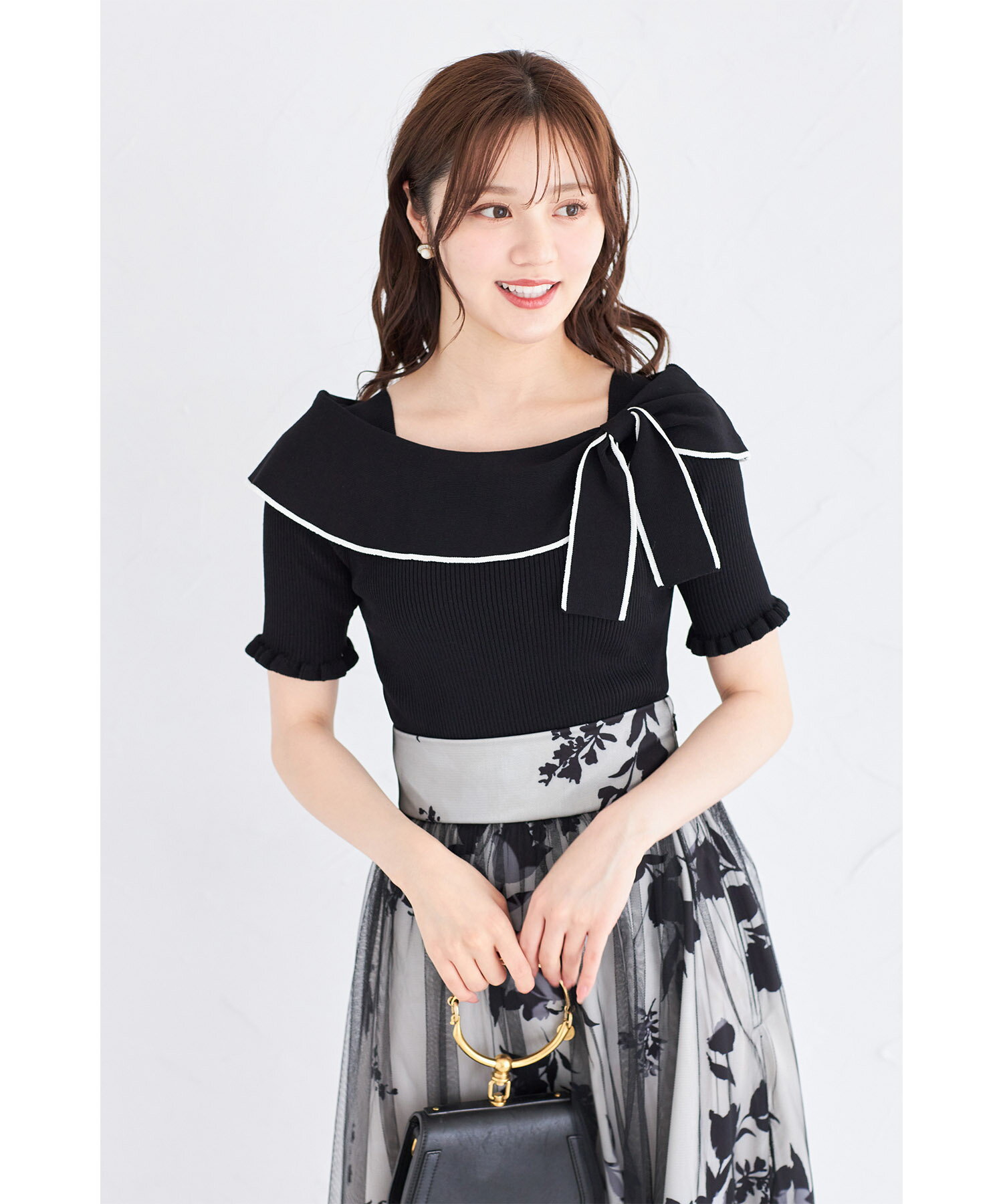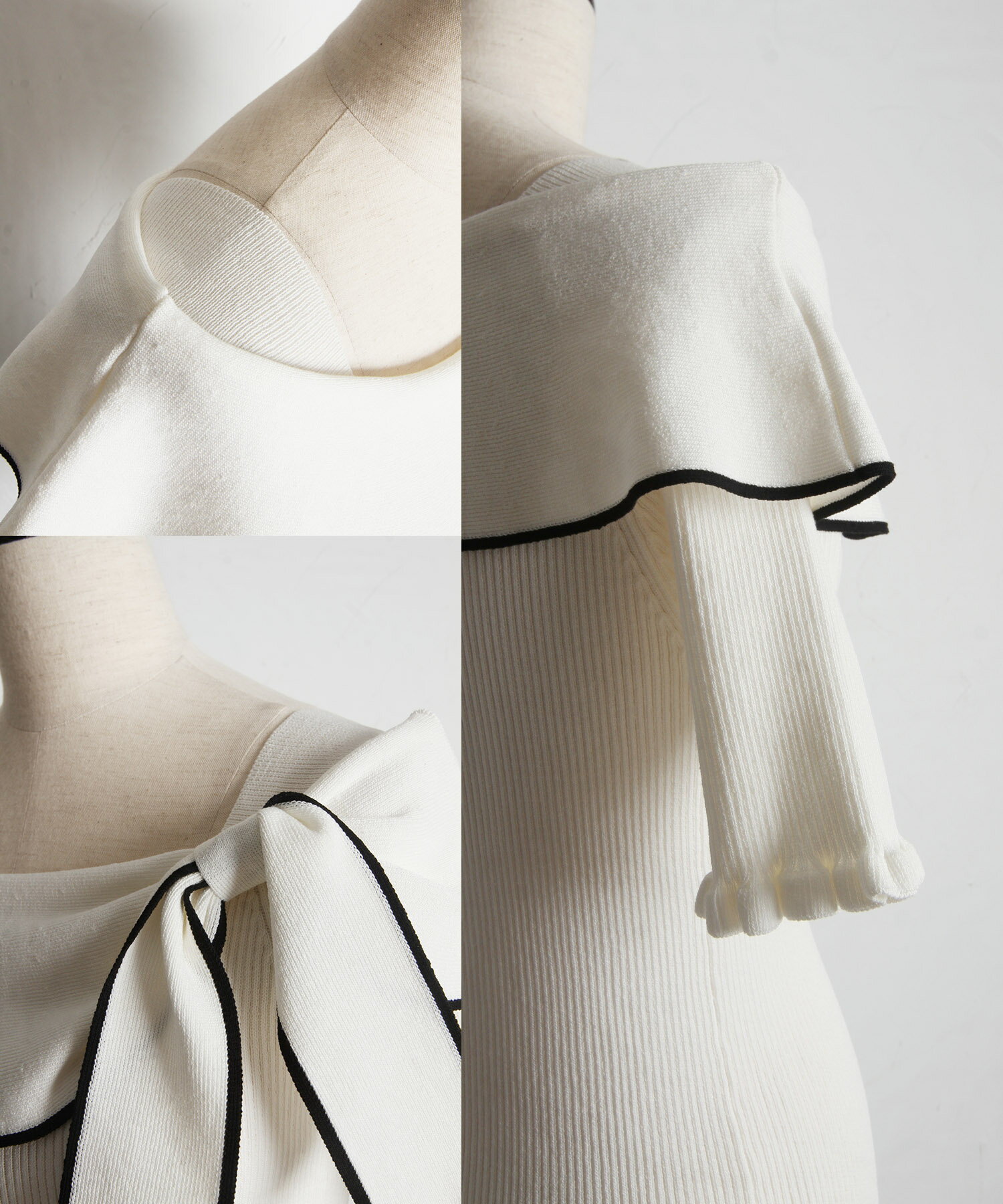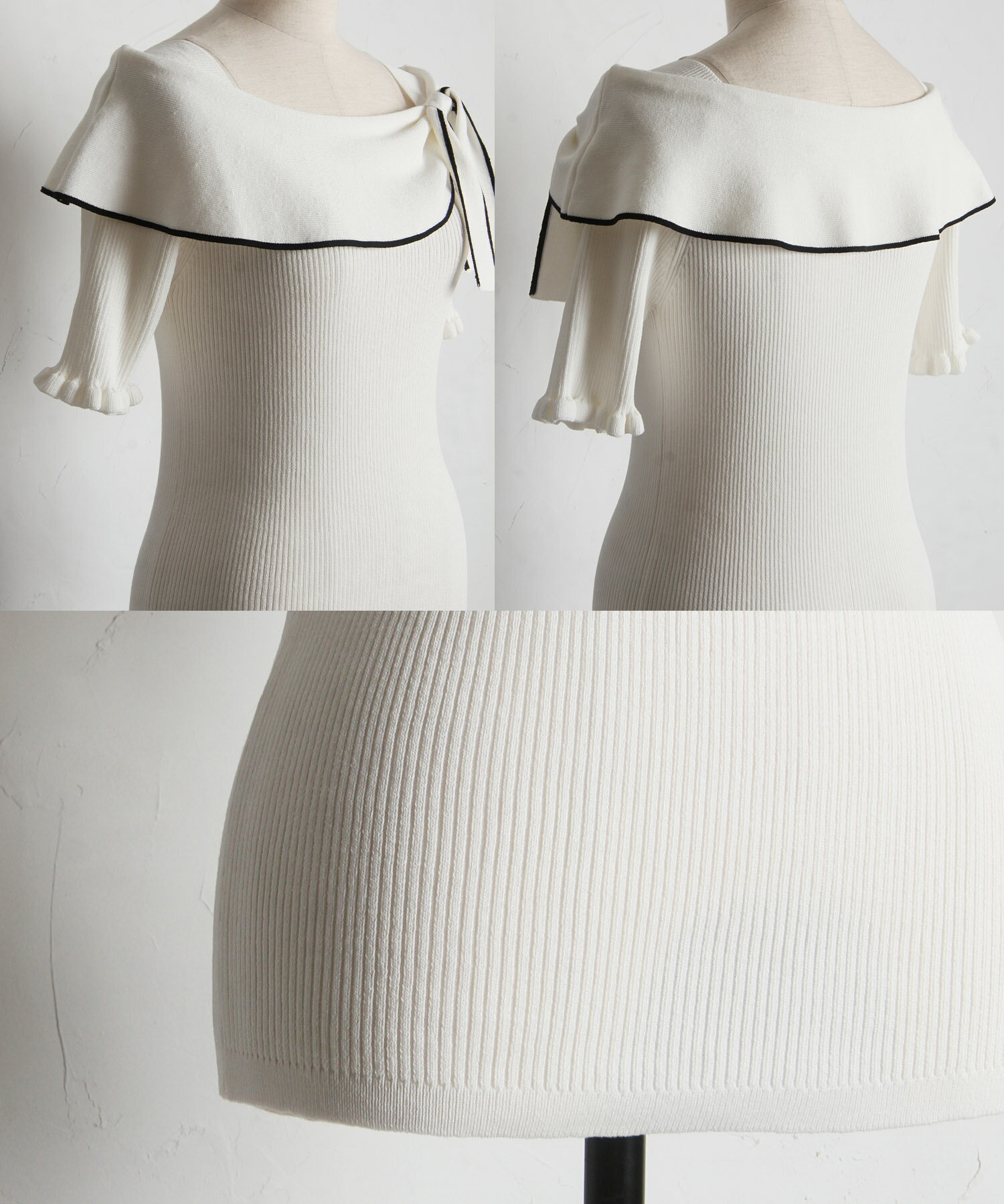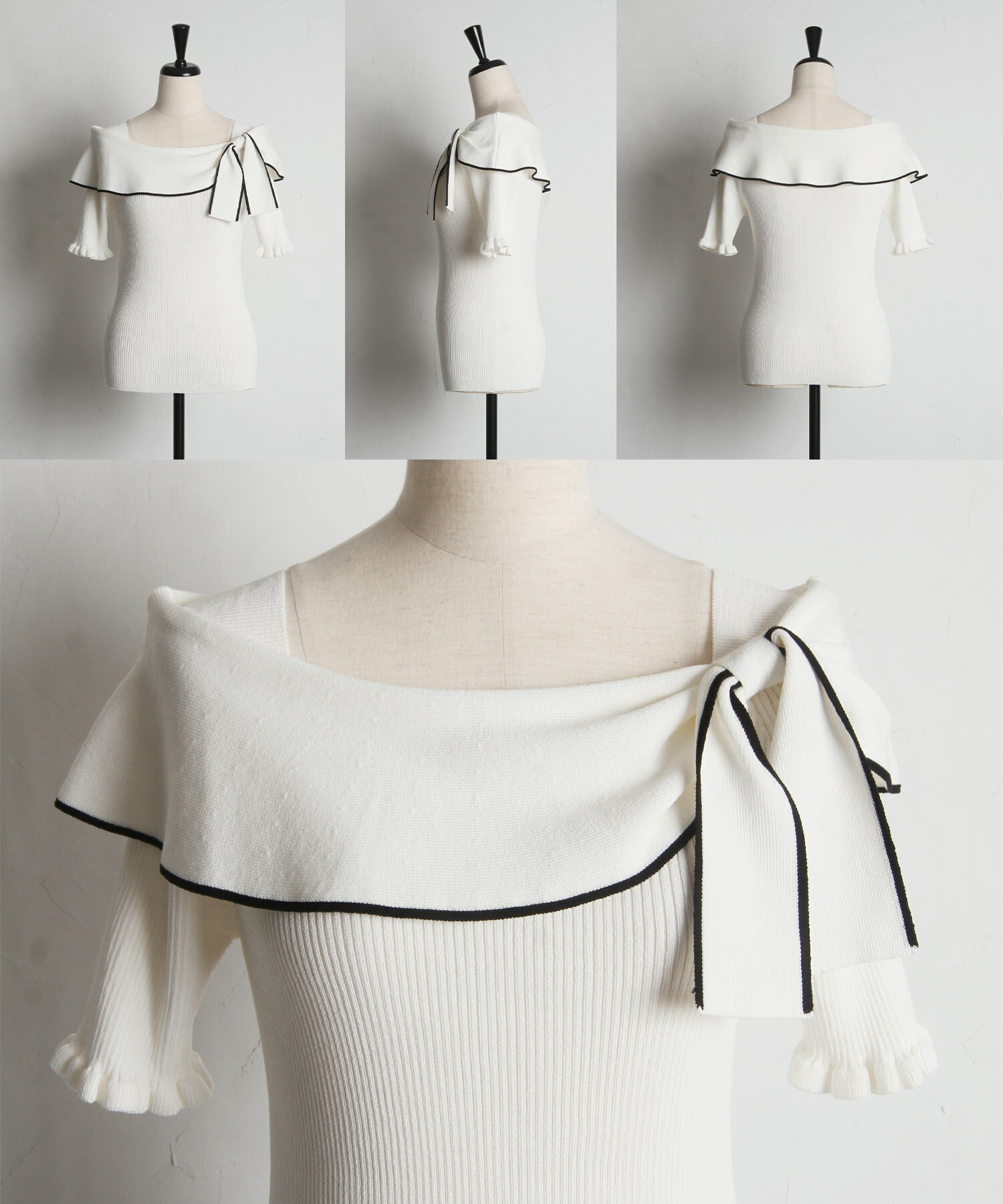 リボン付き配色ライン入りオフショルリブニットプルオーバー【joresy ジョレシー】tocco closet(トッコクローゼット) オフホワイト ブラック アイスグレー 商品番号:186-185180