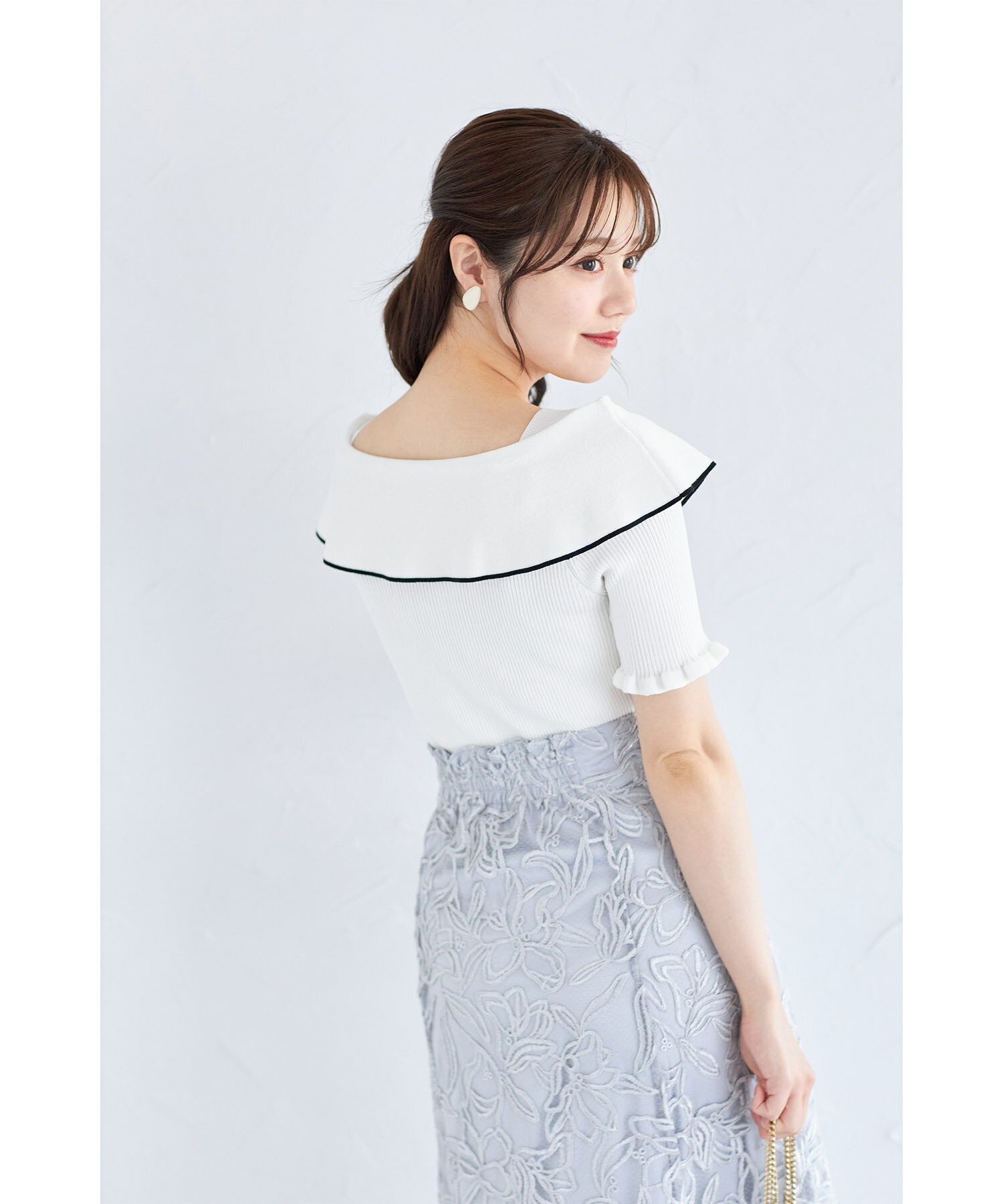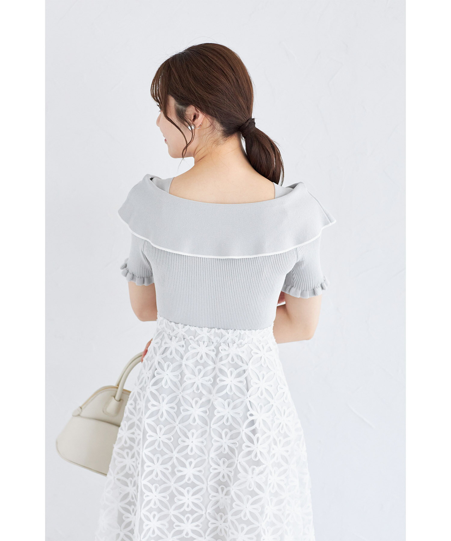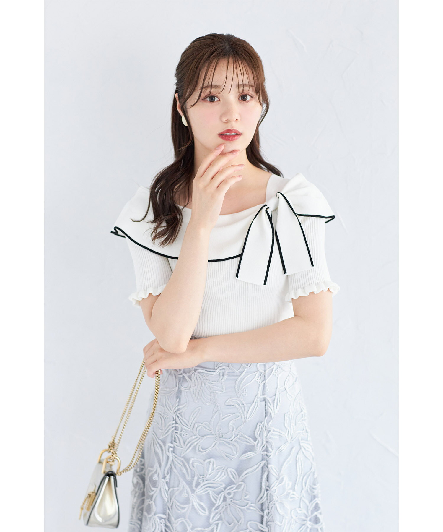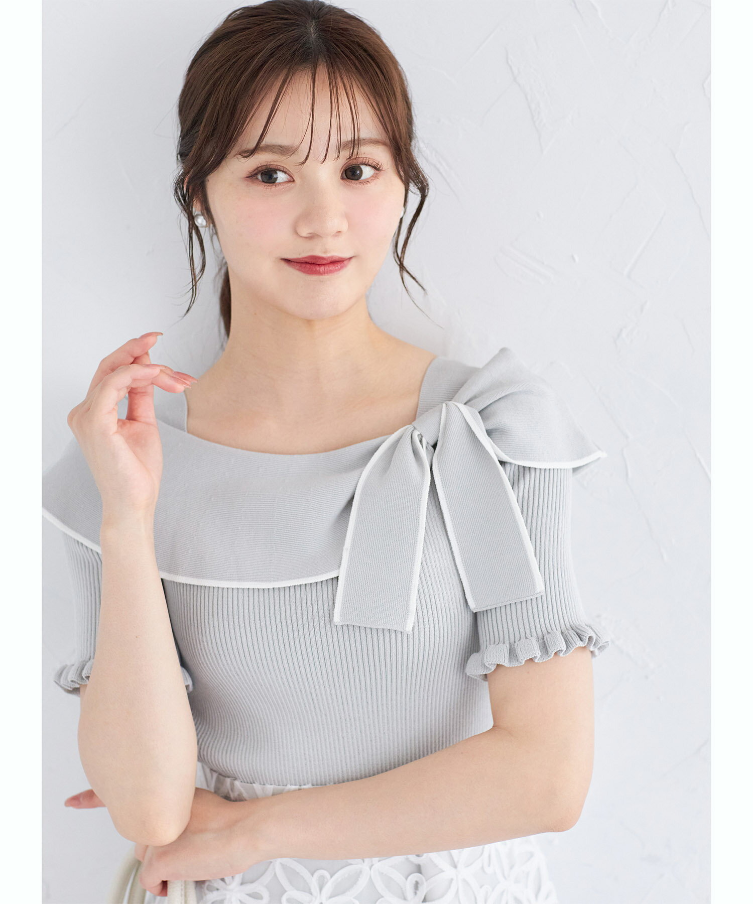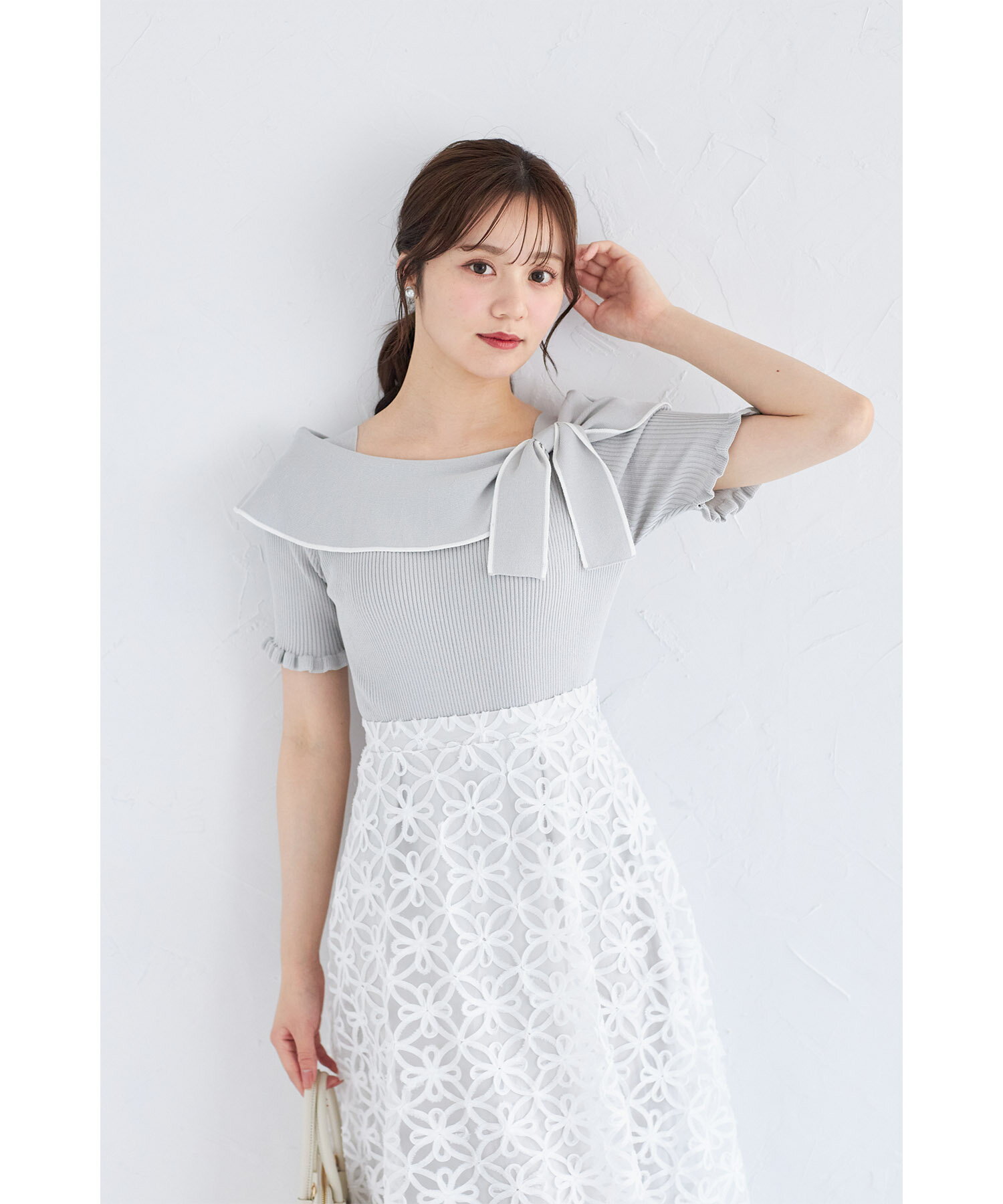 リボン付き配色ライン入りオフショルリブニットプルオーバー【joresy ジョレシー】tocco closet(トッコクローゼット) オフホワイト ブラック アイスグレー 商品番号:186-185180