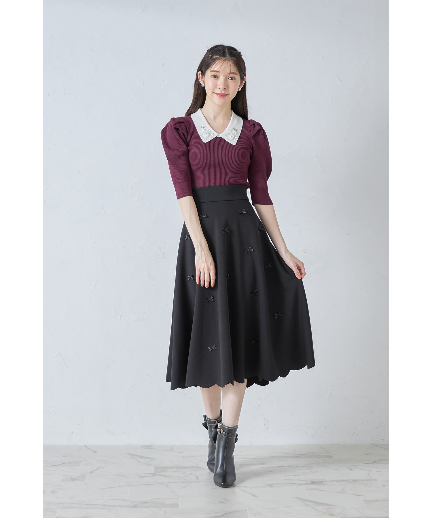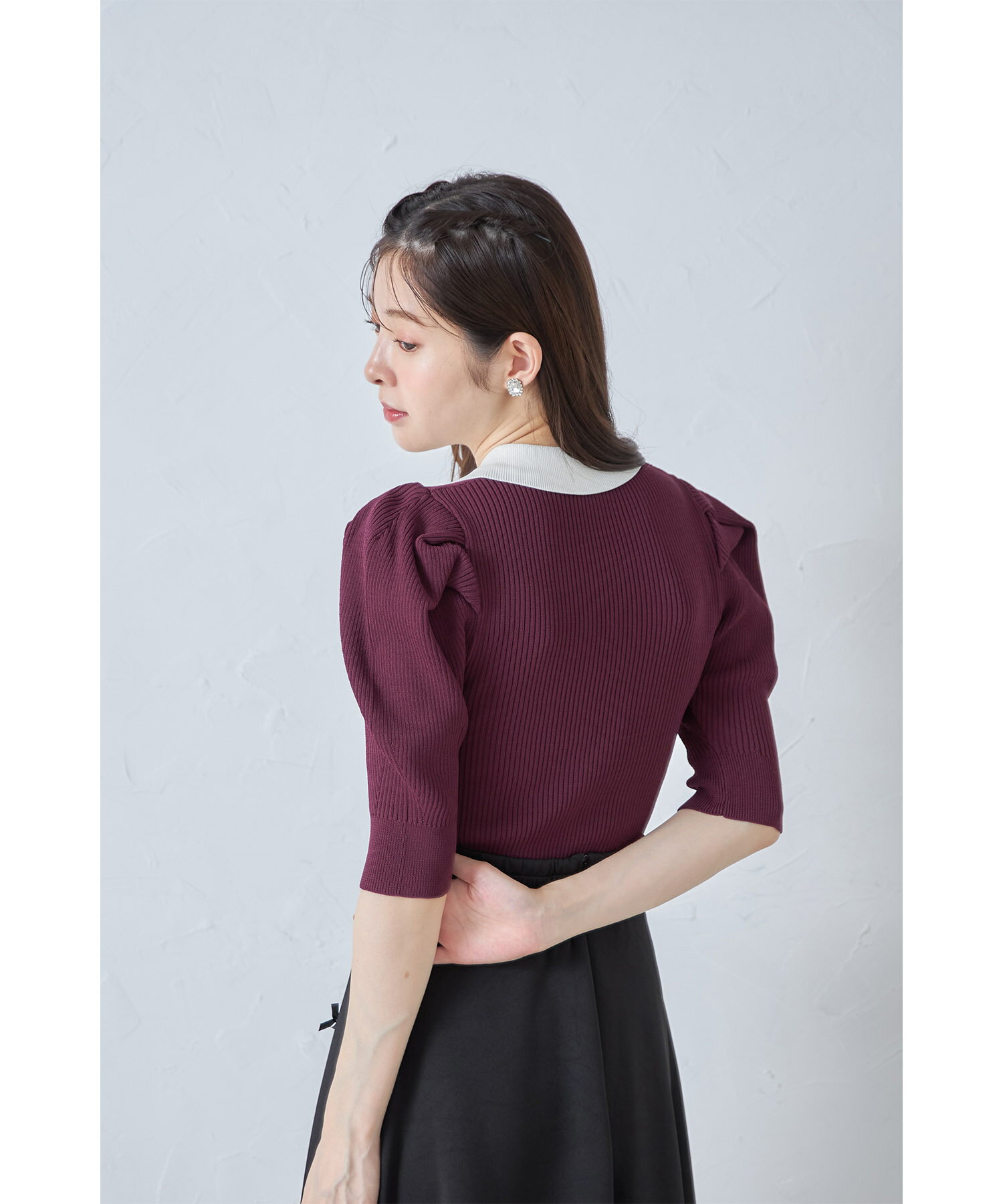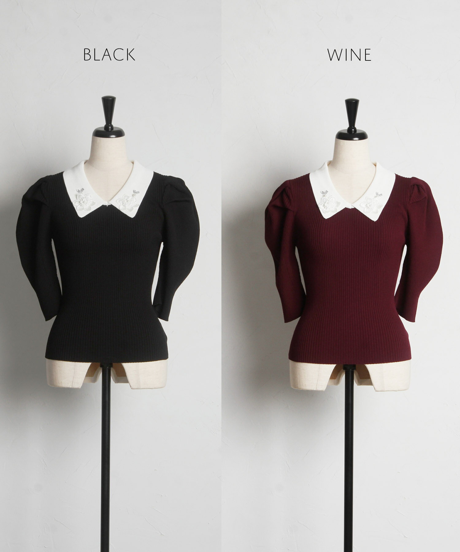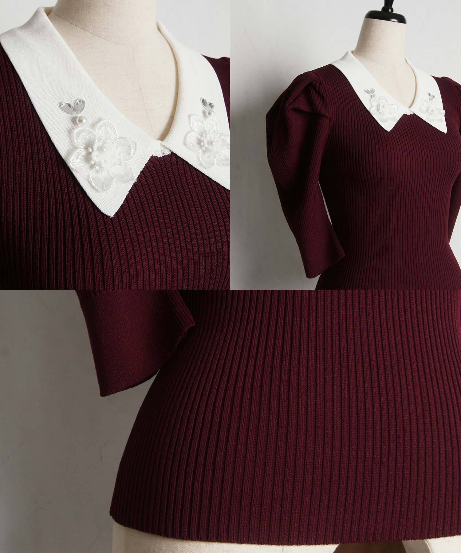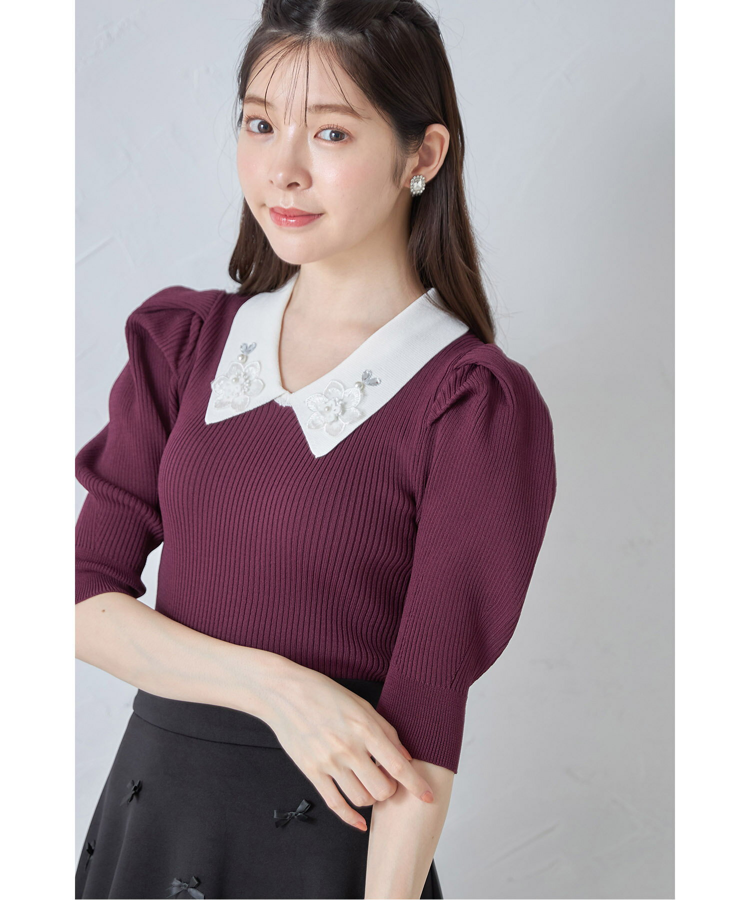 立体フラワーモチーフ襟付きリブニットプルオーバー【erbury エバリー】tocco closet(トッコクローゼット) ※紺野彩夏さんはブラック着用 ブラック ワインレッド 商品番号:186-188717