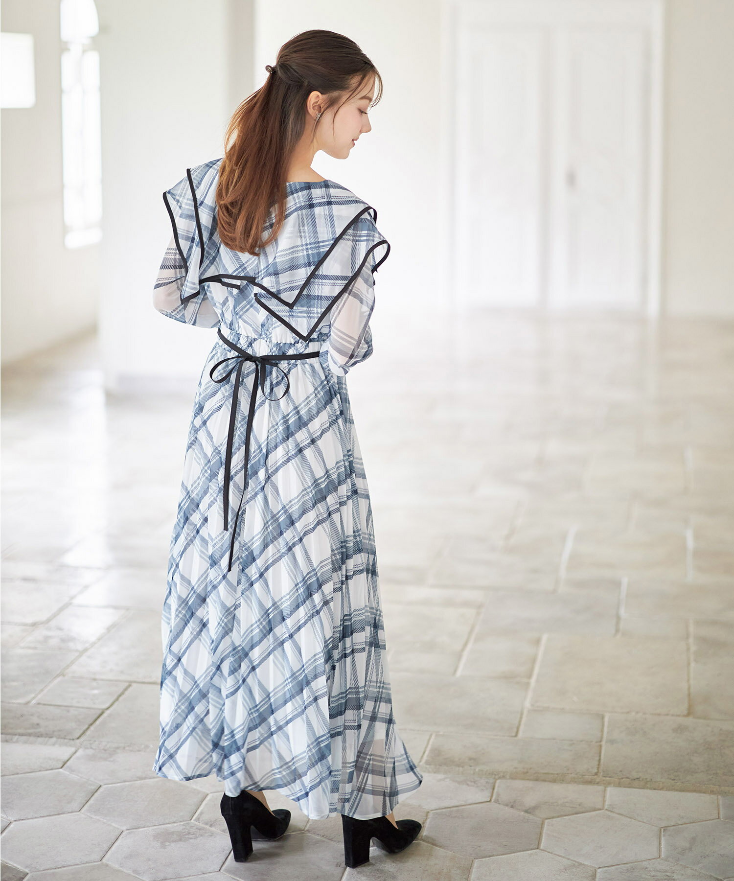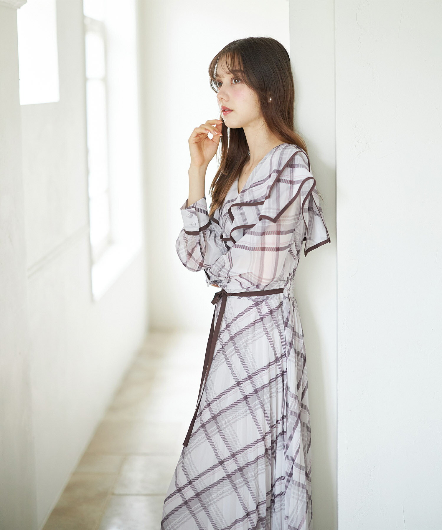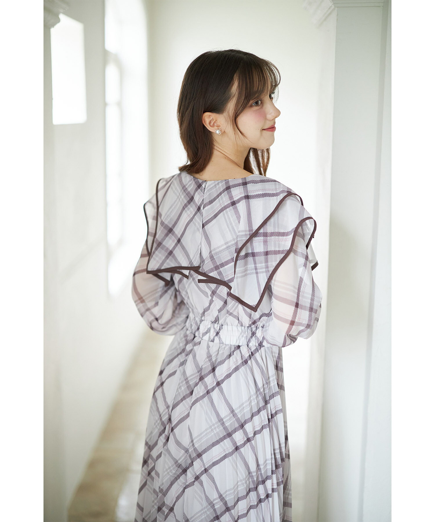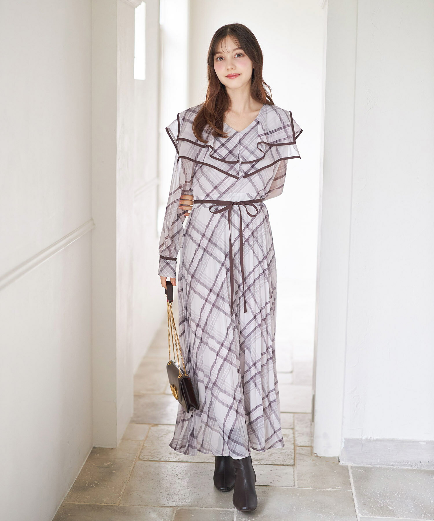 ウエストリボン付きビックカラーチェックプリーツワンピース【sarcella サセラ】tocco closet(トッコクローゼット) グレイッシュピンク ブラック 商品番号:186-191684