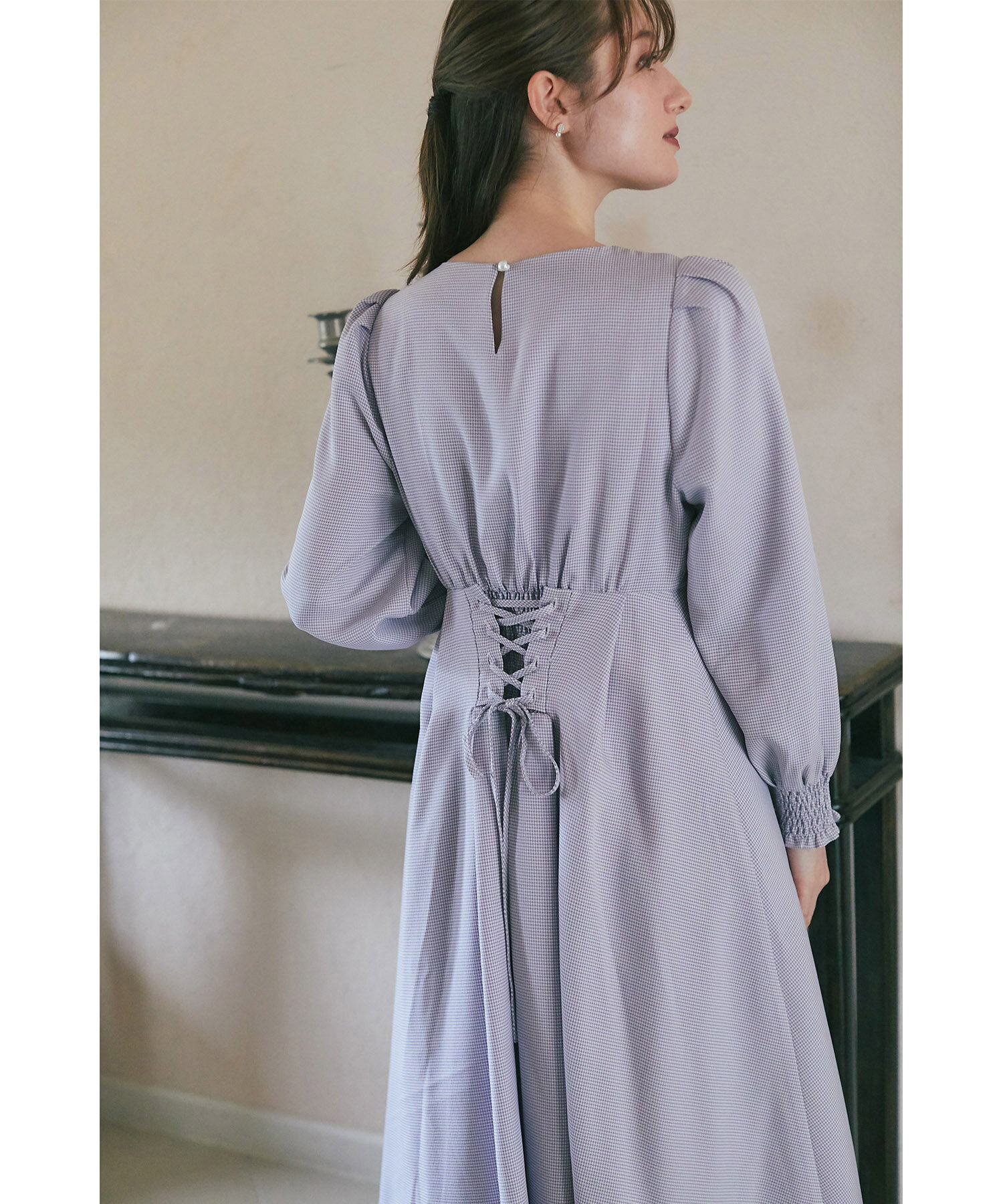 リボン&パール付きバックレースアップ千鳥柄ワンピース【acanthia アカンシア】tocco closet(トッコクローゼット) ラベンダー ブラウン 商品番号:186-192590