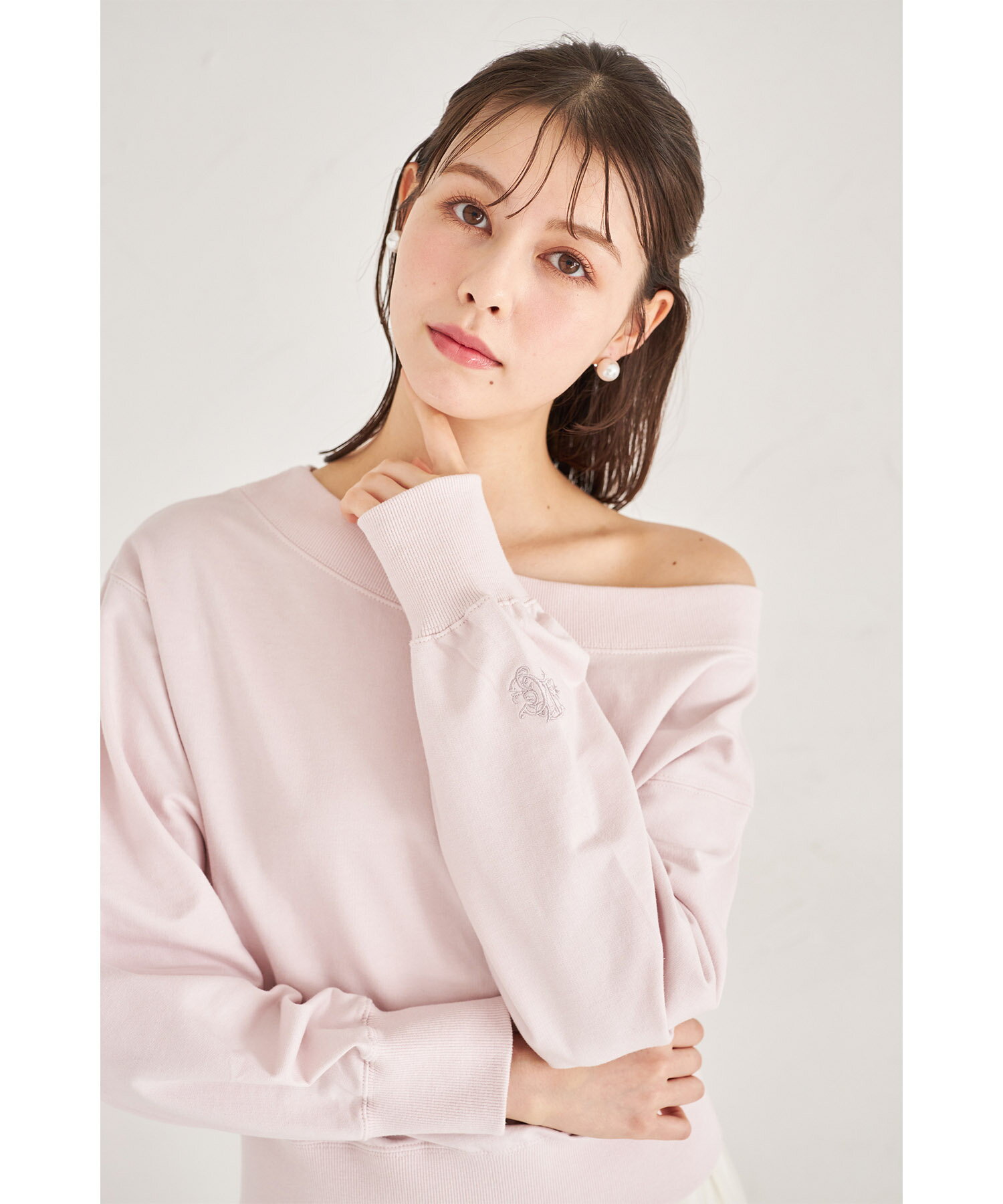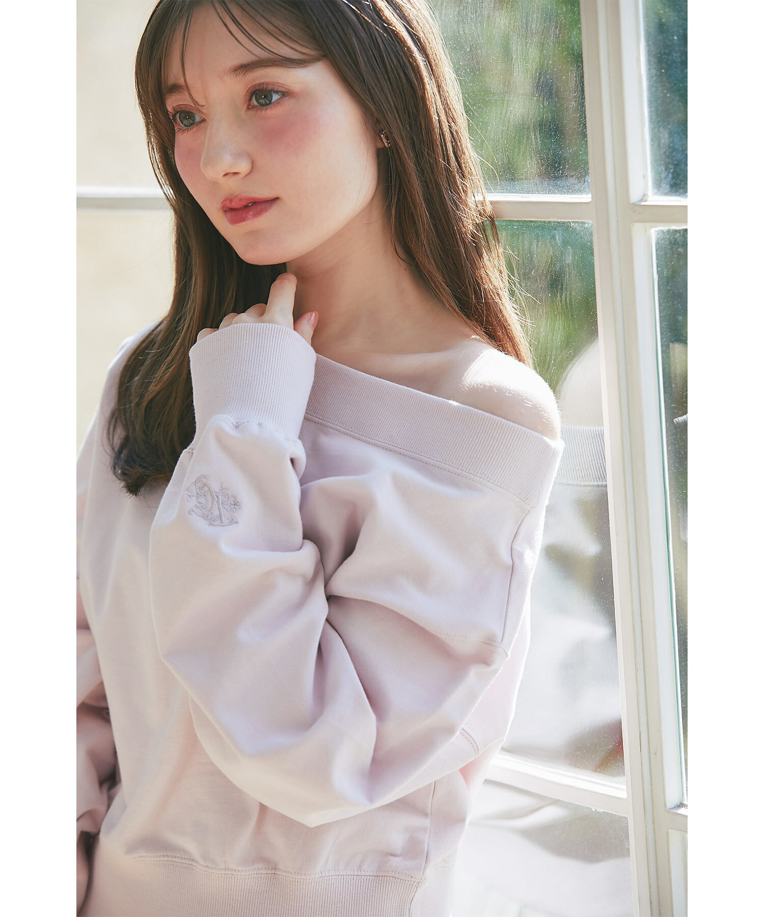 袖口ワンポイントロゴ刺繍入りオフショルダースウェット【sylveria シルヴェリア】tocco closet(トッコクローゼット)※八木アリサさんはグレイッシュピンク着用 グレイッシュピンク アイボリー 商品番号:186-192069