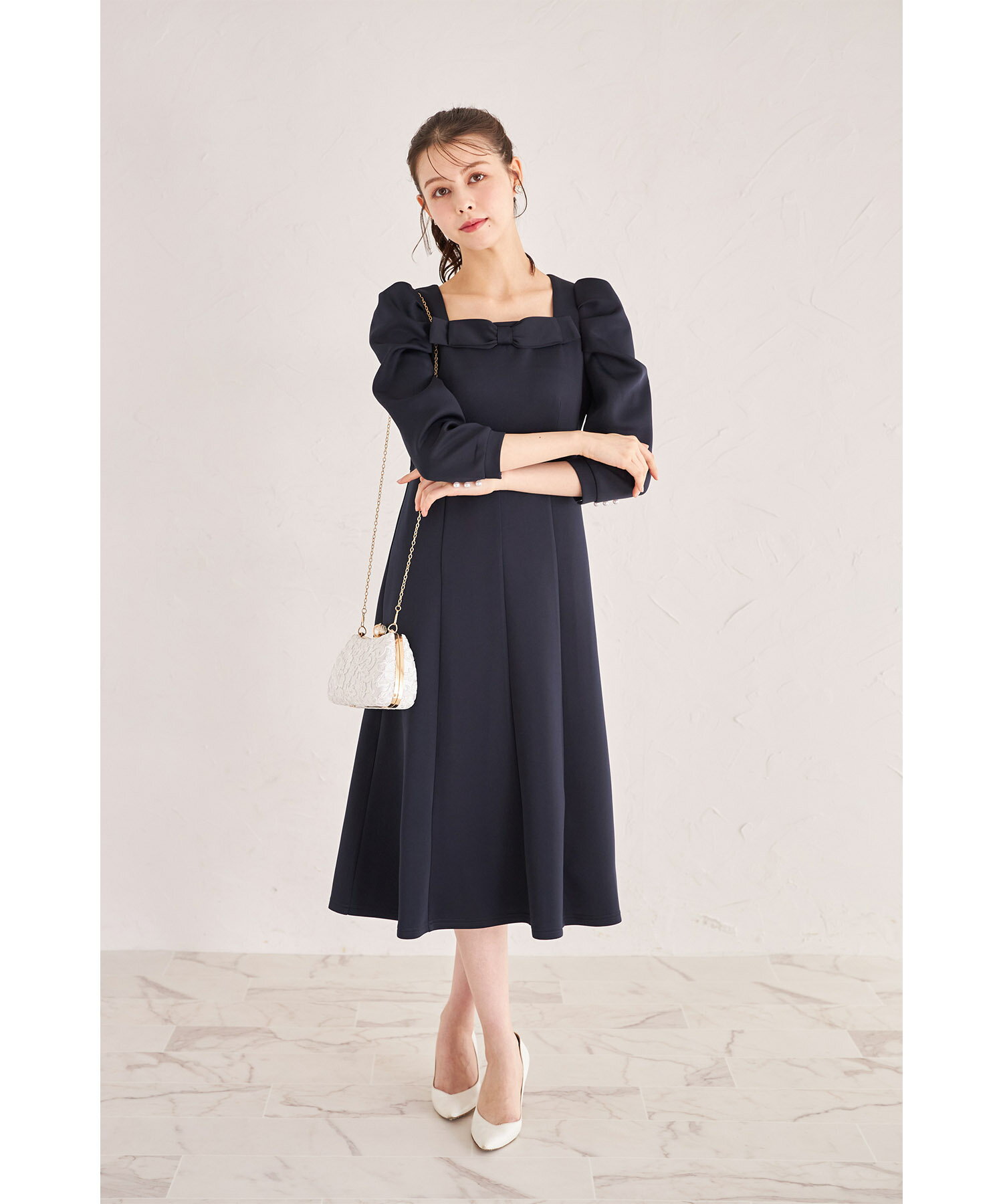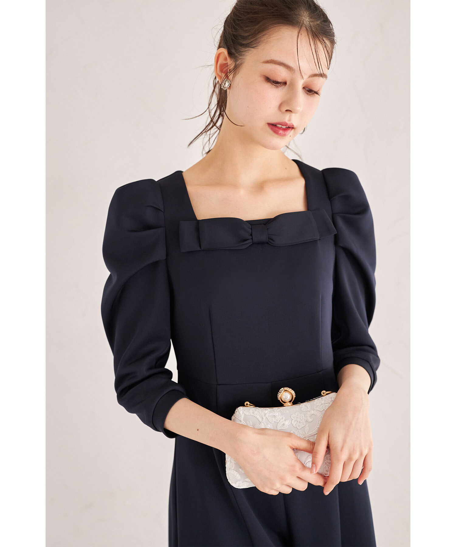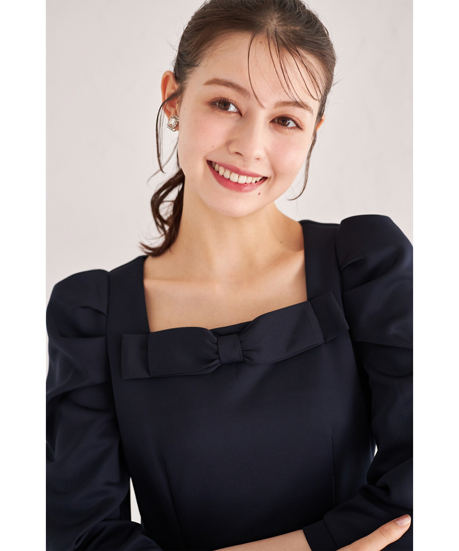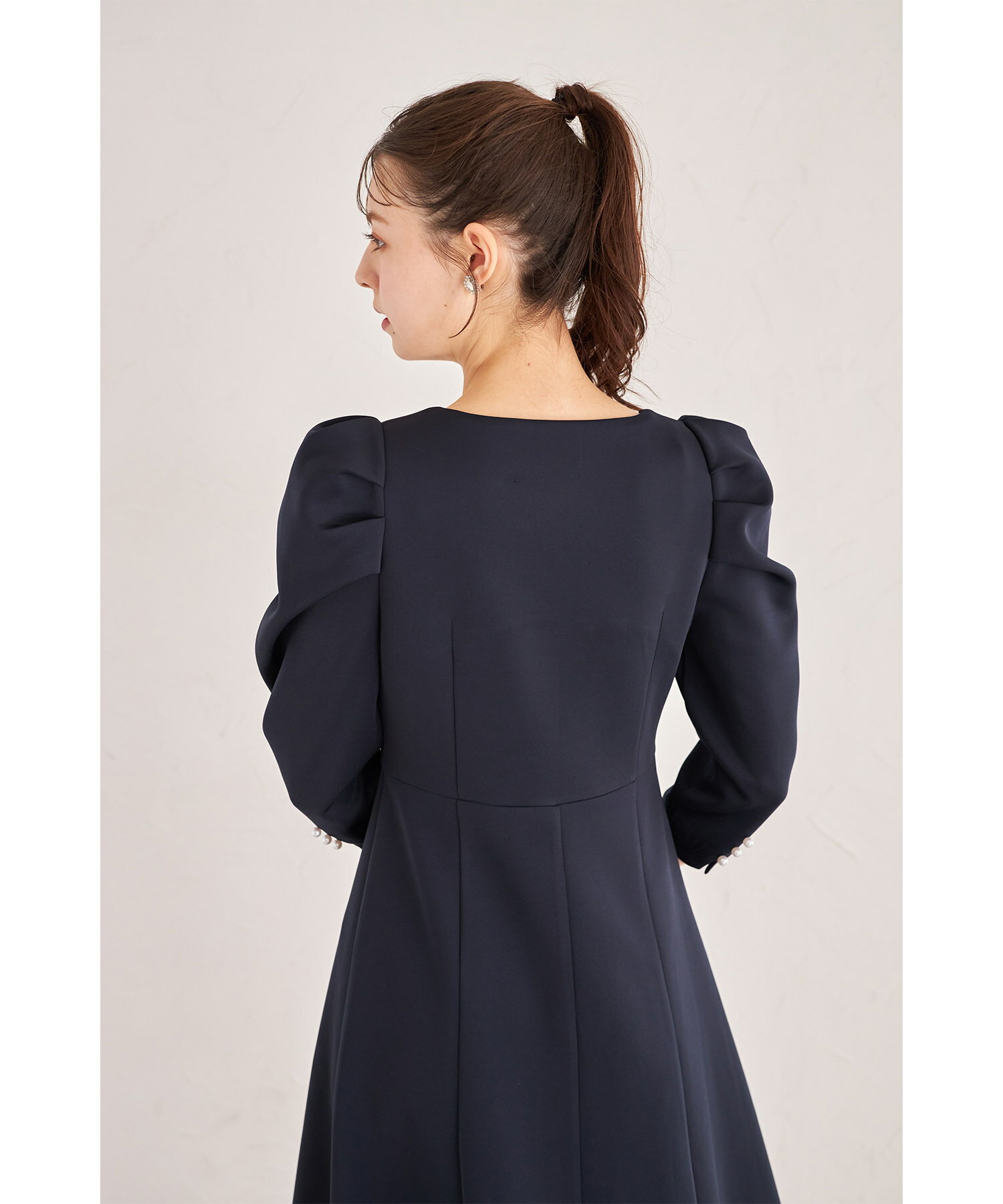 胸元リボン&袖口パール付きパワーショルダーフレアワンピース【cassiara カシアラ】tocco closet(トッコクローゼット) ネイビー アイボリー 商品番号:186-192463