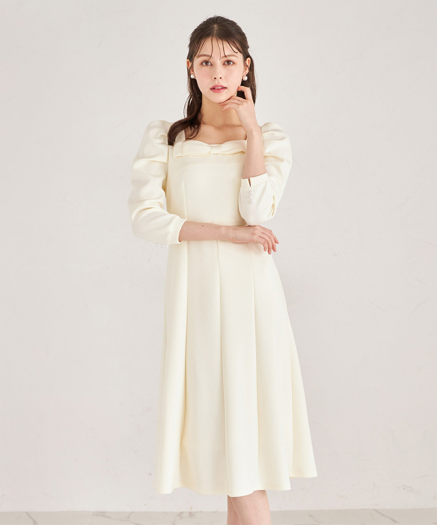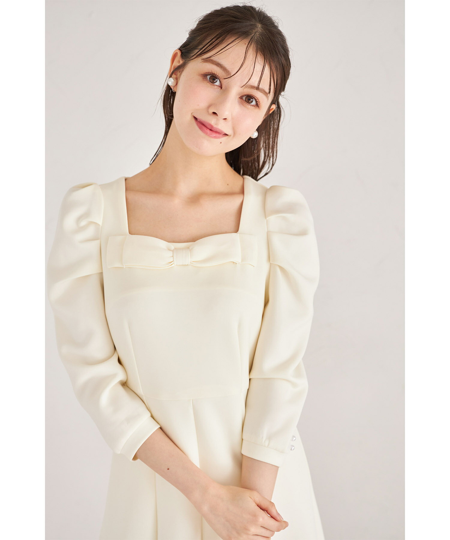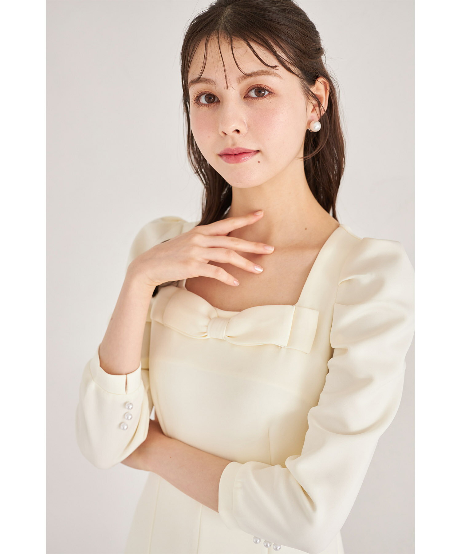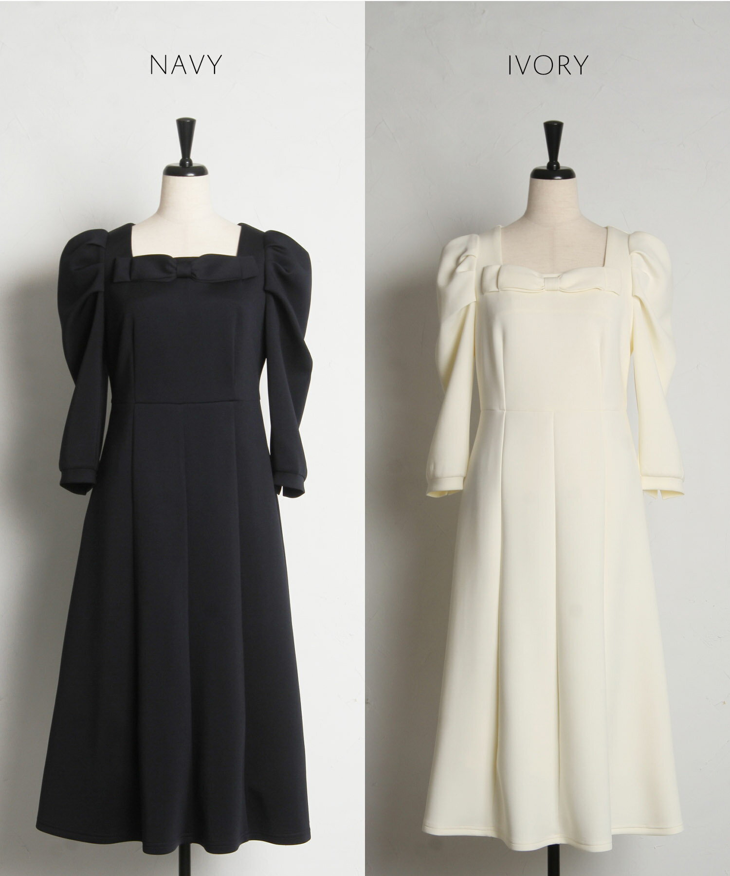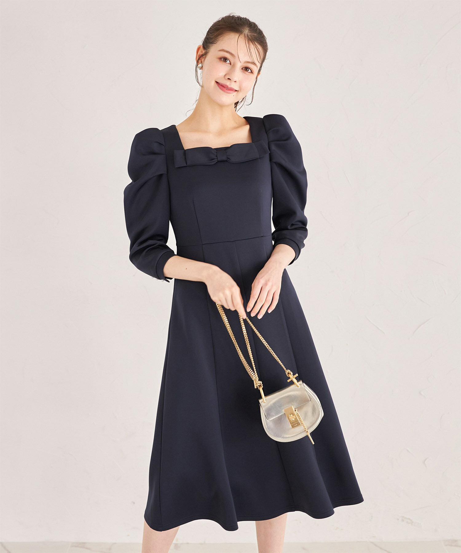 胸元リボン&袖口パール付きパワーショルダーフレアワンピース【cassiara カシアラ】tocco closet(トッコクローゼット) ネイビー アイボリー 商品番号:186-192463