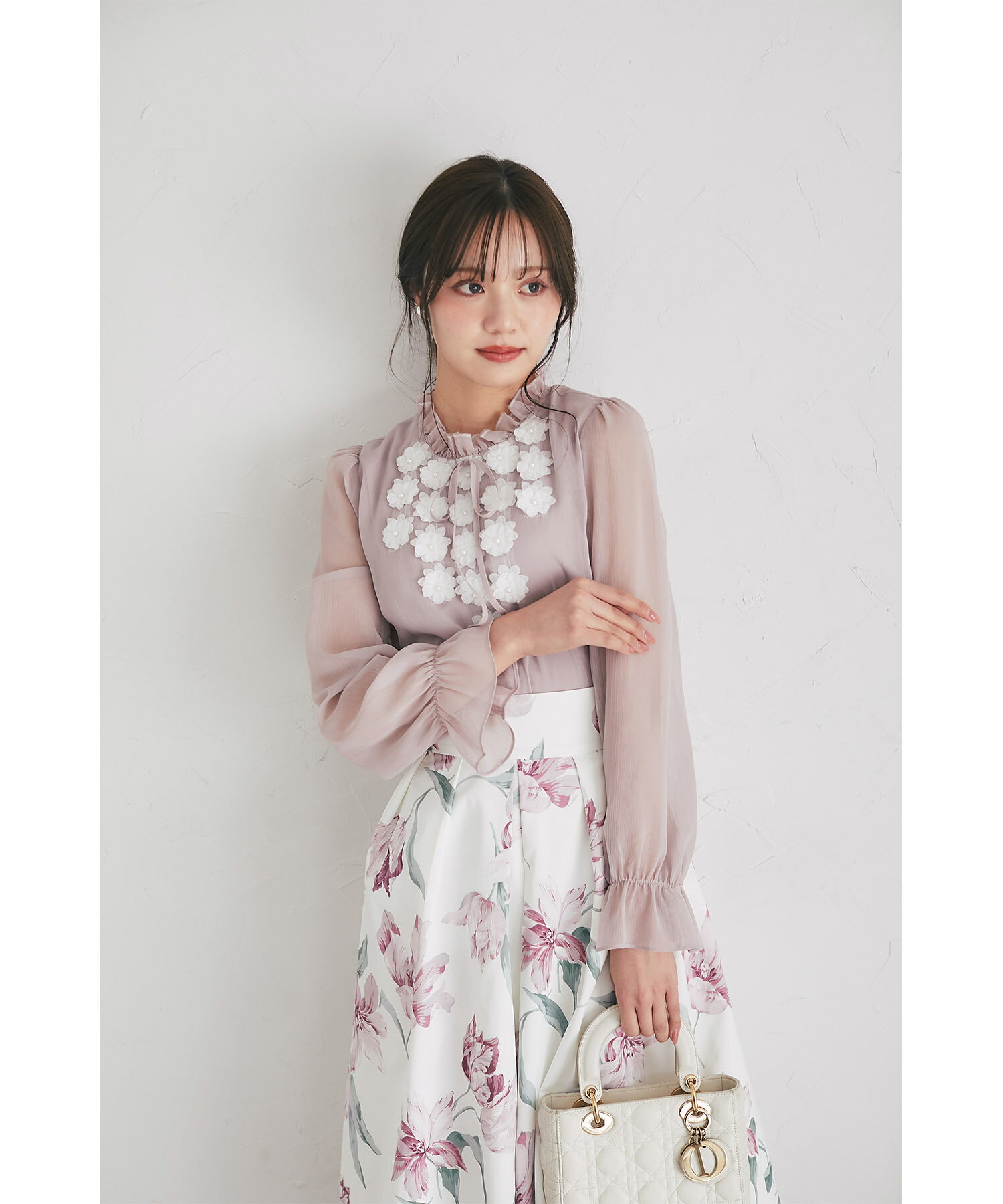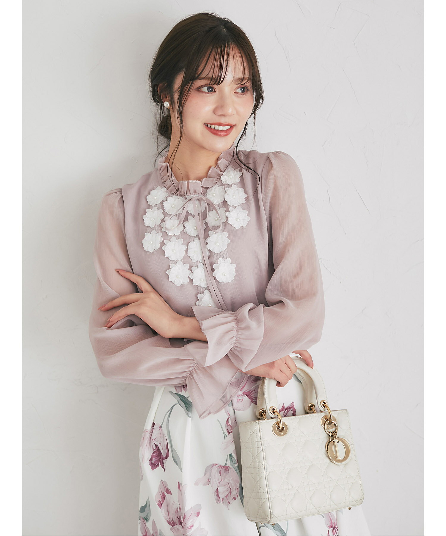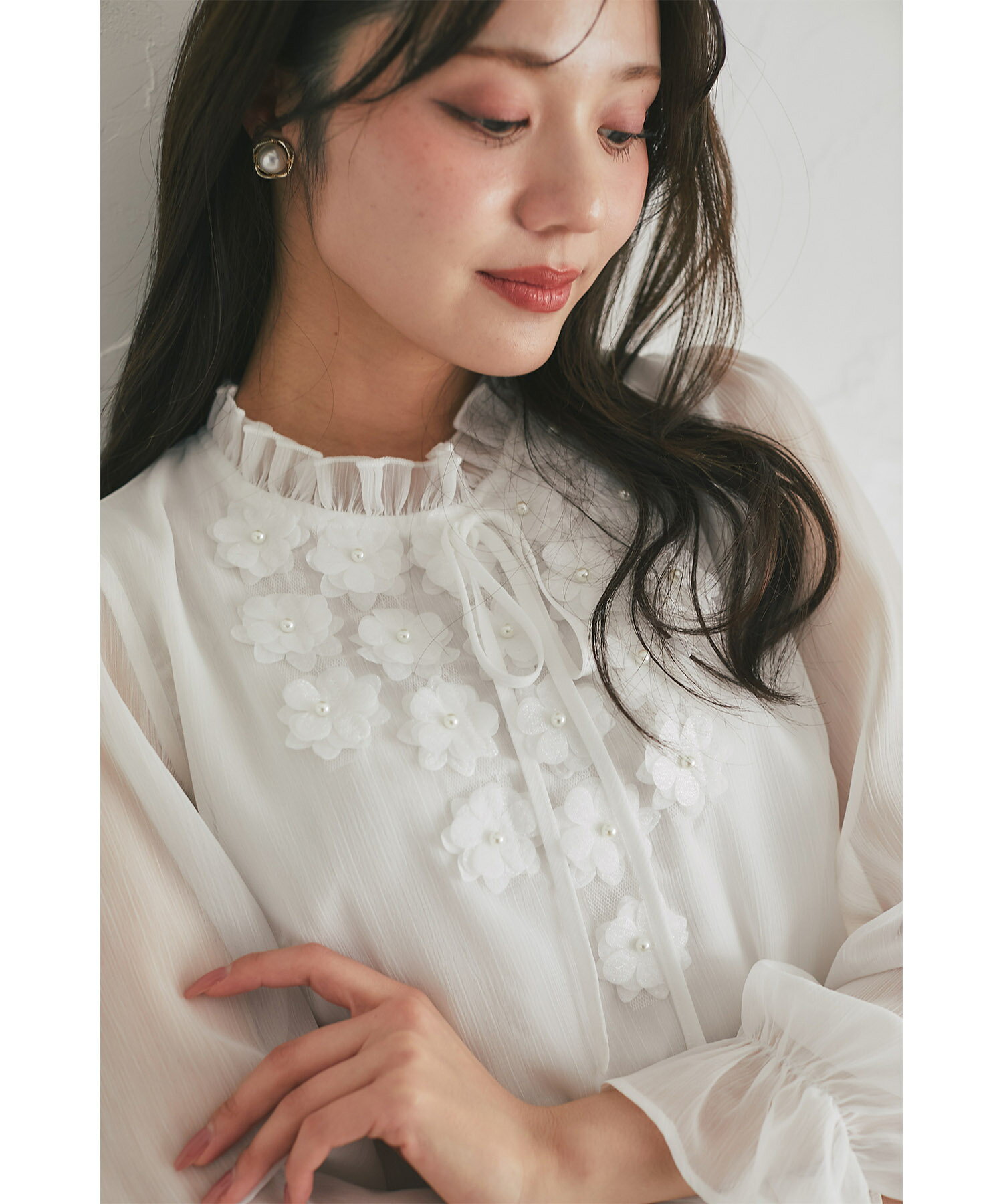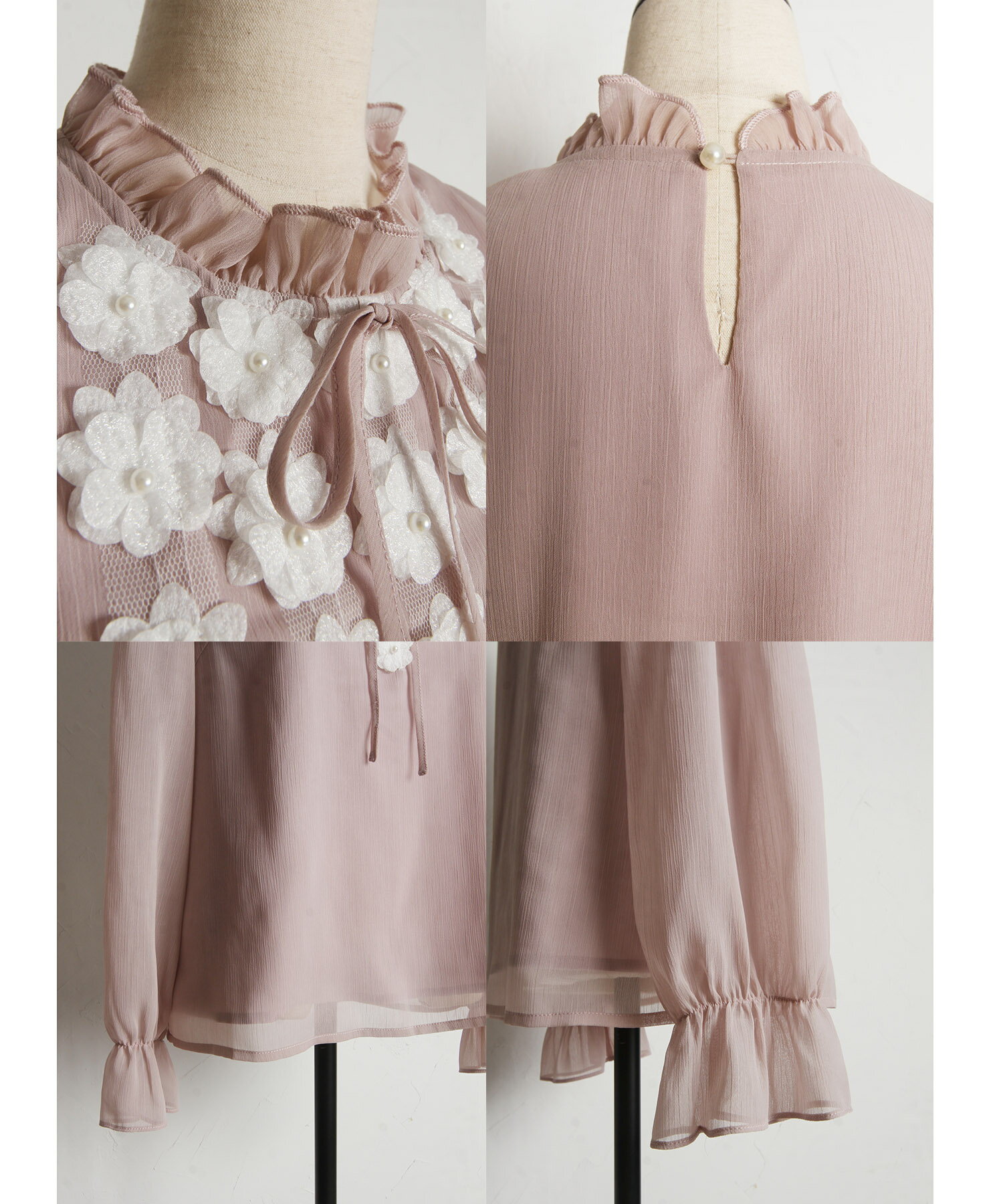 立体フラワーモチーフ&リボン付き楊柳ブラウス【faylith フェイリス】tocco closet(トッコクローゼット) グレイッシュピンク オフホワイト 商品番号:186-193935