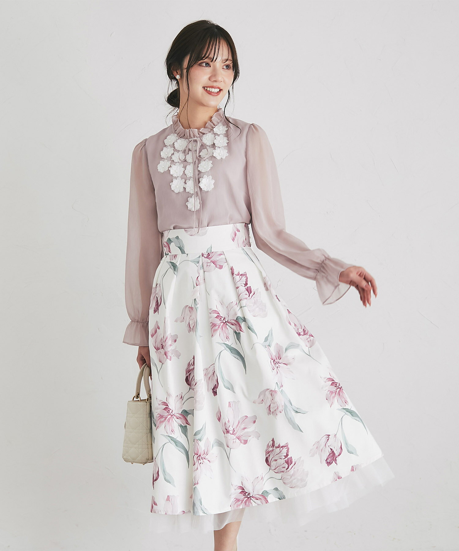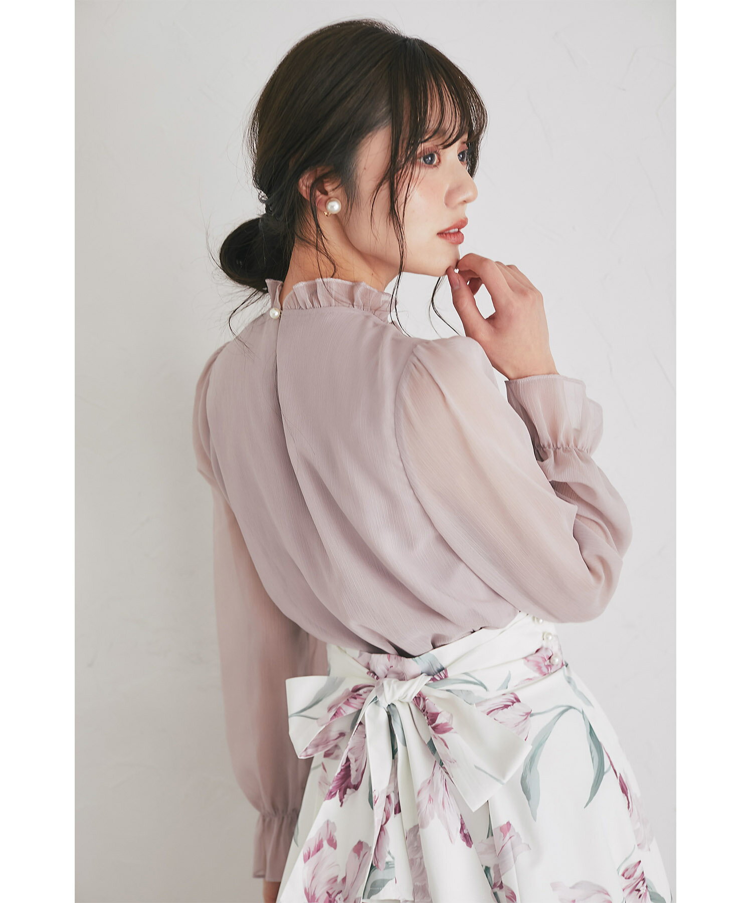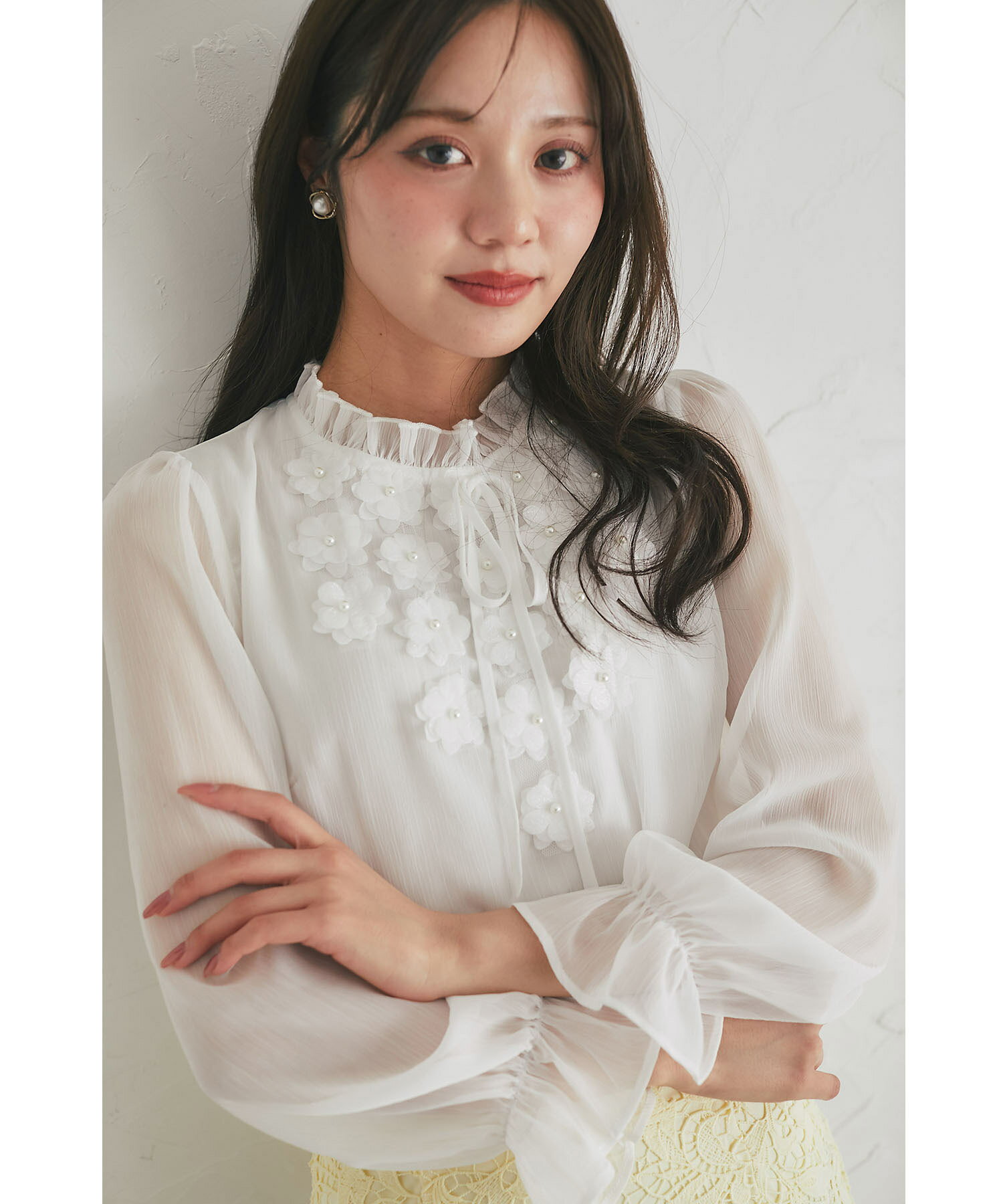 立体フラワーモチーフ&リボン付き楊柳ブラウス【faylith フェイリス】tocco closet(トッコクローゼット) グレイッシュピンク オフホワイト 商品番号:186-193935