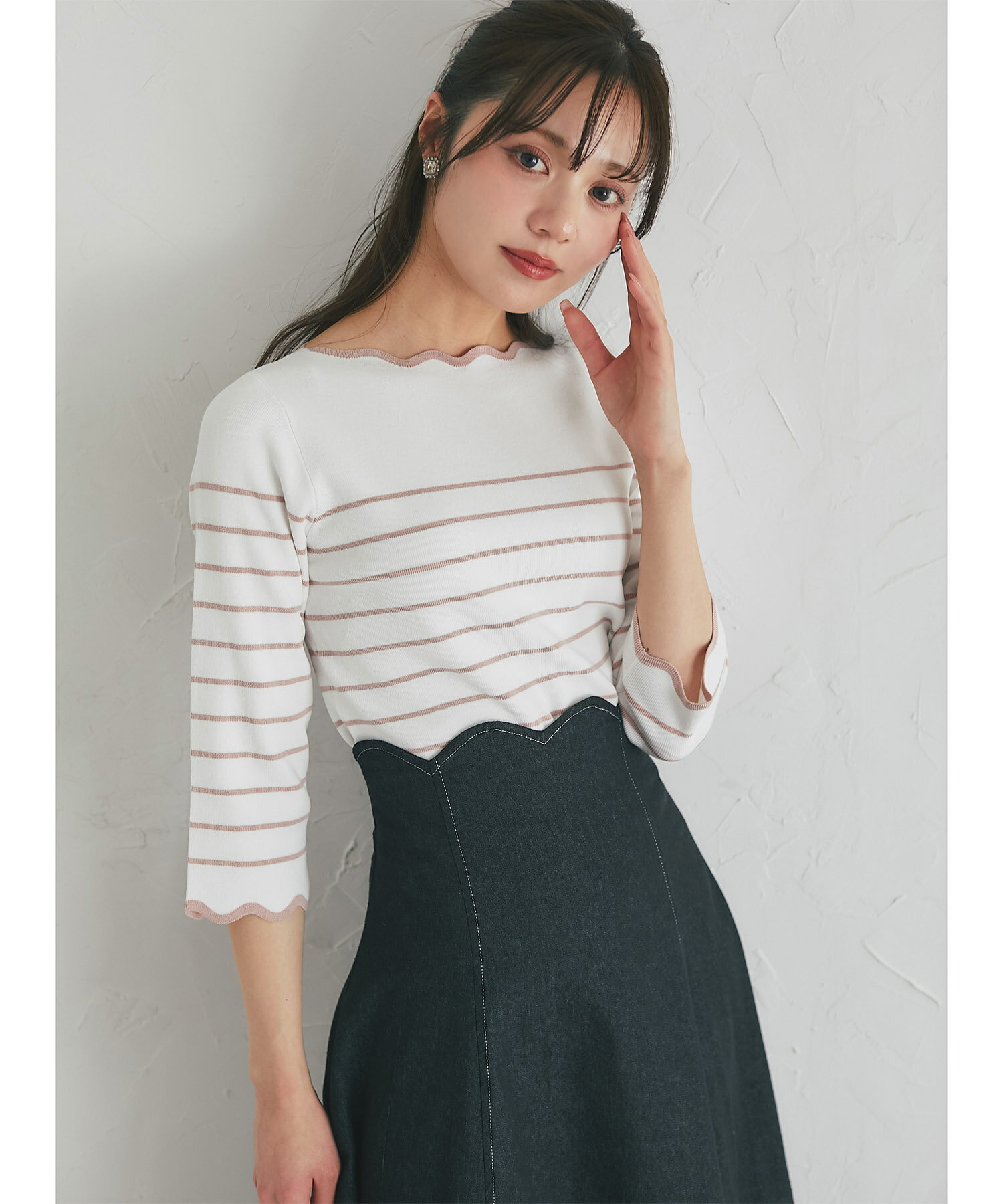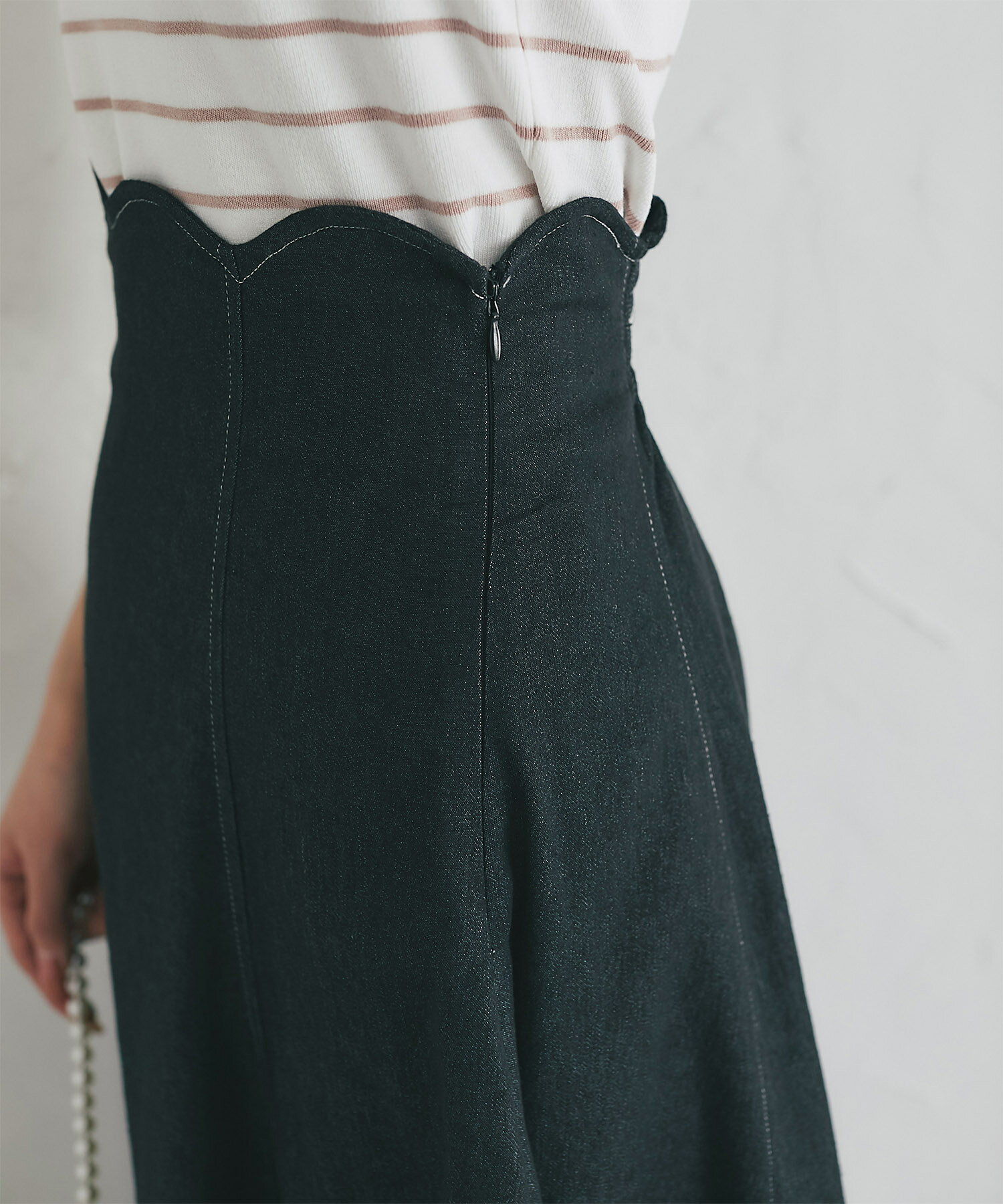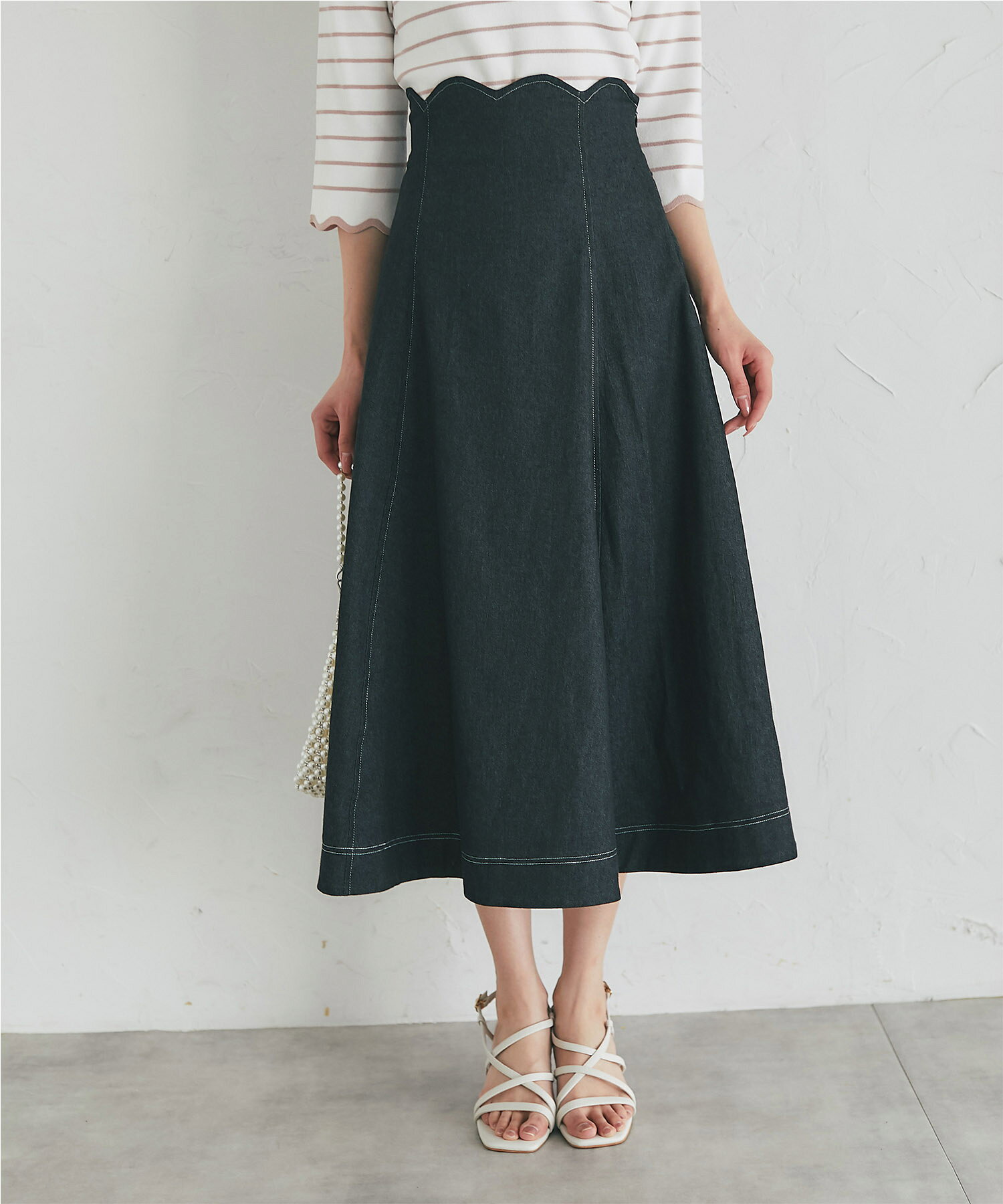 ステッチ入りウエストスカラップデニムフレアスカート【norabel ノラベル】tocco closet(トッコクローゼット) ブラック インディゴ 商品番号:186-193912