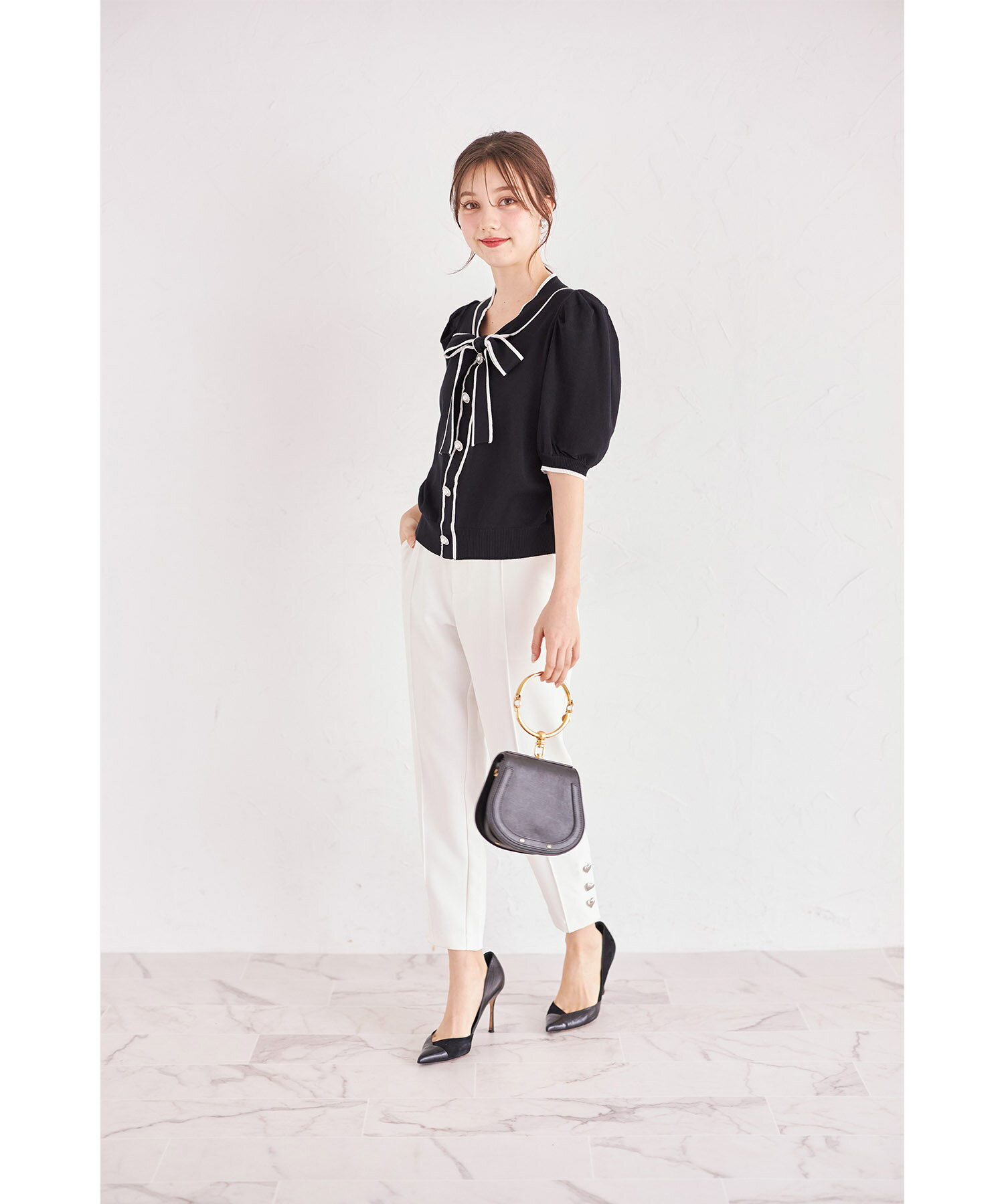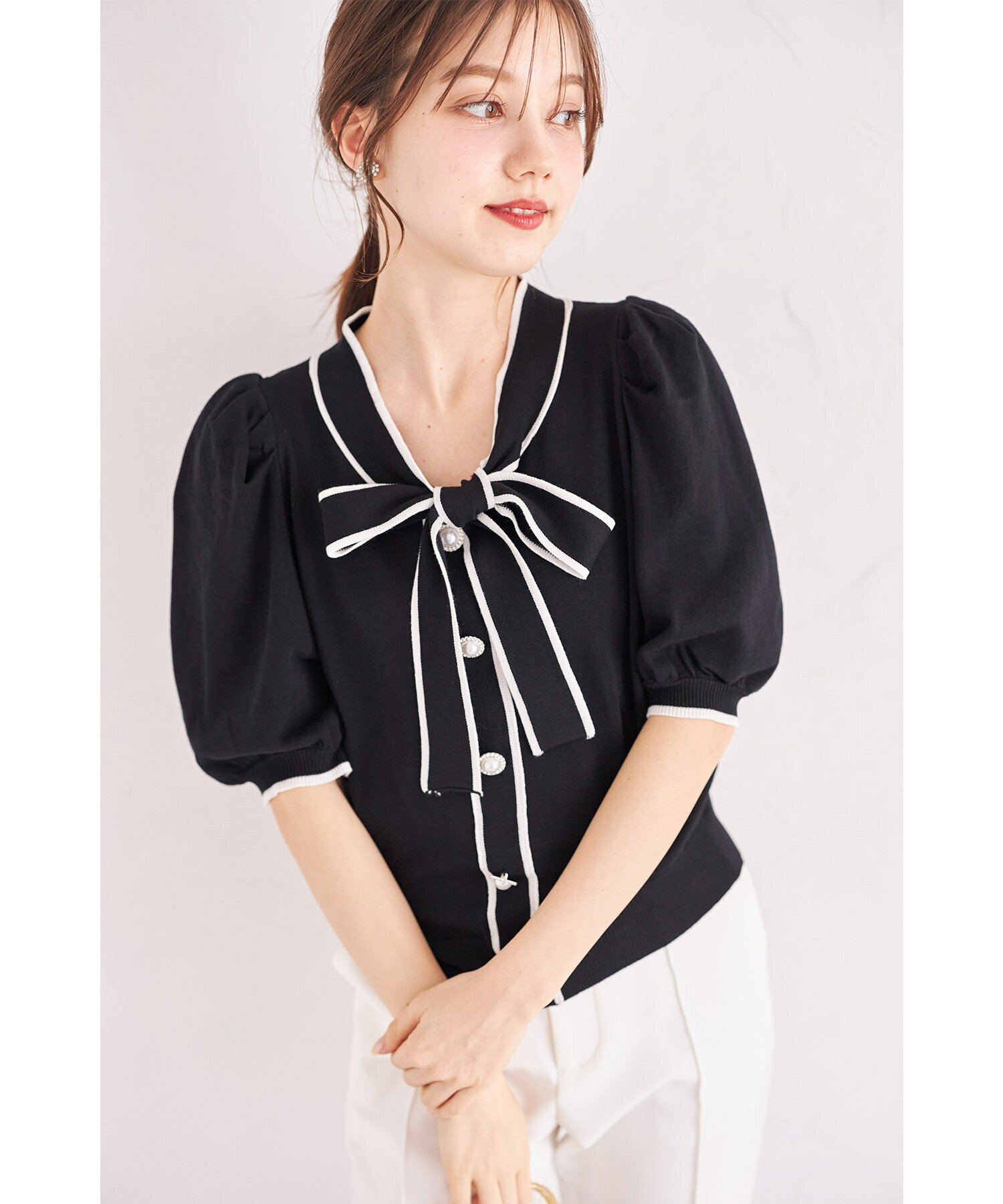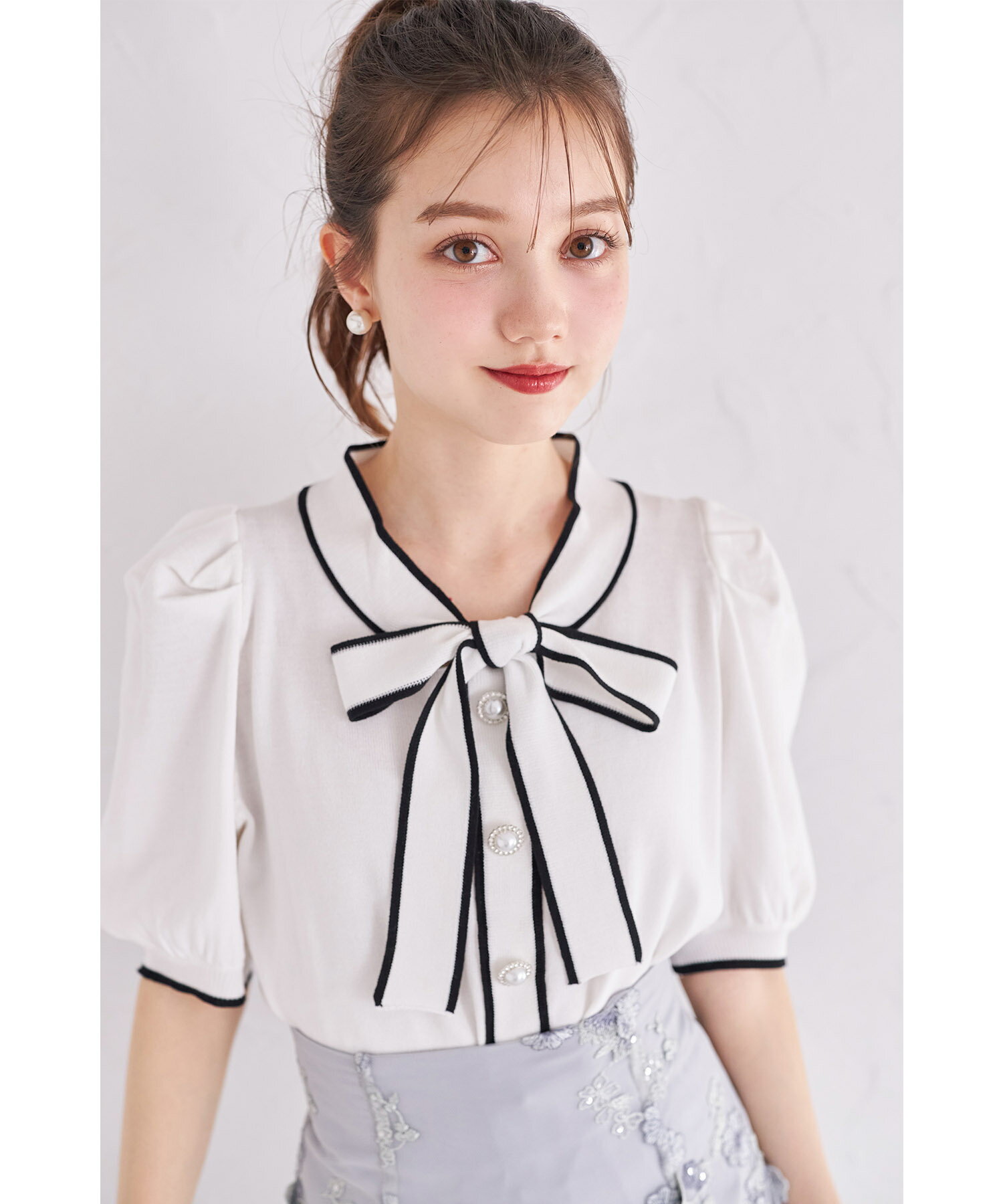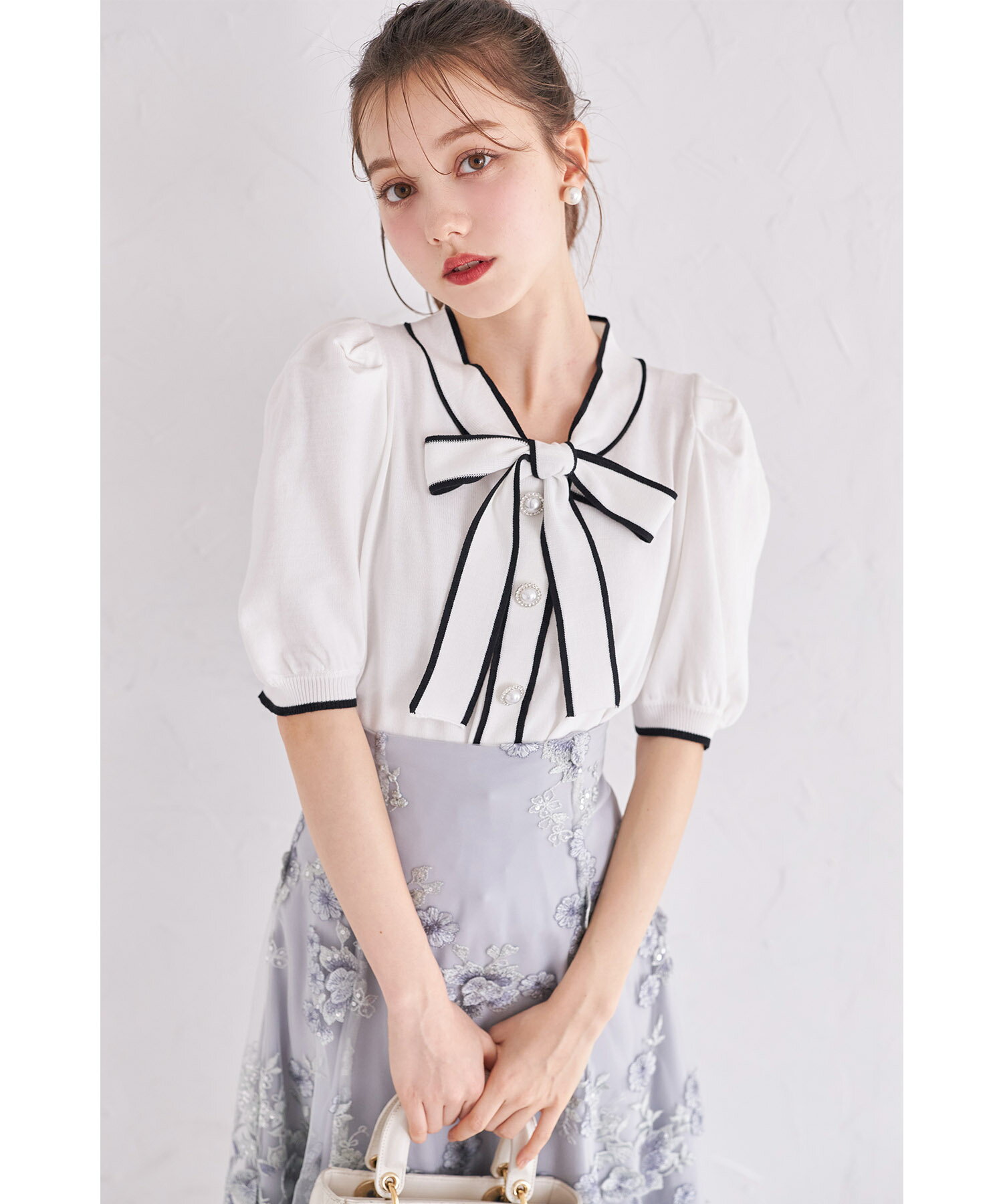 パール飾り釦付き配色ボウタイリボンニットプルオーバー【flarille フラリル】tocco closet(トッコクローゼット) オフホワイト ブラック 商品番号:186-194115