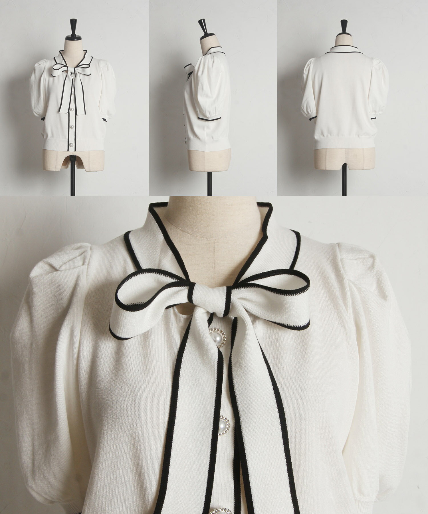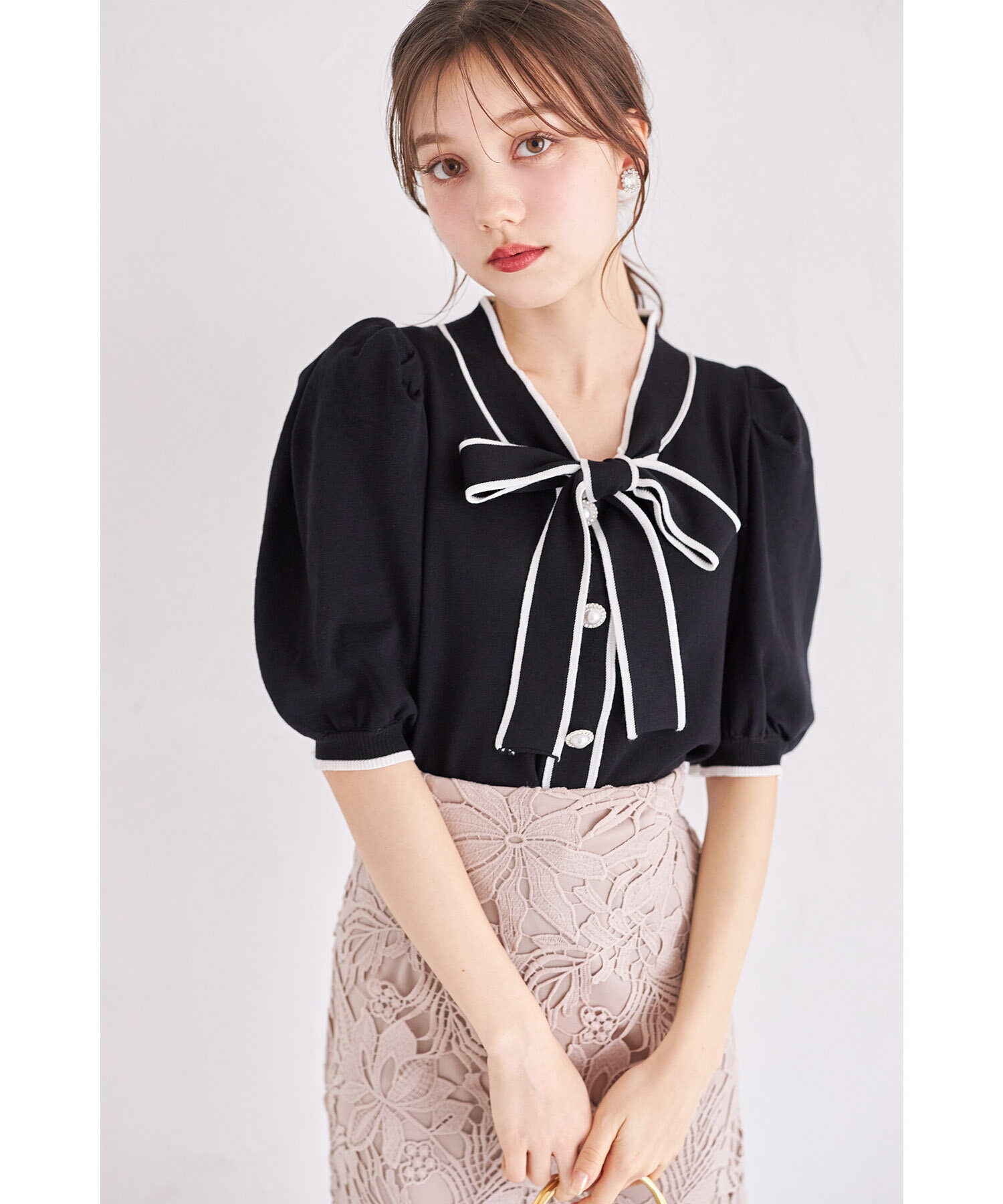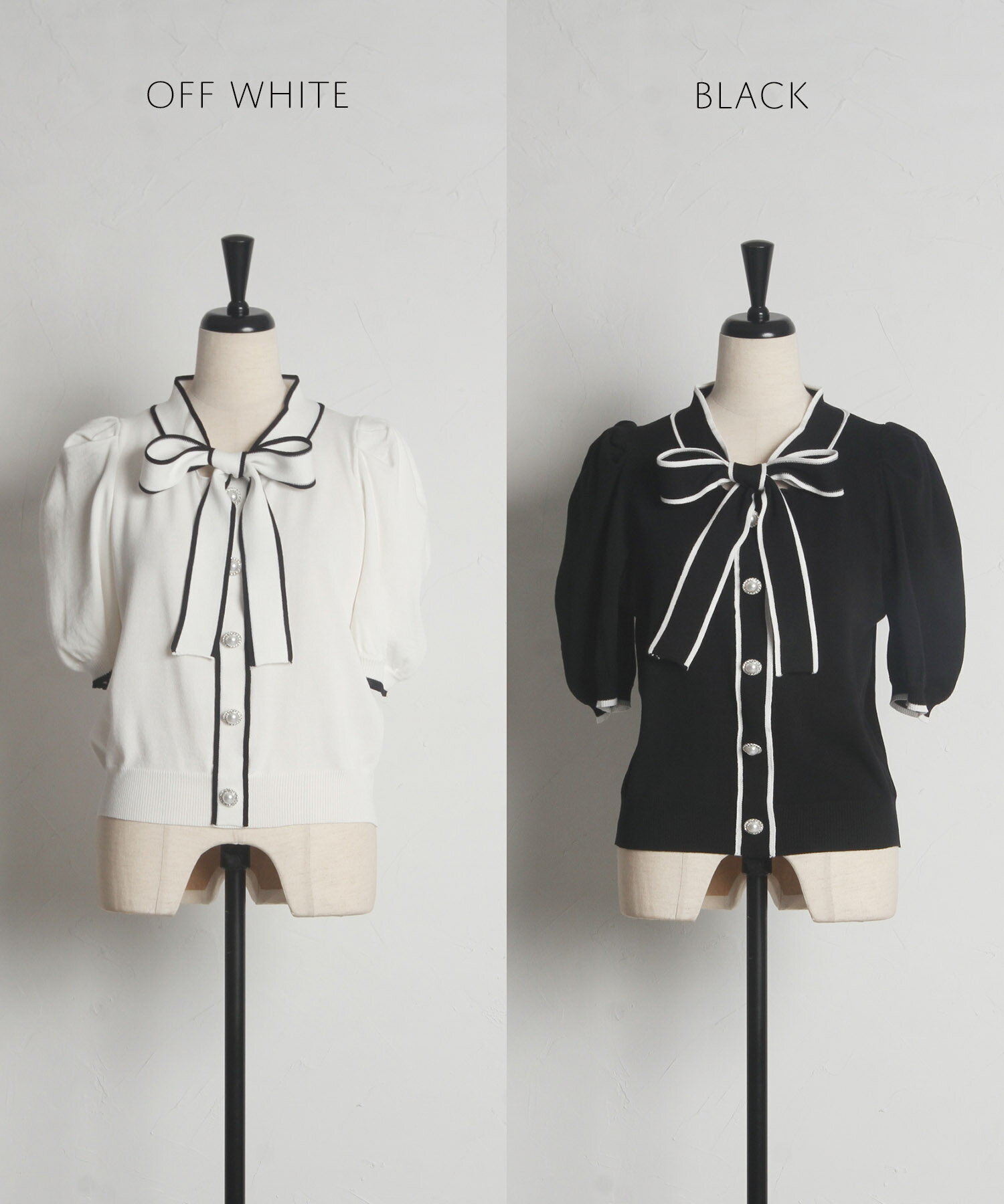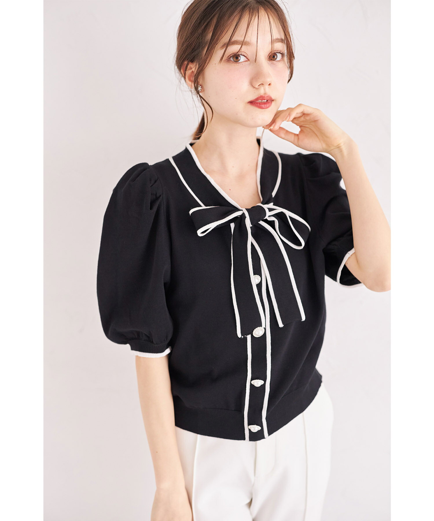 パール飾り釦付き配色ボウタイリボンニットプルオーバー【flarille フラリル】tocco closet(トッコクローゼット) オフホワイト ブラック 商品番号:186-194115