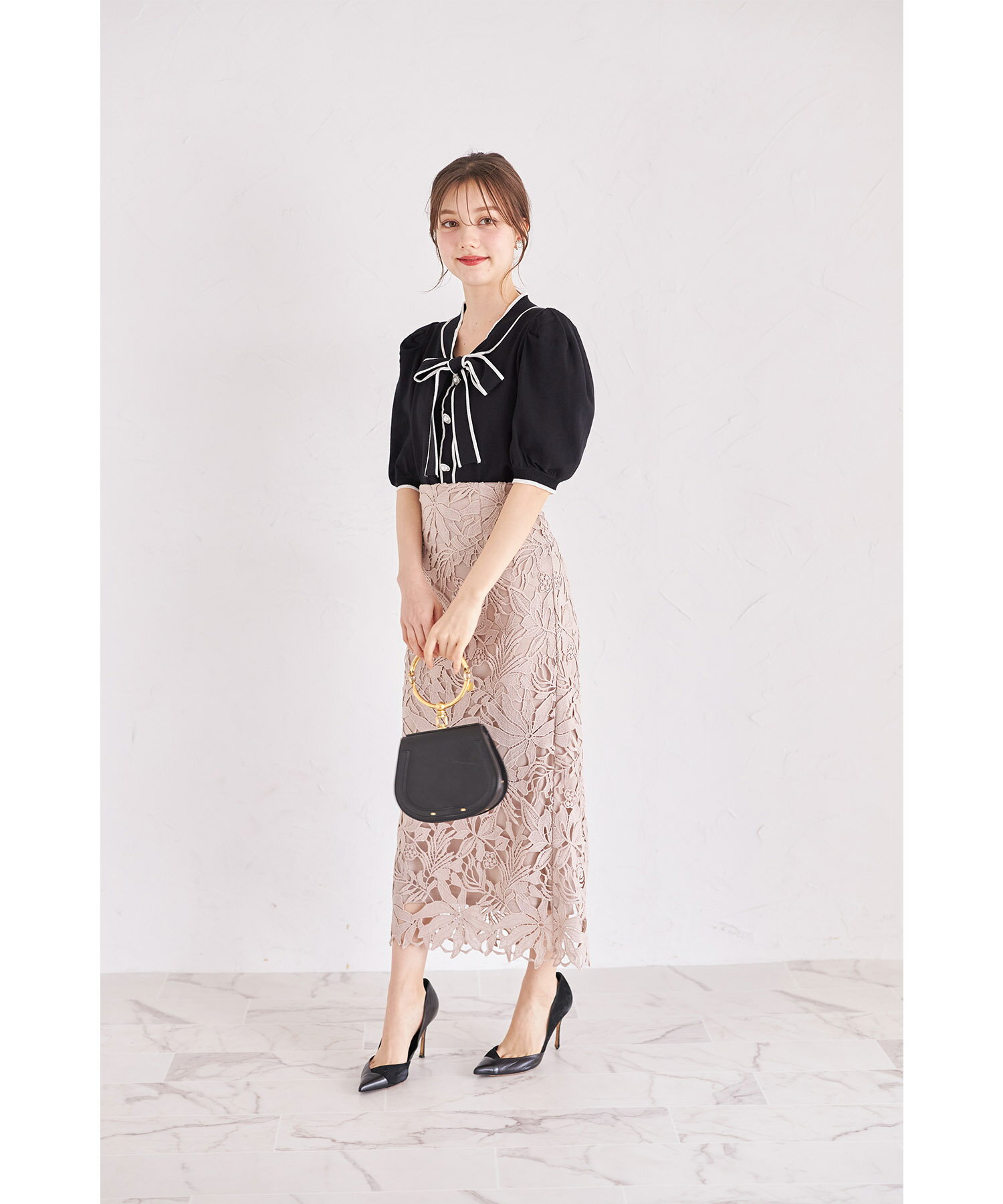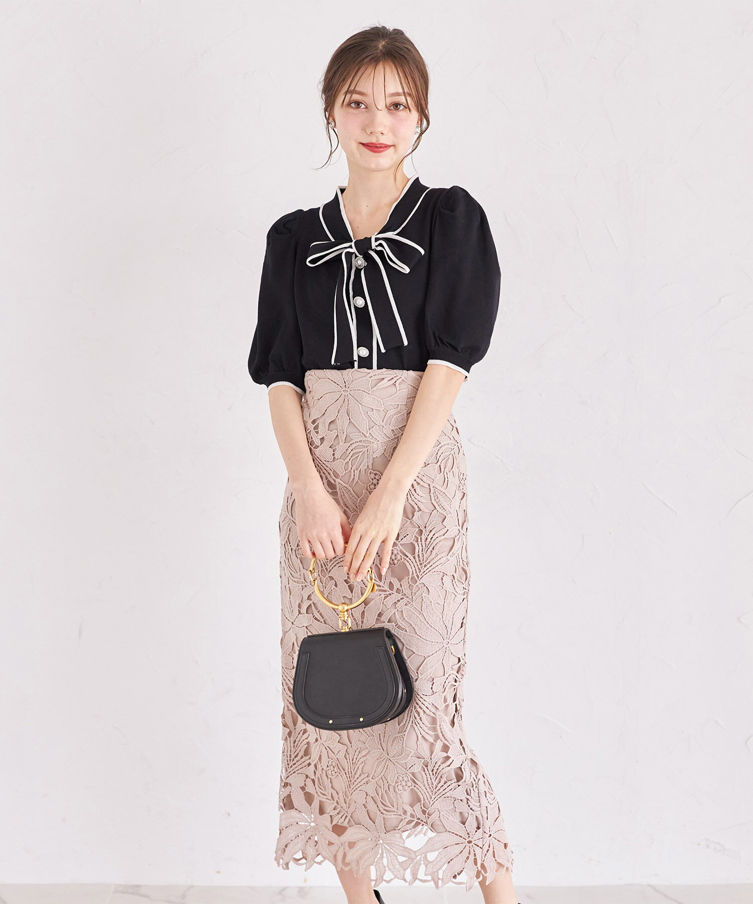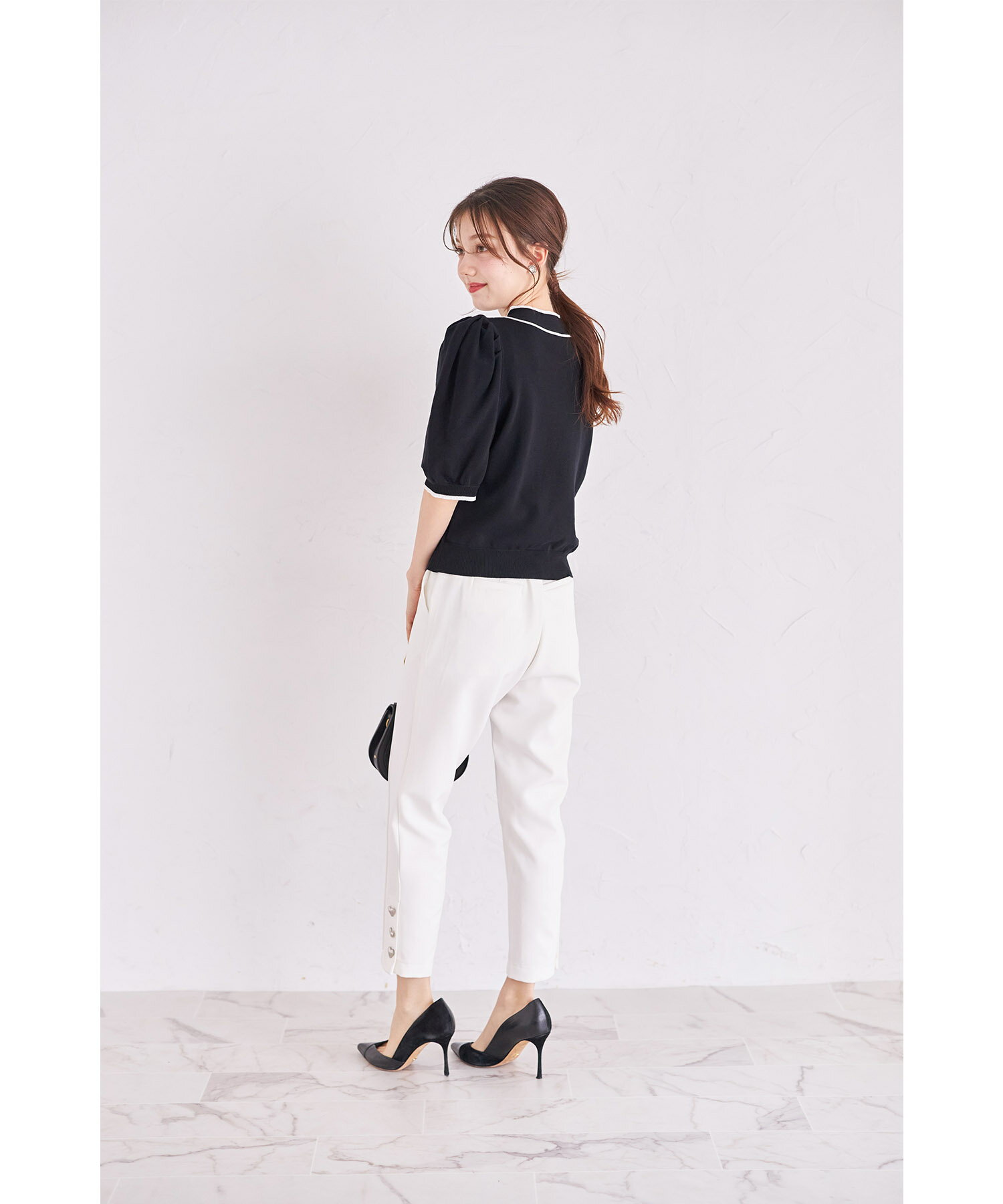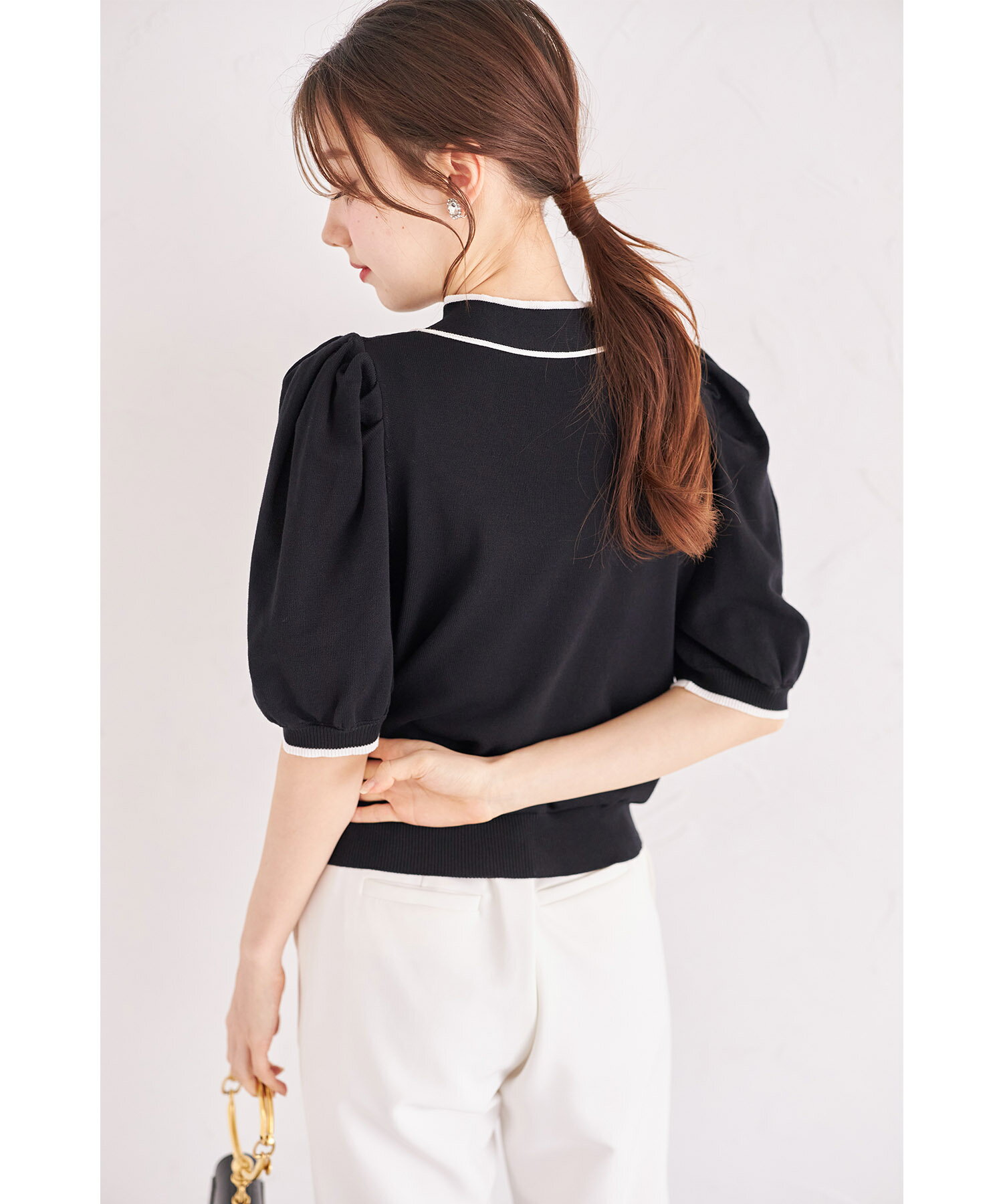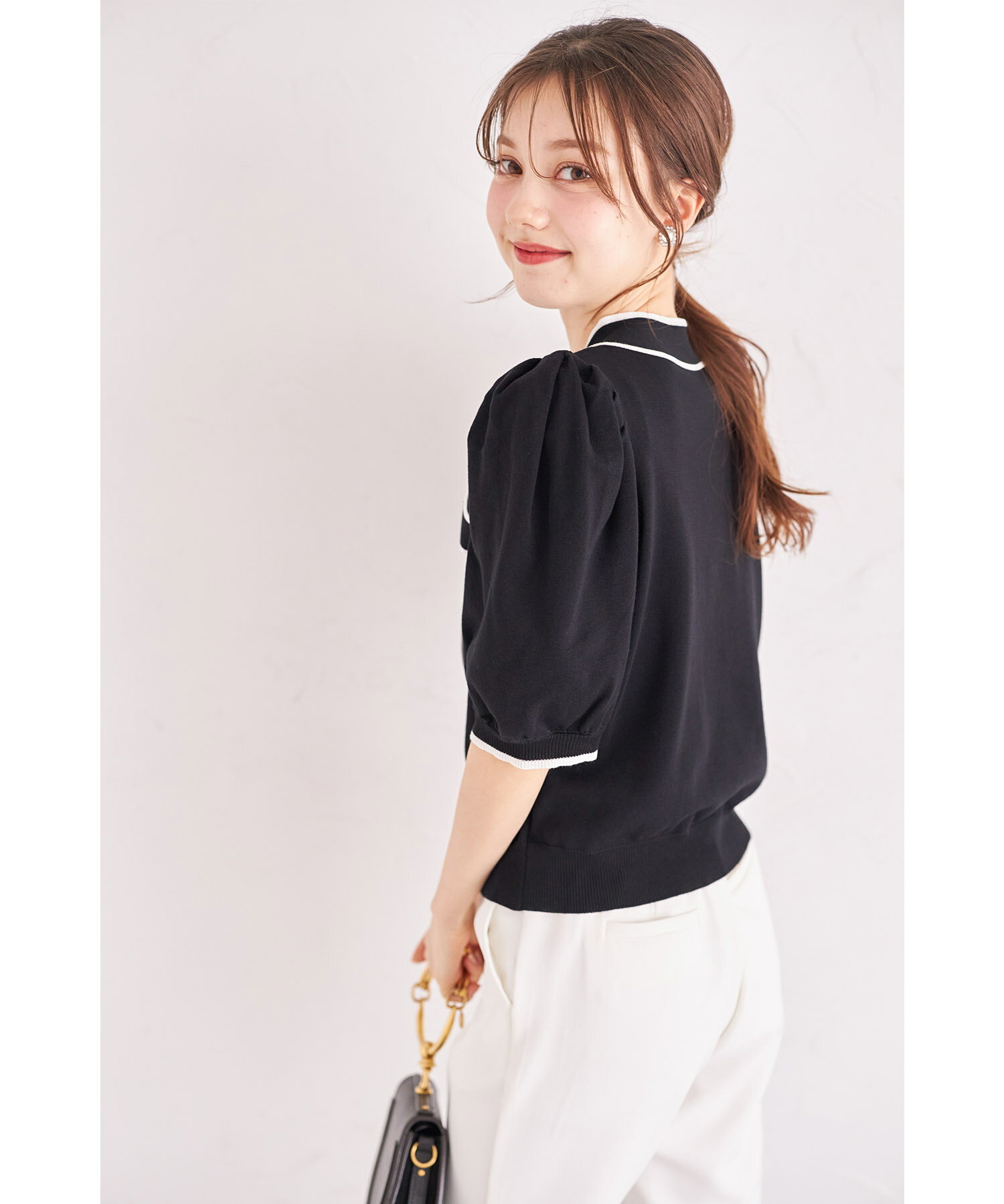 パール飾り釦付き配色ボウタイリボンニットプルオーバー【flarille フラリル】tocco closet(トッコクローゼット) オフホワイト ブラック 商品番号:186-194115