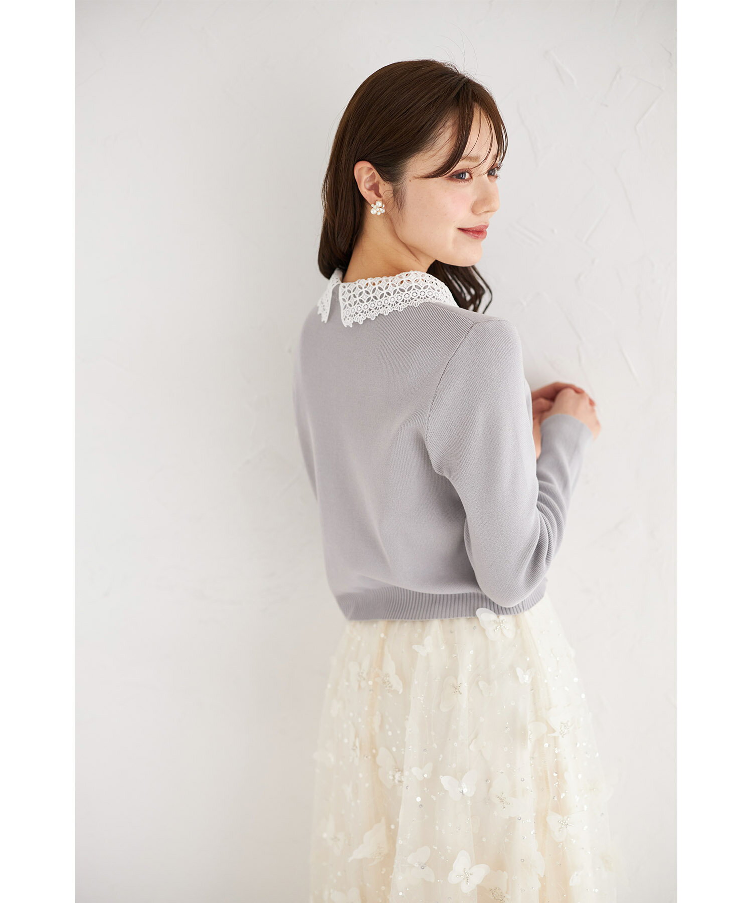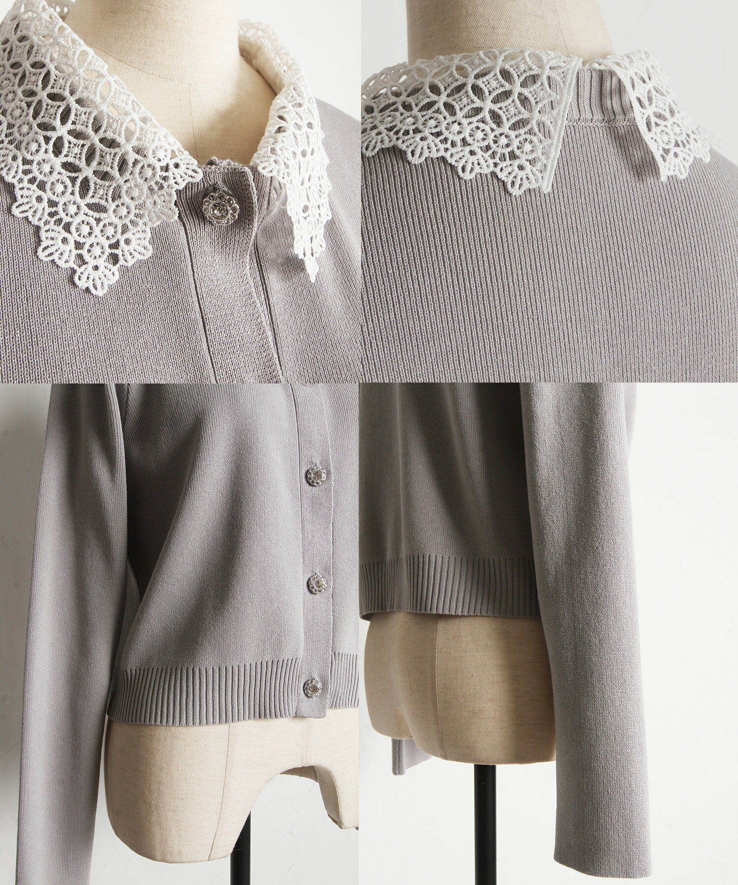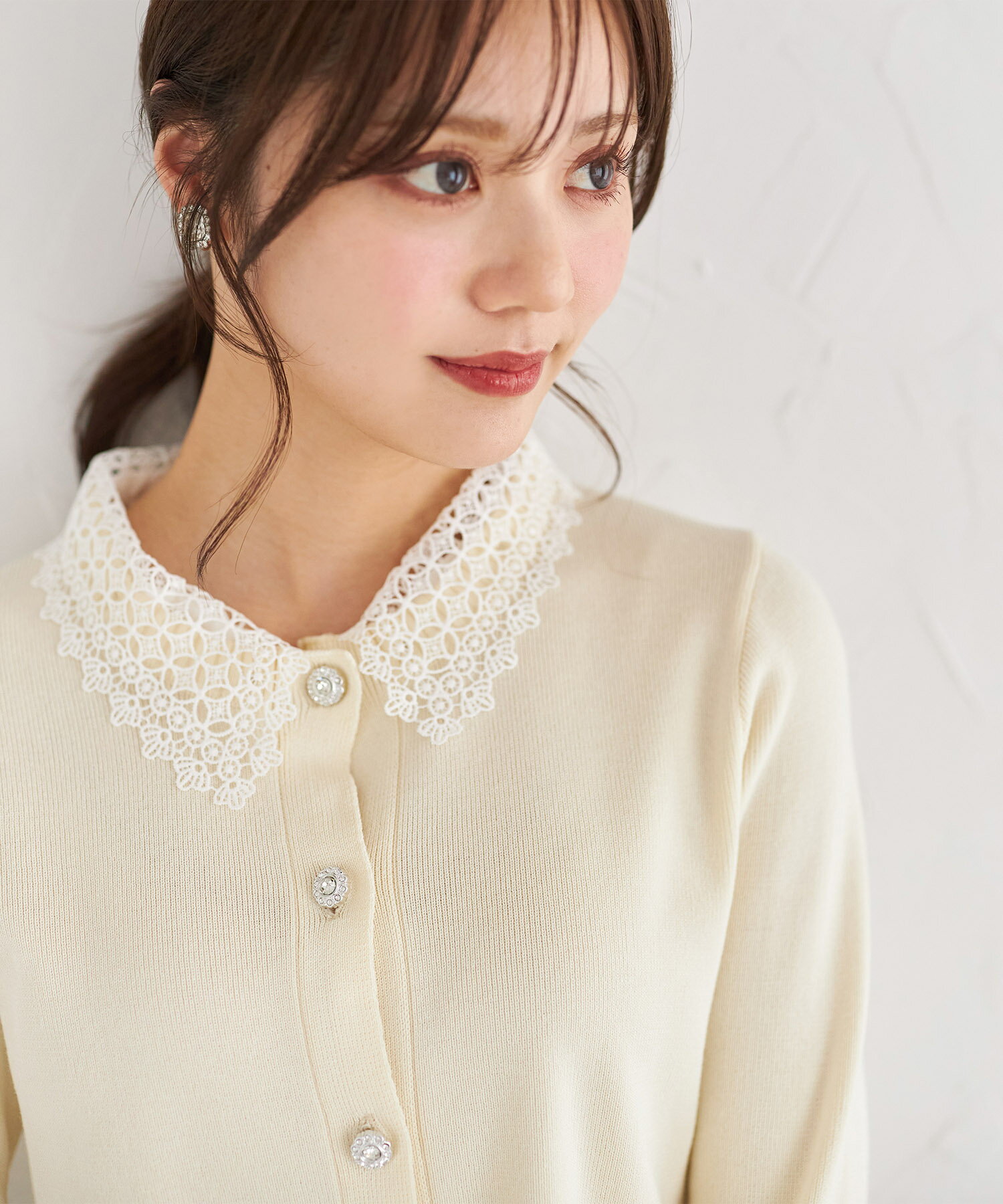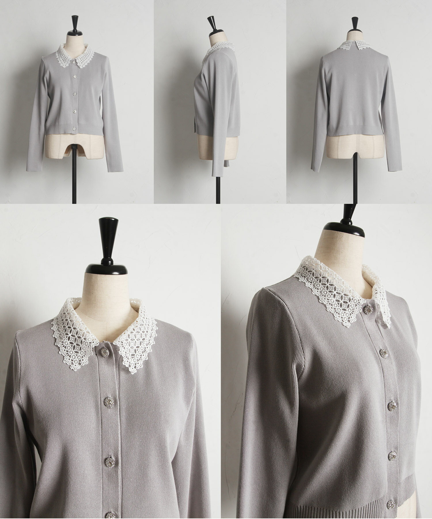 2WAYレース襟付きビジュー釦ニットカーディガン【isolara イソレラ】tocco closet(トッコクローゼット) グレー アイボリー 商品番号:186-194103
