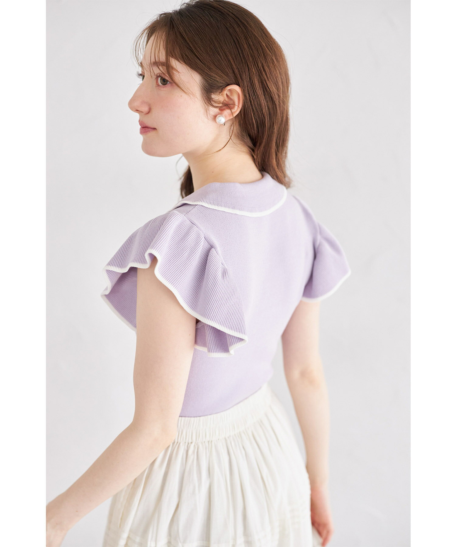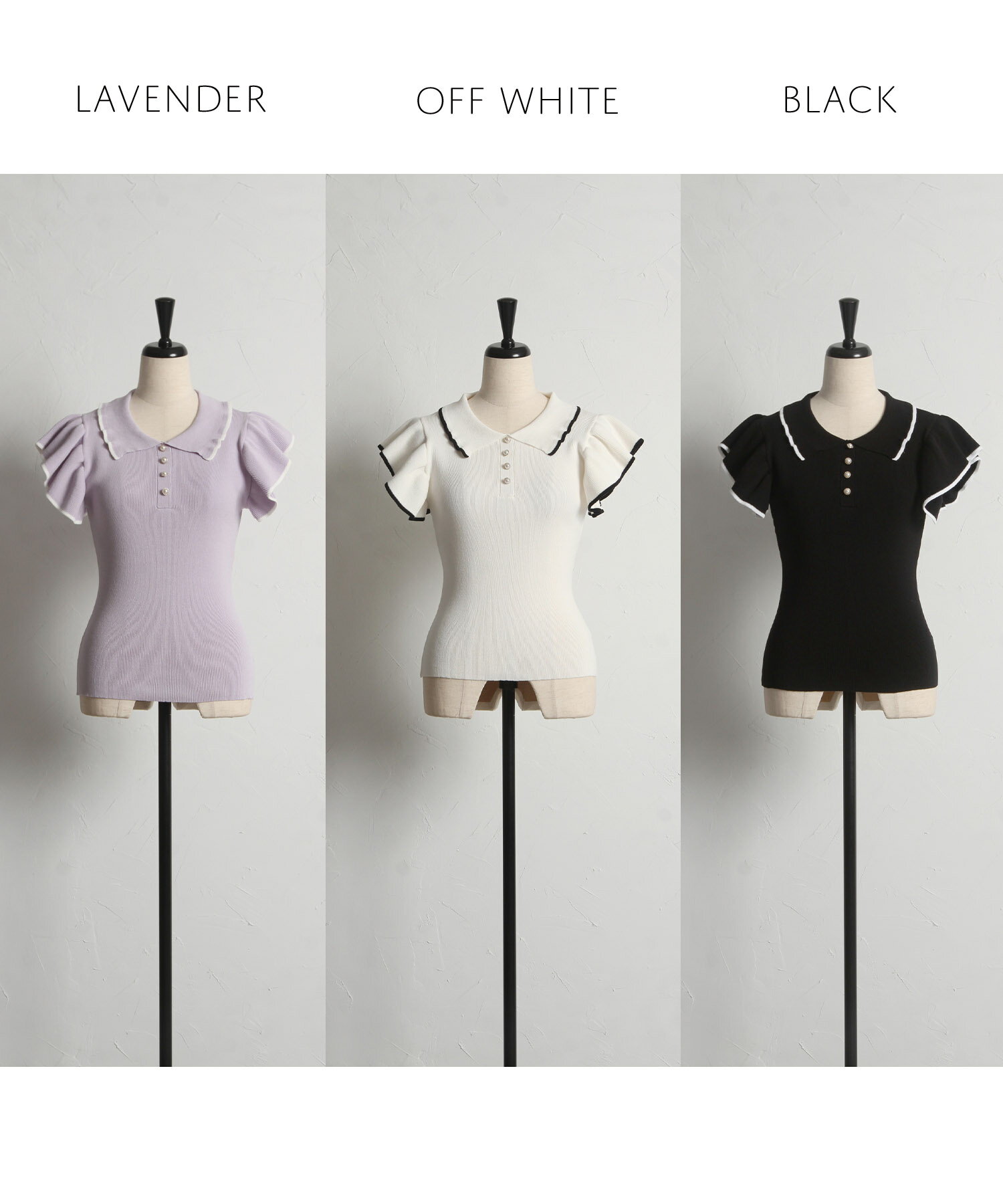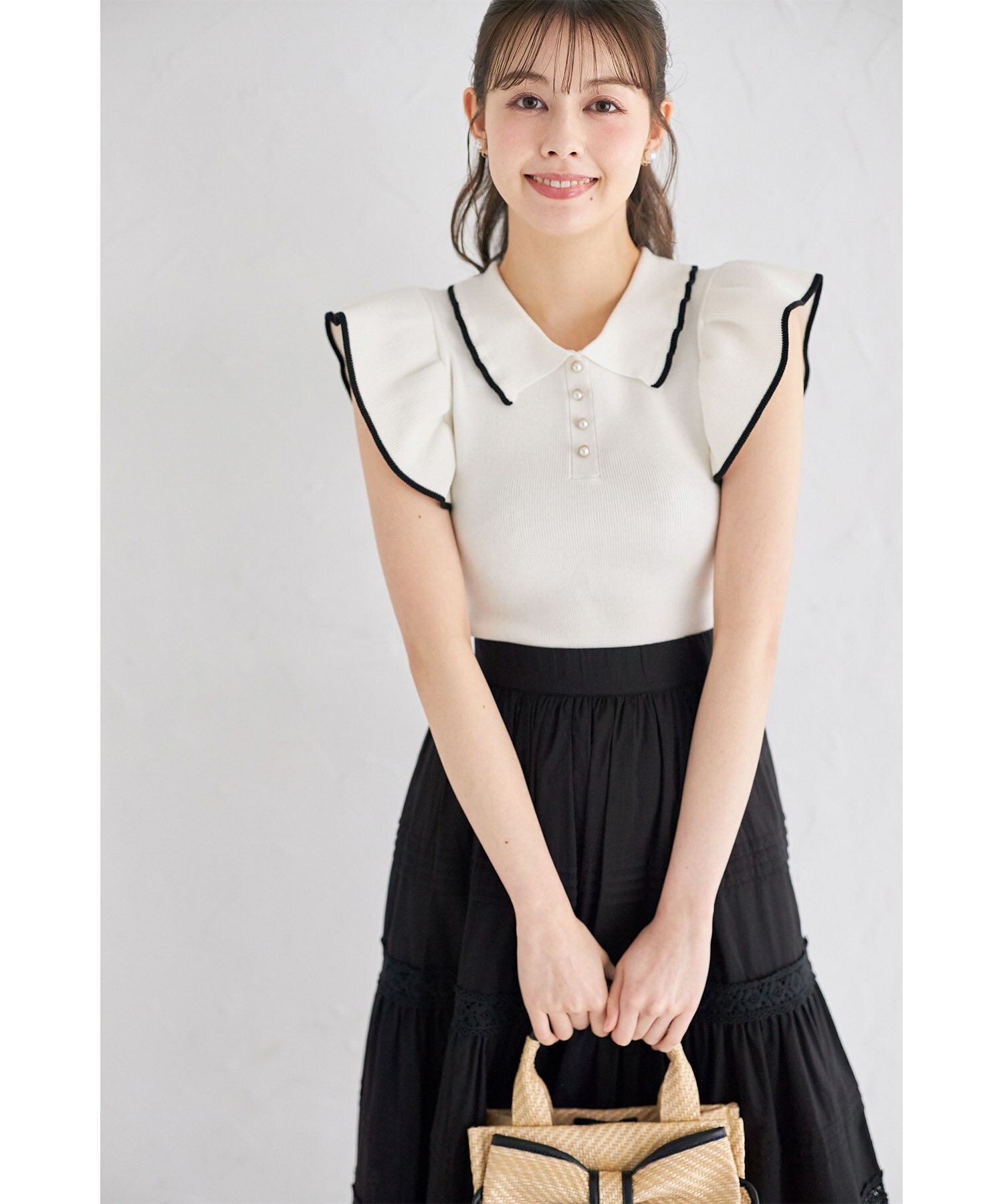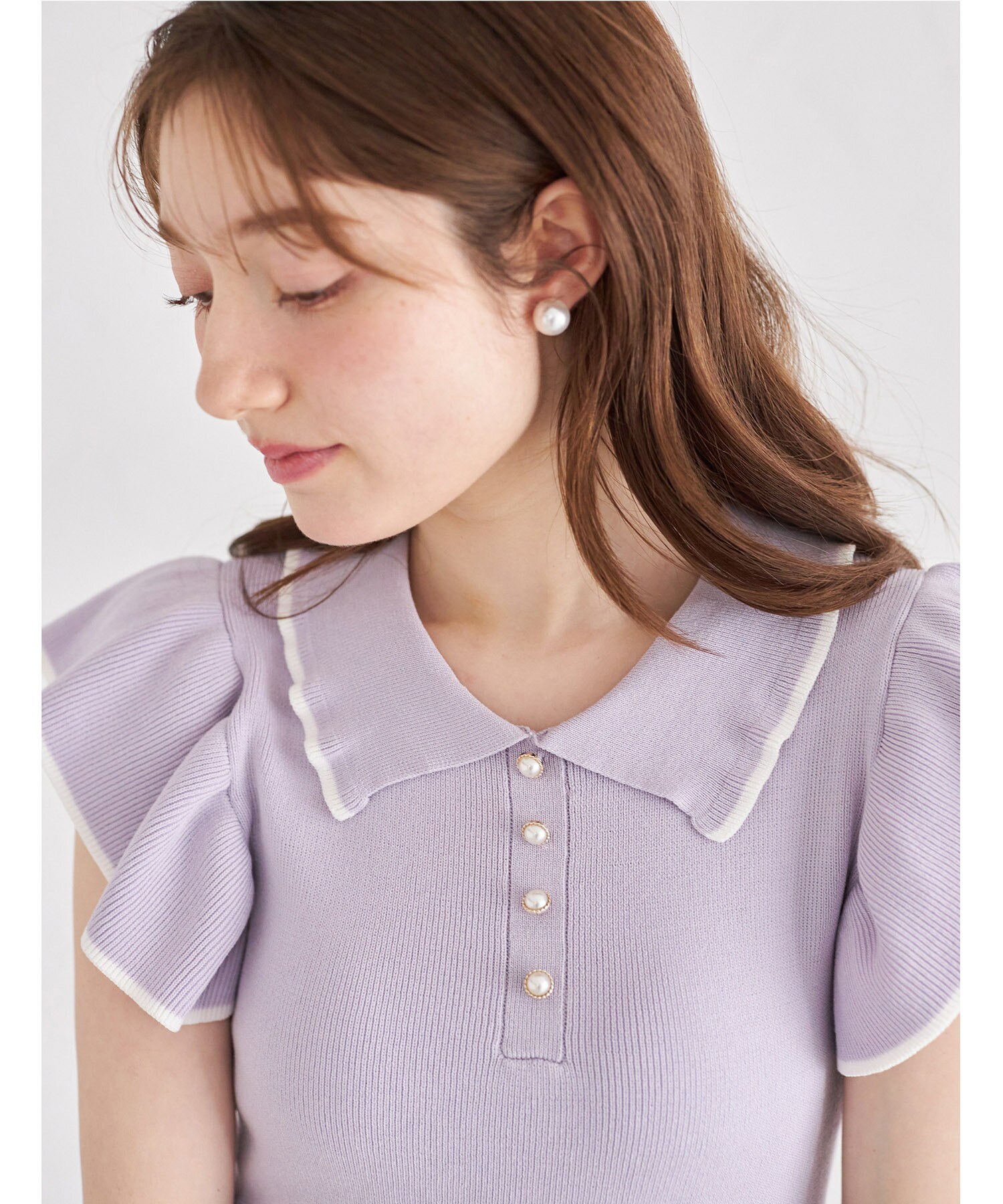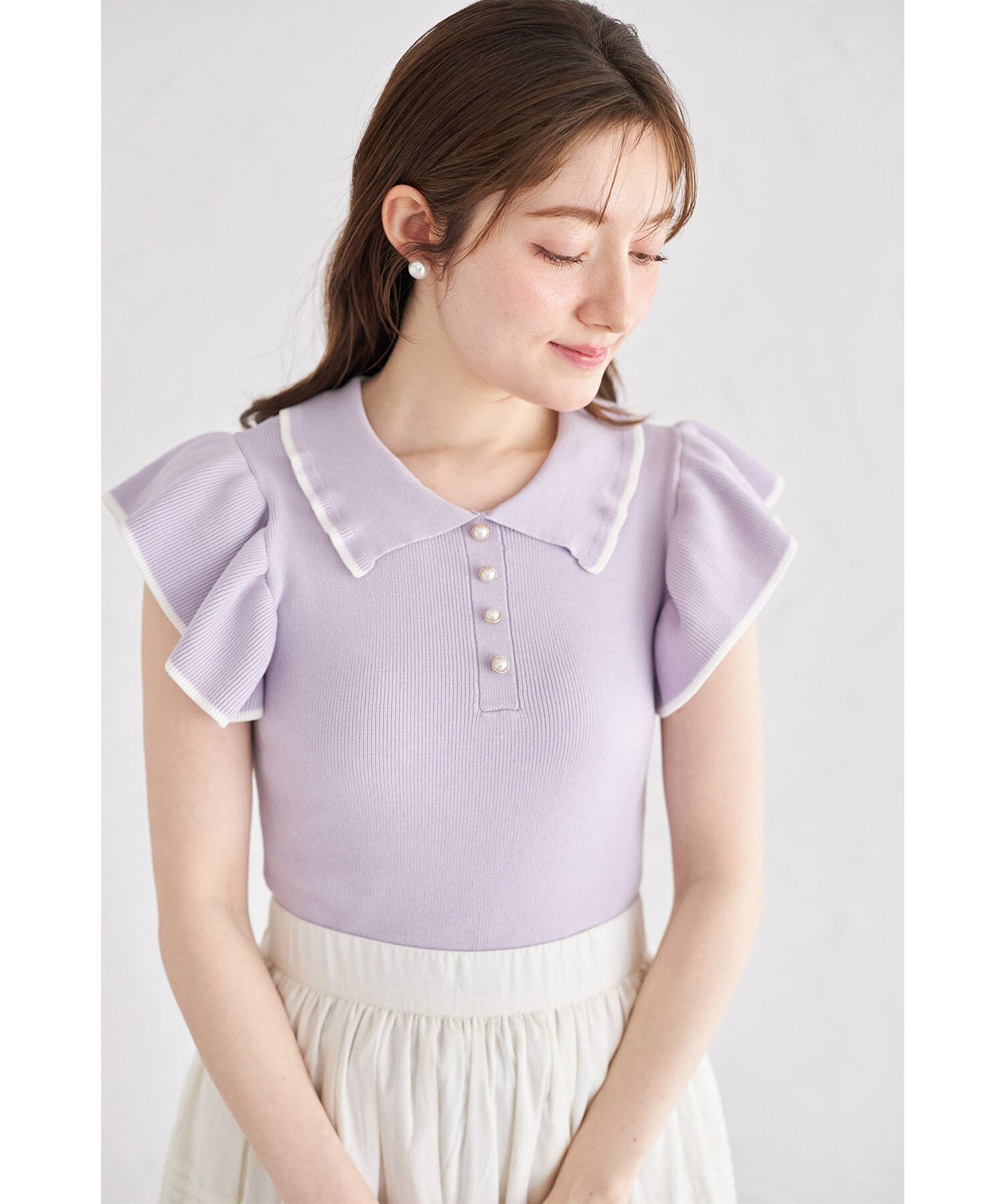 パール飾り釦付き配色ライン入りフリルスリーブニットプルオーバー【celiane セリアン】tocco closet(トッコクローゼット) ラベンダー オフホワイト ブラック 商品番号:186-195239