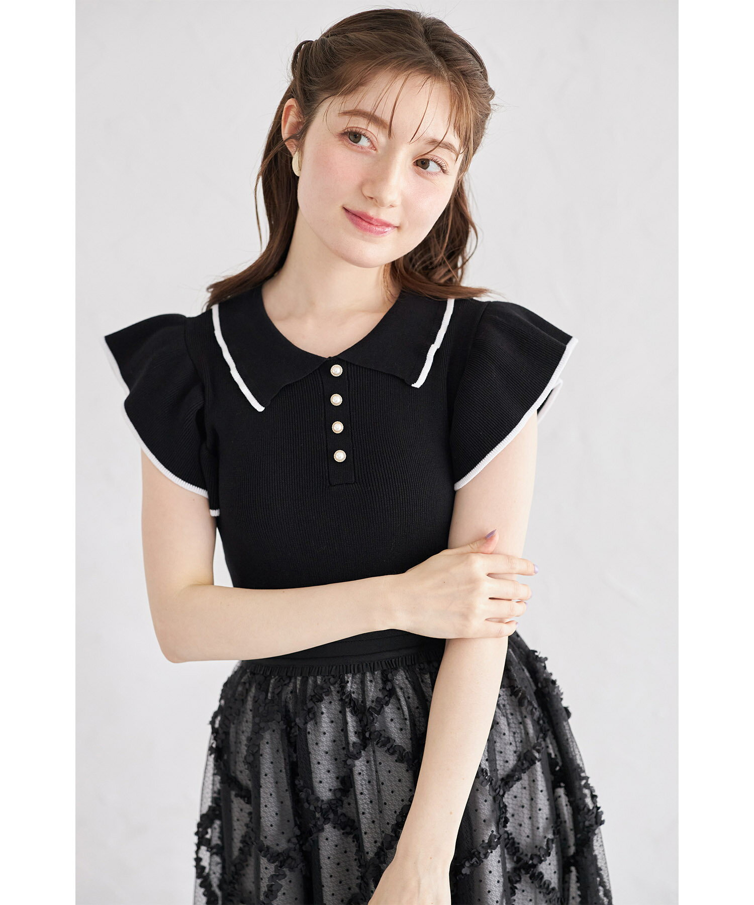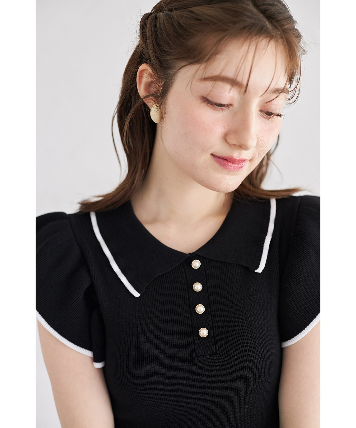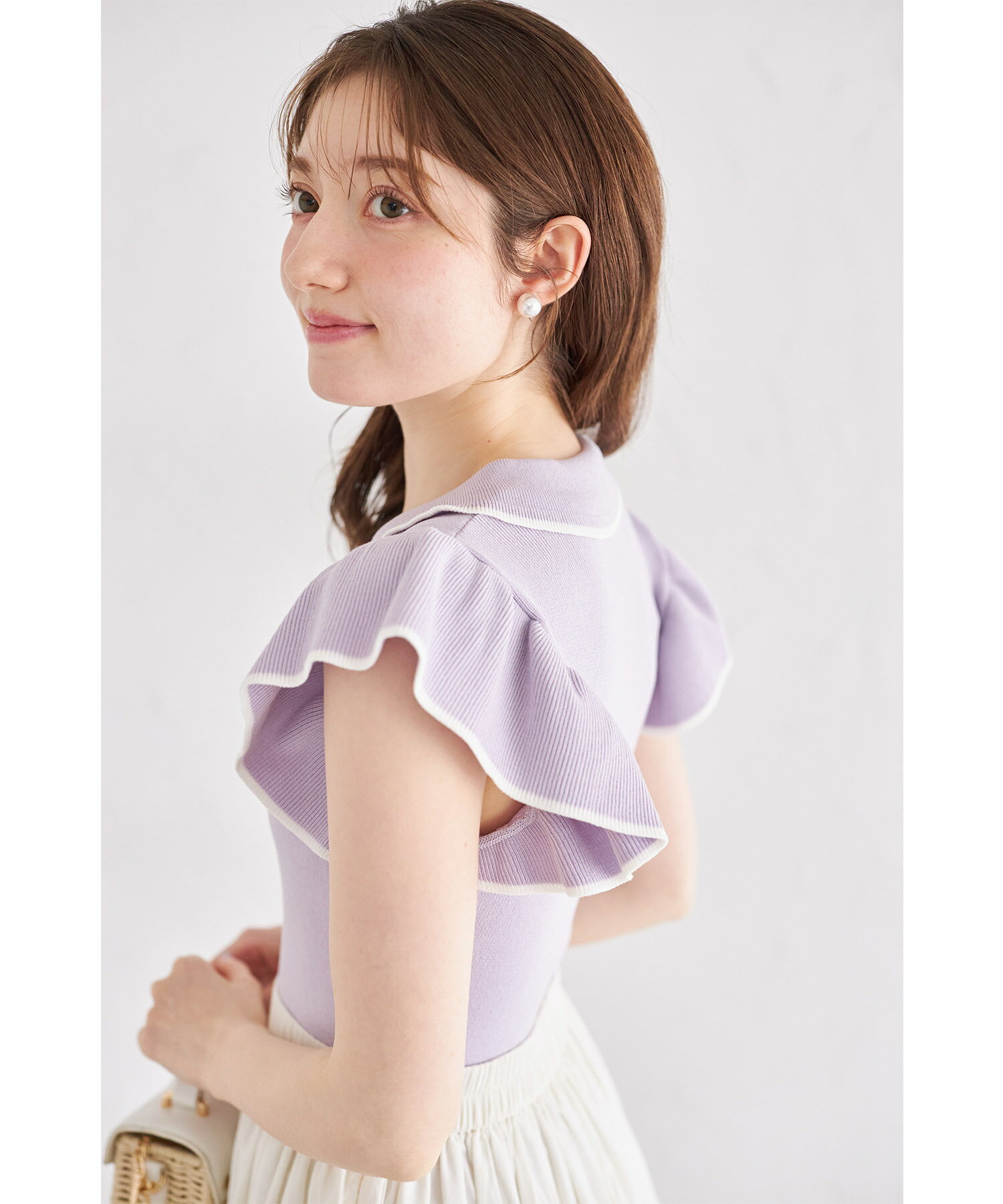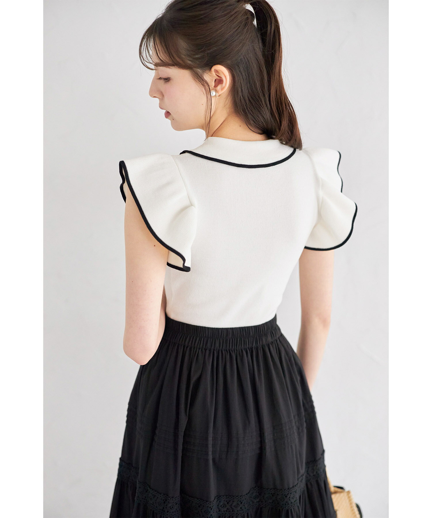 パール飾り釦付き配色ライン入りフリルスリーブニットプルオーバー【celiane セリアン】tocco closet(トッコクローゼット) ラベンダー オフホワイト ブラック 商品番号:186-195239