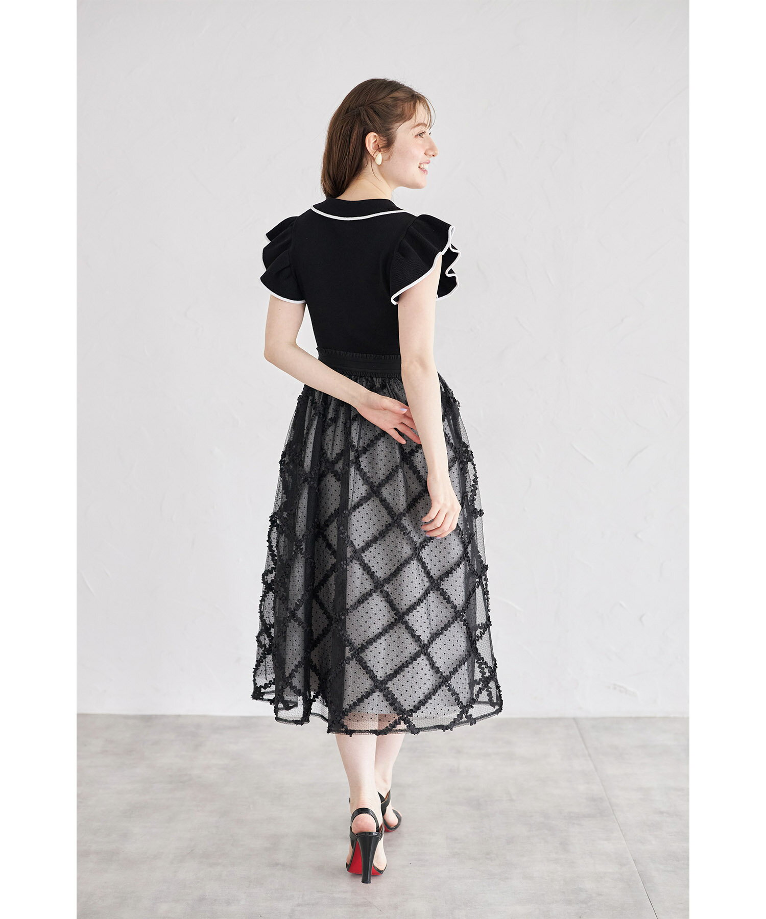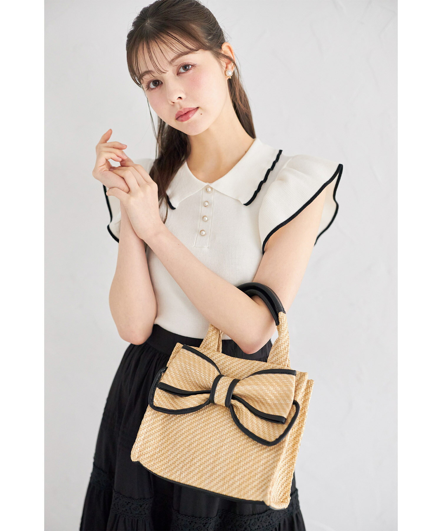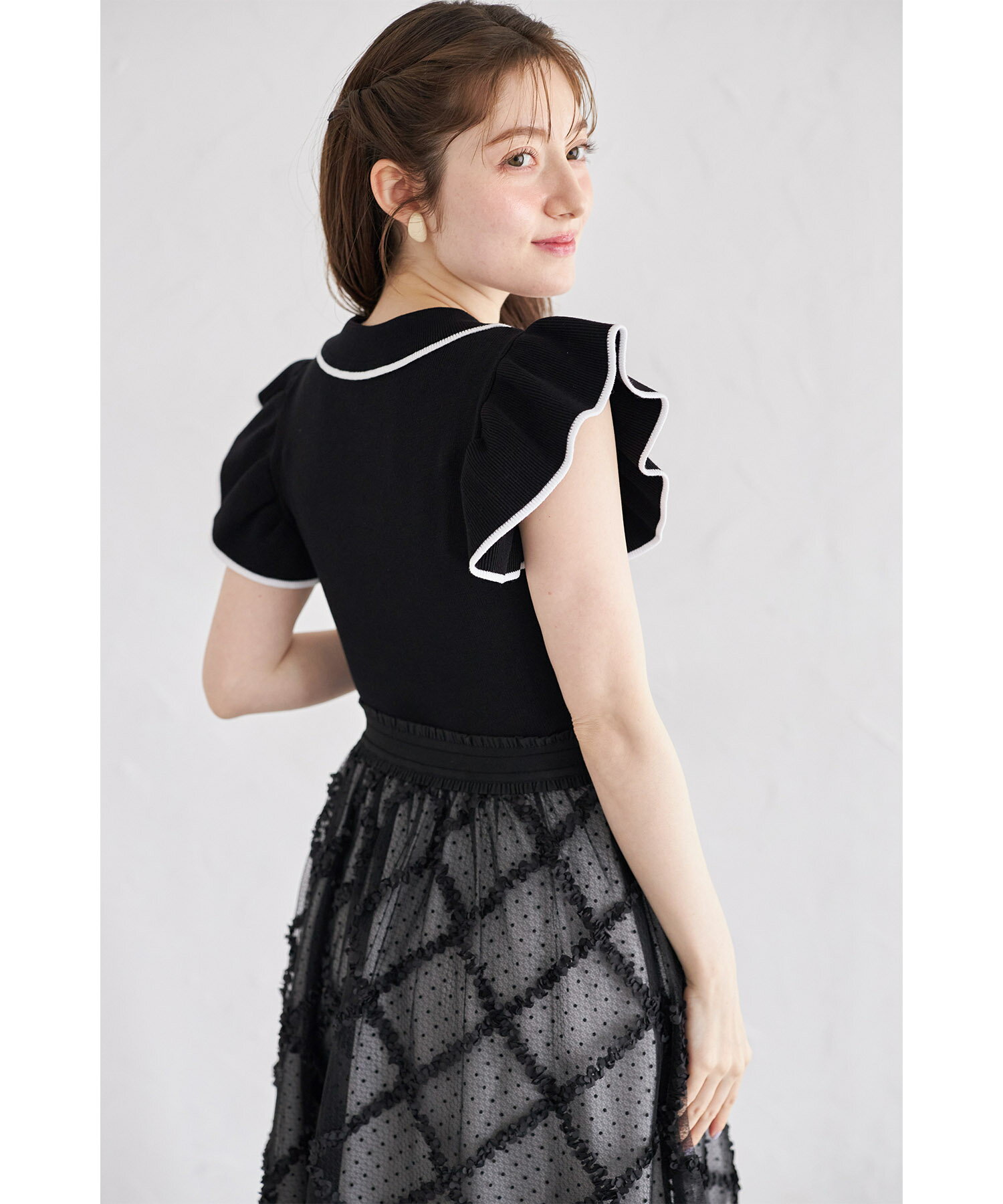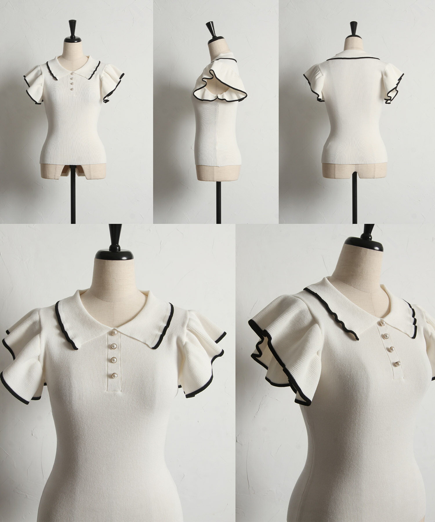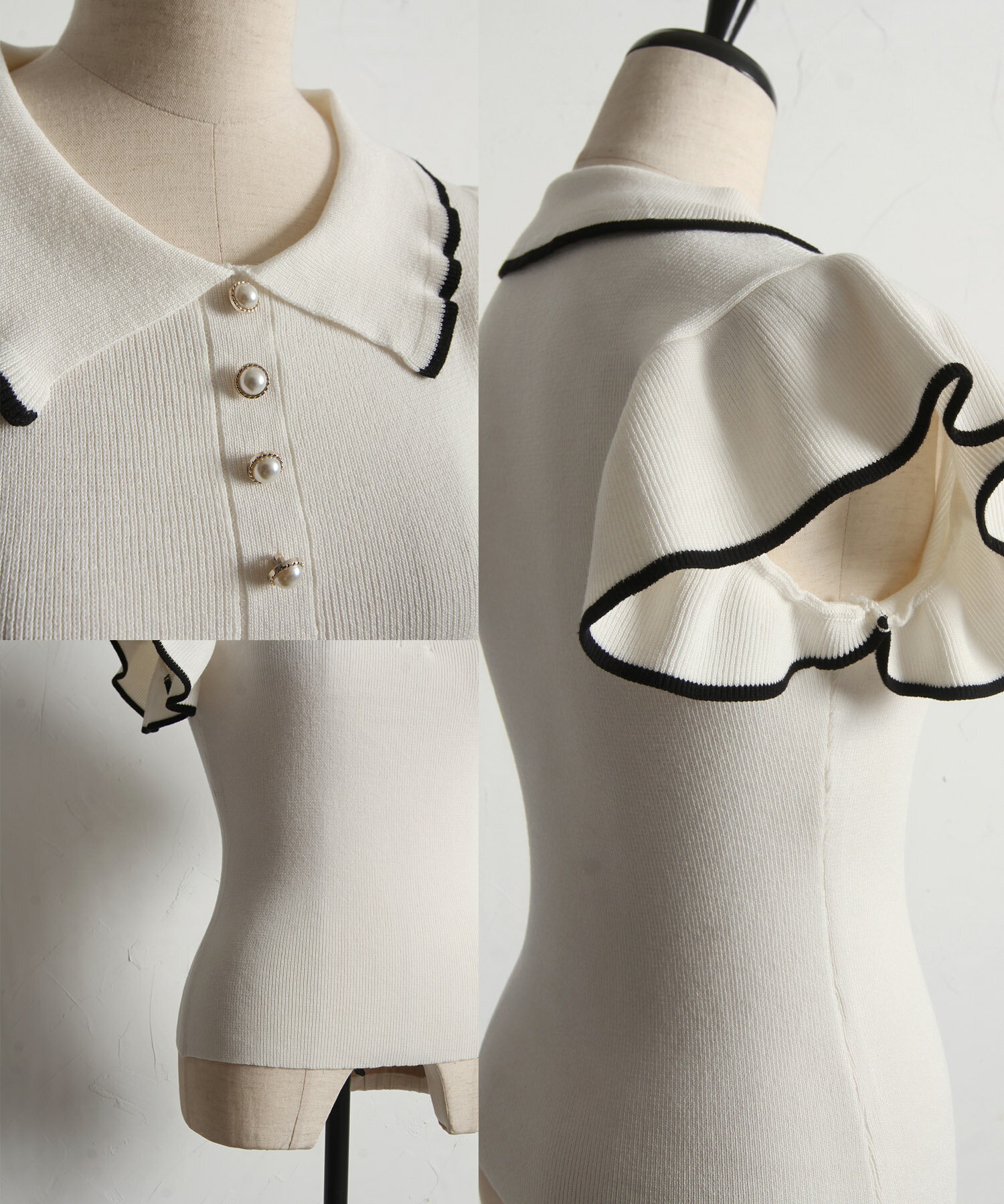 パール飾り釦付き配色ライン入りフリルスリーブニットプルオーバー【celiane セリアン】tocco closet(トッコクローゼット) ラベンダー オフホワイト ブラック 商品番号:186-195239
