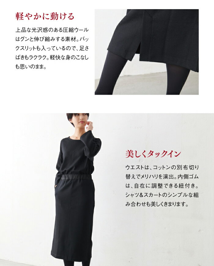 [ ロングスカート 黒 秋冬 タイト 暖かい ] 圧縮ウール100% ロングスカート / 日本製 40代 50代 60代 30代 女性 ファッション 卒業式 入学式 母 毛100 フォーマル きれいめ 冠婚葬祭 ブラックフォーマル ウエストゴム 春 冬 秋 ボトム 暖かい ナロースカート