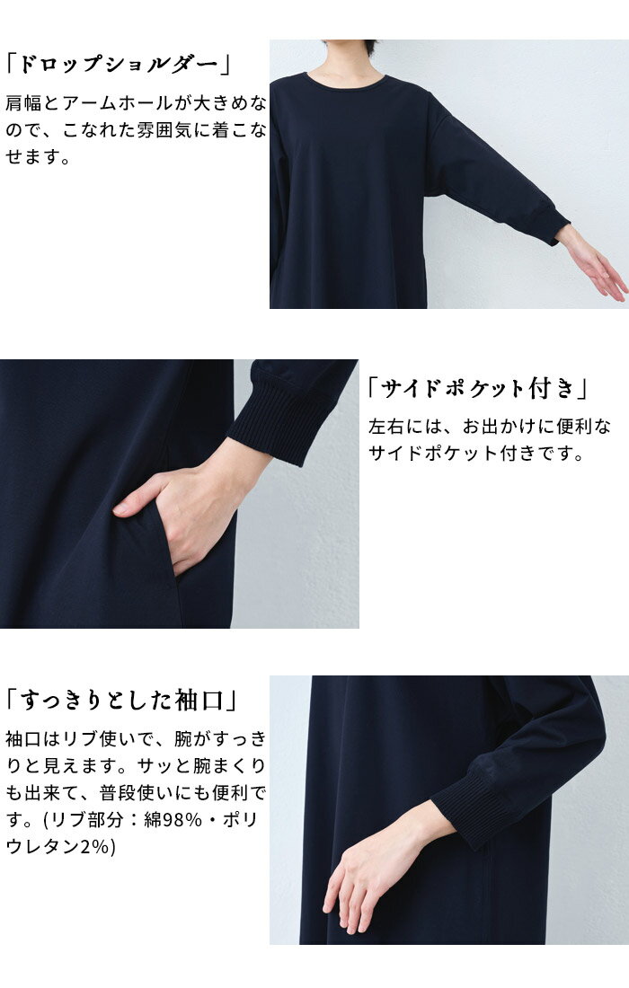 [ ワンピ レディース 無地 綿 接触冷感 ] 強撚 コットン100% リブ使い ワンピース / 日本製 40代 50代 60代 綿100% ロングワンピース シワになりにくい 旅行 長袖 きれいめ ゆったり 春 夏 秋 綿100% 春服 顔合わせ オケージョン お呼ばれ