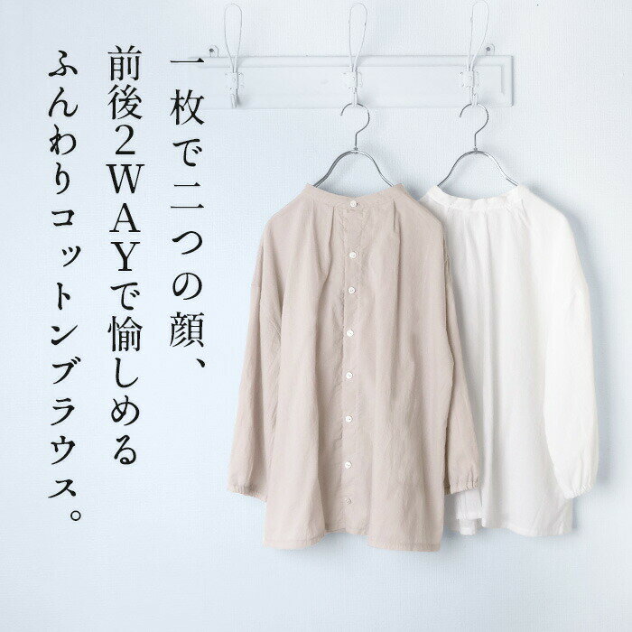 【新作】[ 薄手 ブラウス レディース おしゃれ トップス ] 60番手 ふんわりコットンローン 2WAY ブラウス / 日本製 40代 50代 60代 女性 ファッション きれいめ 上品 無地 前後2WAY 綿 襟なし コットン 袖ゴム 立ち襟 ノーカラー 前開き 後ろ開き バックボタン ゆったり