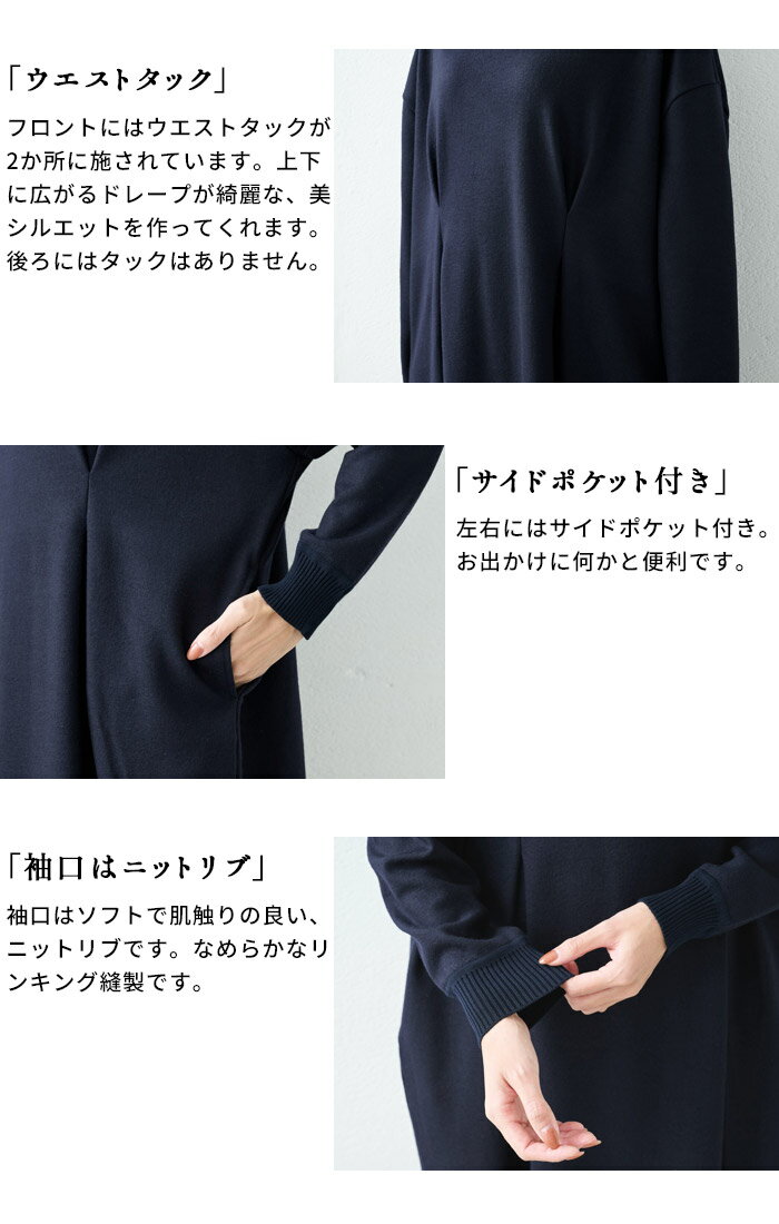 【新作】[ ワンピース レディース 長袖 秋冬 きれいめ ] 圧縮ウール100% リブ使い ウエストタックワンピース / 日本製 40代 50代 60代 女性 大人 ウエストタック ウール 毛 ロング ミモレ丈 膝下 フォーマル シンプル ナチュラル ゆったり 防寒 暖かい 秋 冬