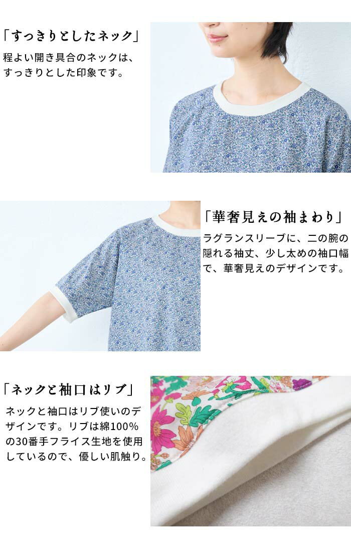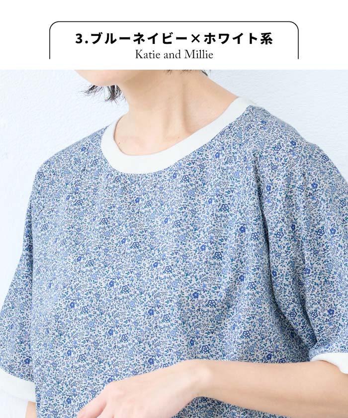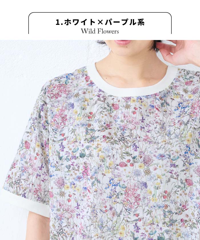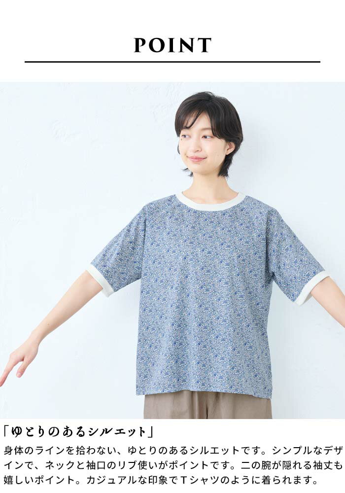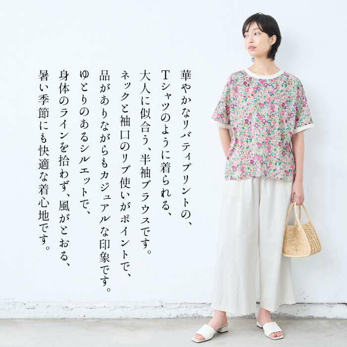 【新作】[ リバティ ブラウス 半袖 レディース 大人服 薄手 ] コットン100% リバティプリント リブ使いブラウス / 日本製 40代 50代 60代 ファッション 花柄 総柄 Tシャツ ゆったり カジュアル 夏 トップス 服 綿100% 綿100 リバティー liberty タナローン