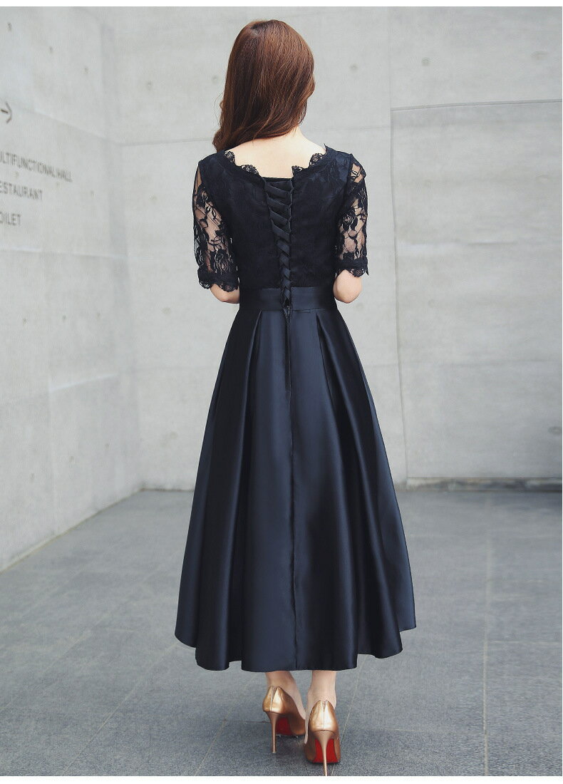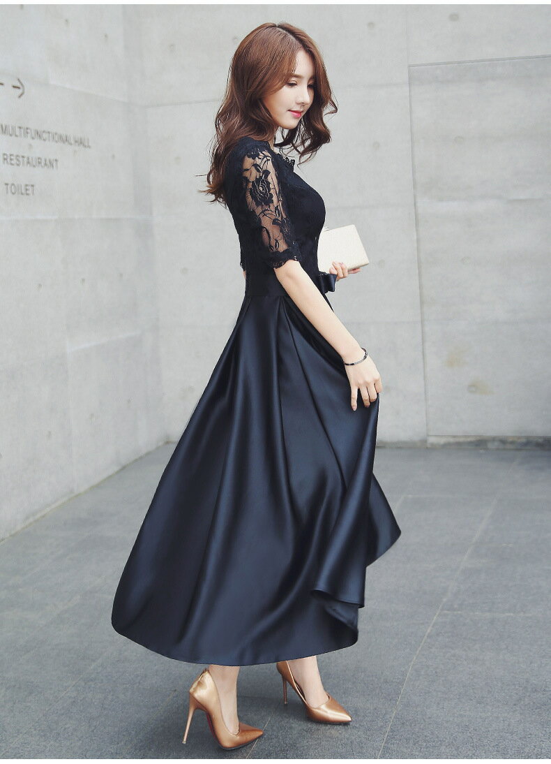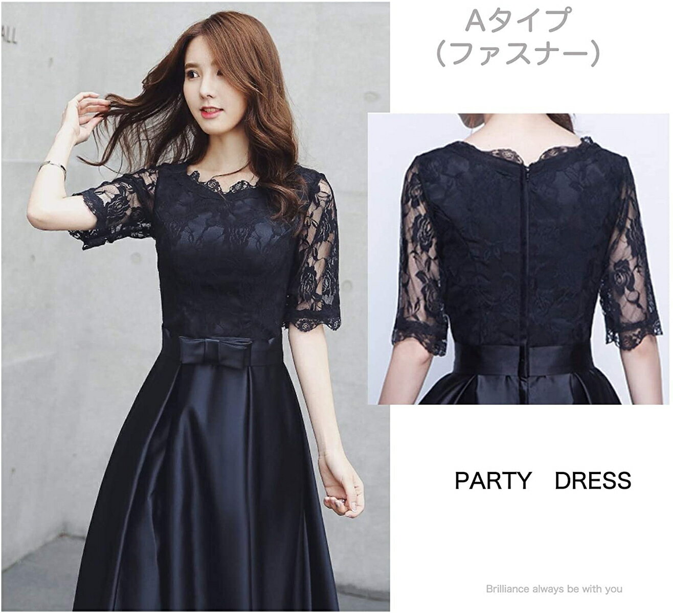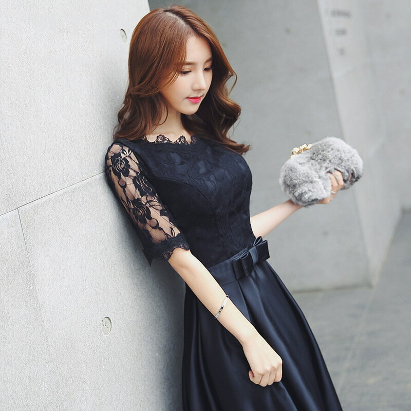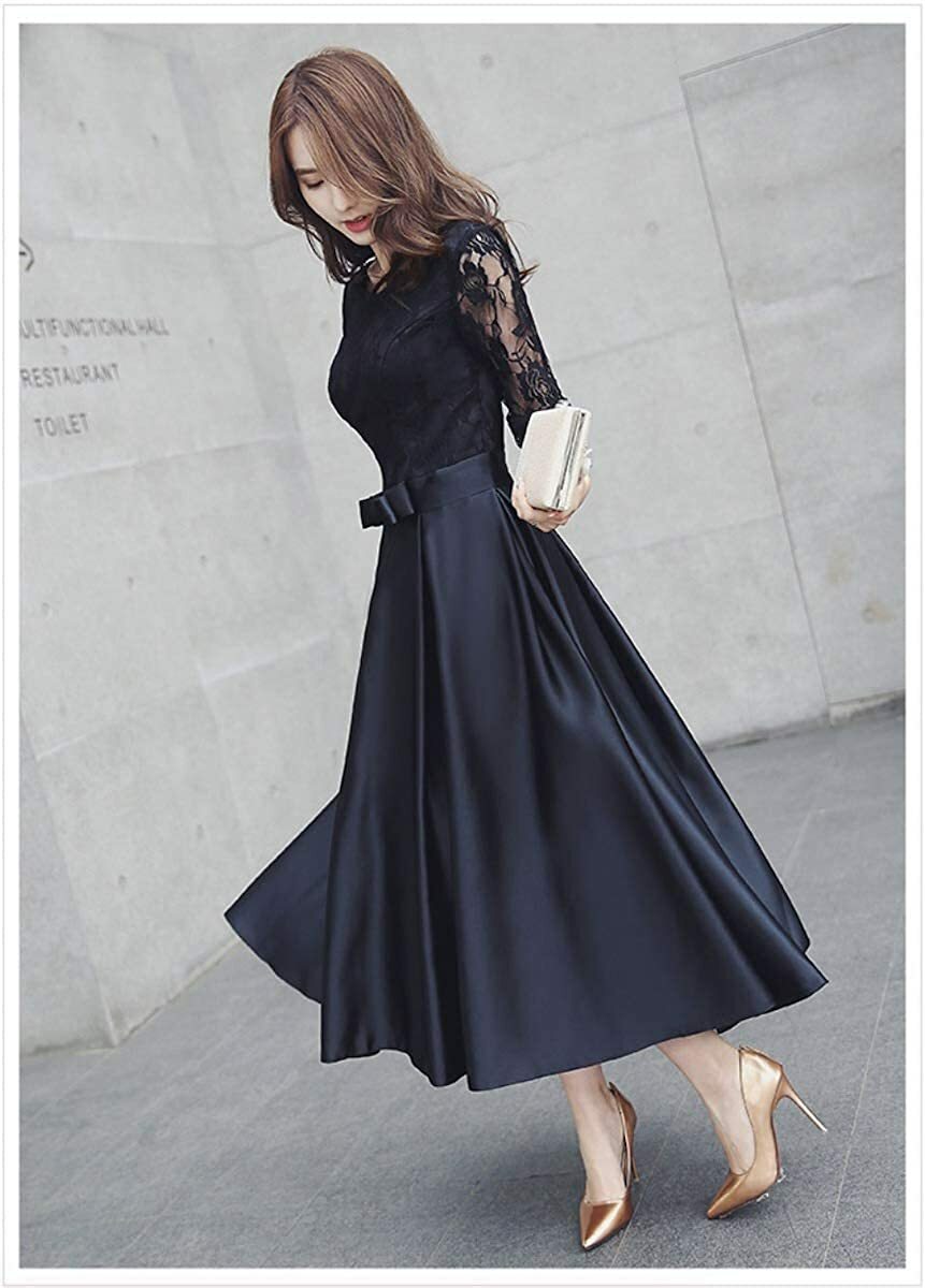 【送料無料】 ドレス 結婚式ドレス ロングドレス パーティードレス オケージョンドレス 袖あり 五分袖 冬 リボン付き Aライン フレア ロング丈 ミディアム丈 ショート丈 黒 二次会 謝恩会 披露宴 レース 秋冬 春 おしゃれ 優雅