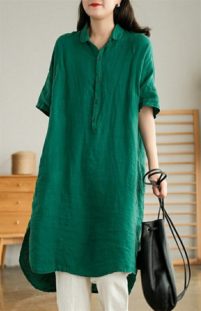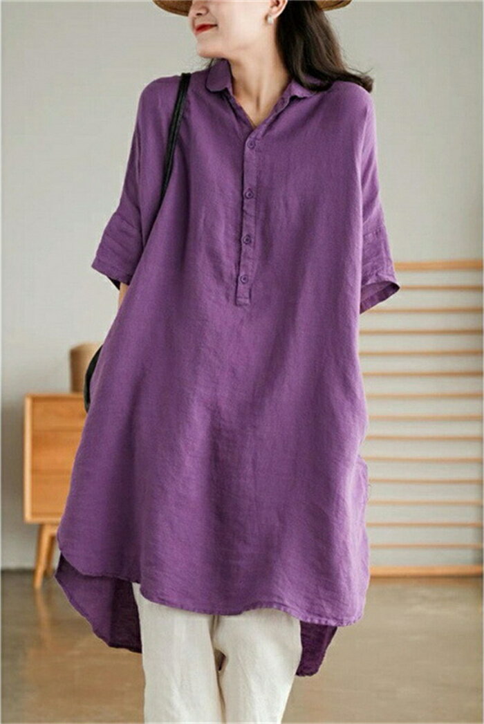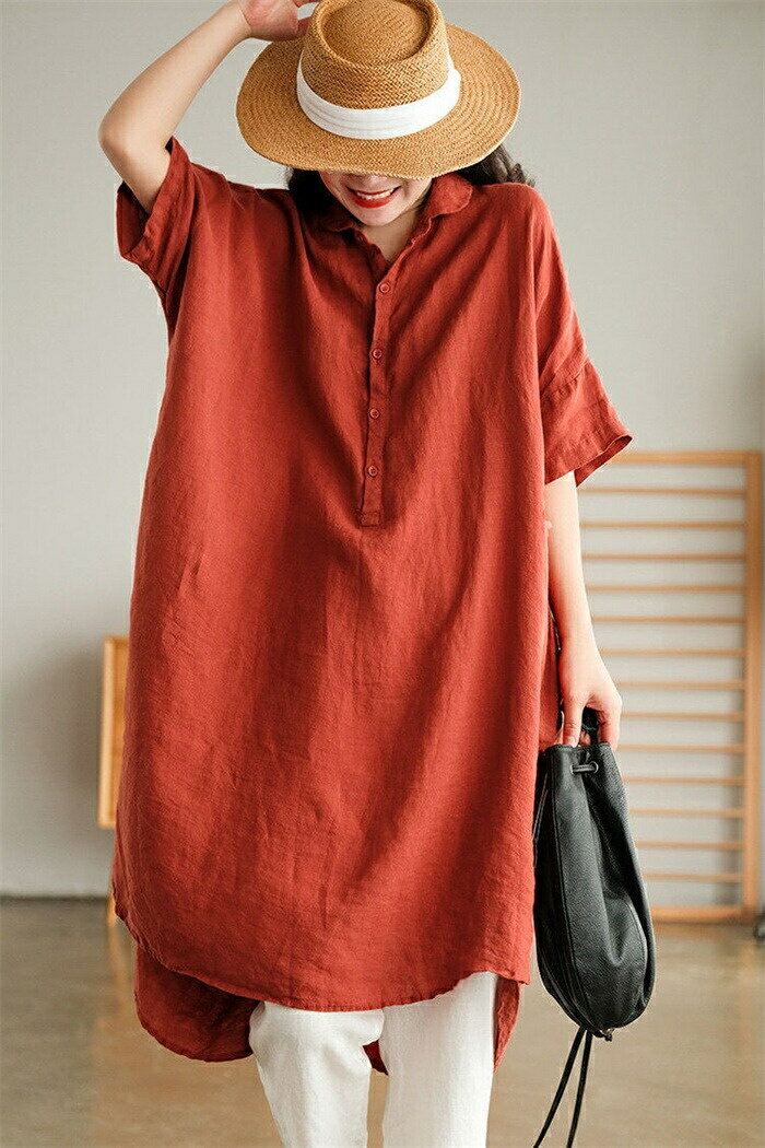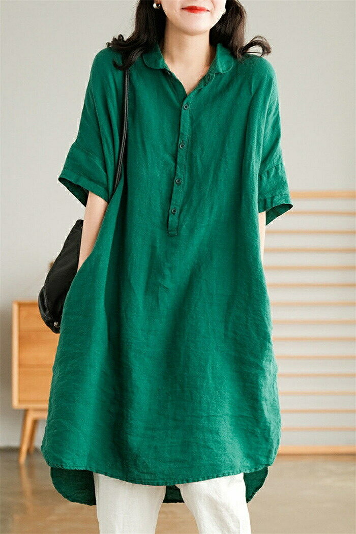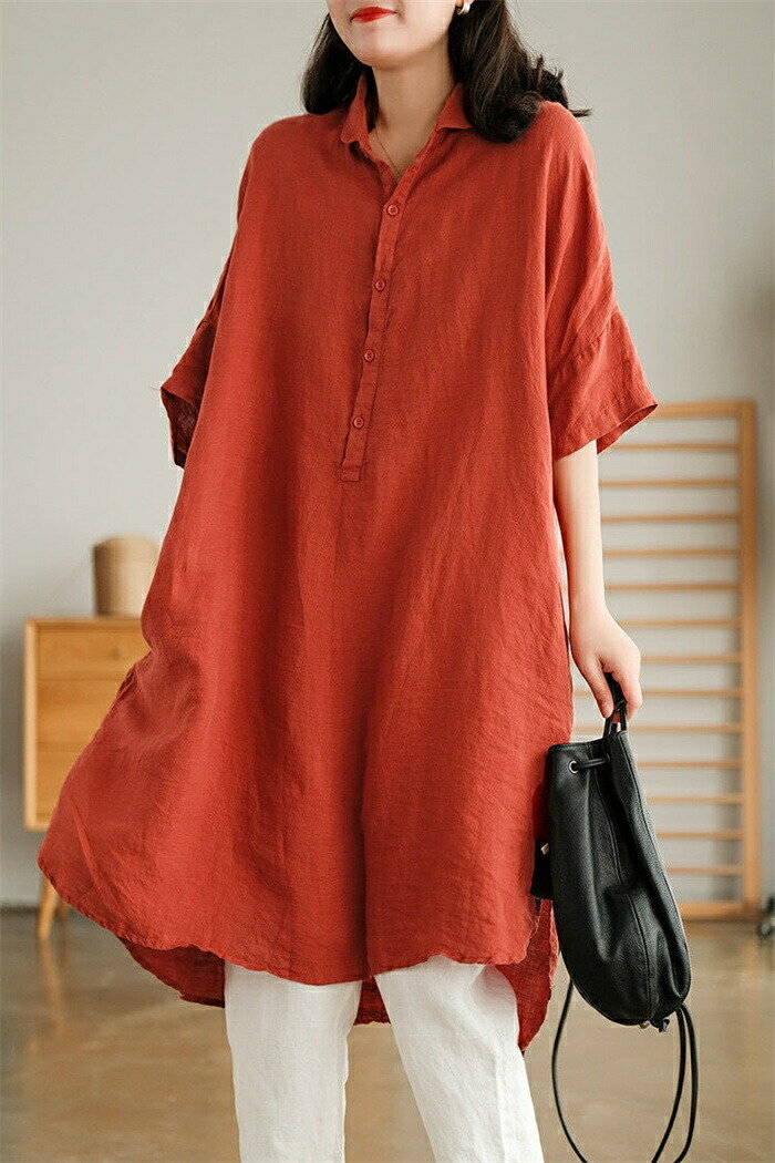 チュニック シャツ レディース ロングシャツ tシャツ 半袖 ロング丈 膝丈 綿麻風 シャツブラウス トップス 5分袖 ブラウス ロング丈シャツ 無地 ゆったり 綿麻 体型カバー シャツワンピ ポケット付け 春 無地 大きいサイズ 前開け リネン シンプル カジュアル風 送料無料