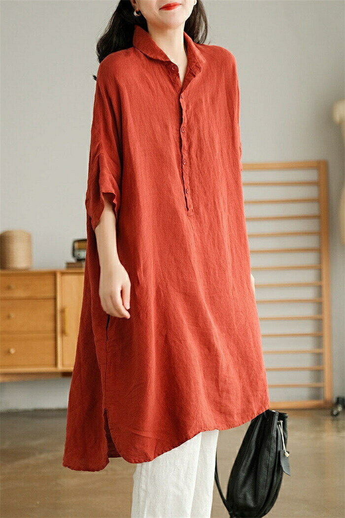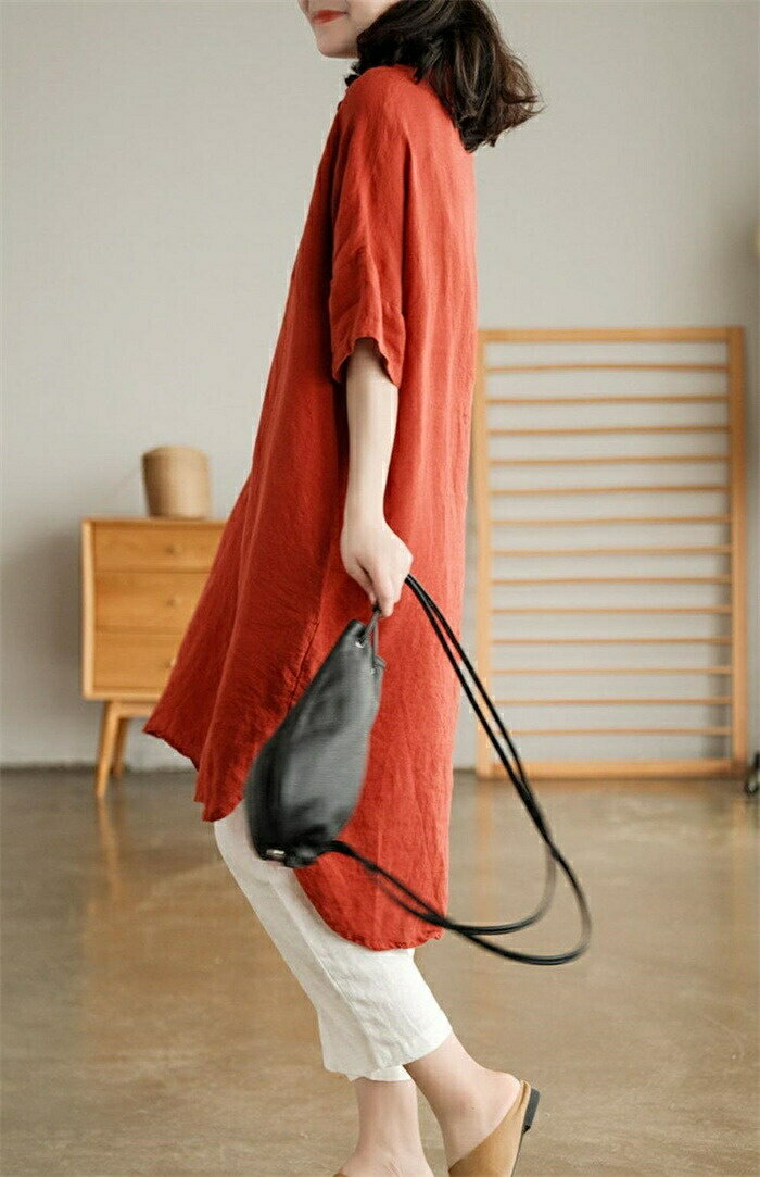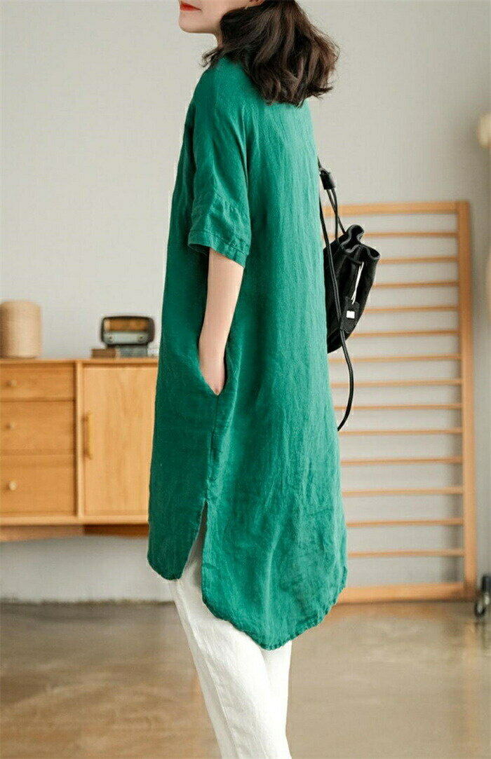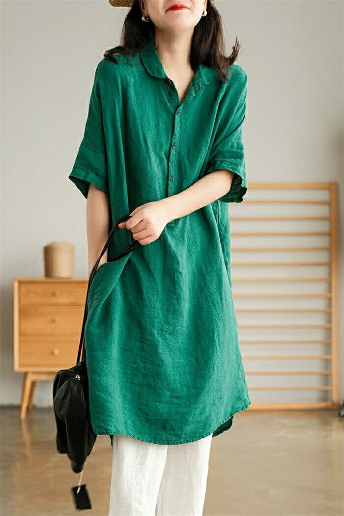 チュニック シャツ レディース ロングシャツ tシャツ 半袖 ロング丈 膝丈 綿麻風 シャツブラウス トップス 5分袖 ブラウス ロング丈シャツ 無地 ゆったり 綿麻 体型カバー シャツワンピ ポケット付け 春 無地 大きいサイズ 前開け リネン シンプル カジュアル風 送料無料
