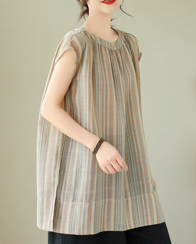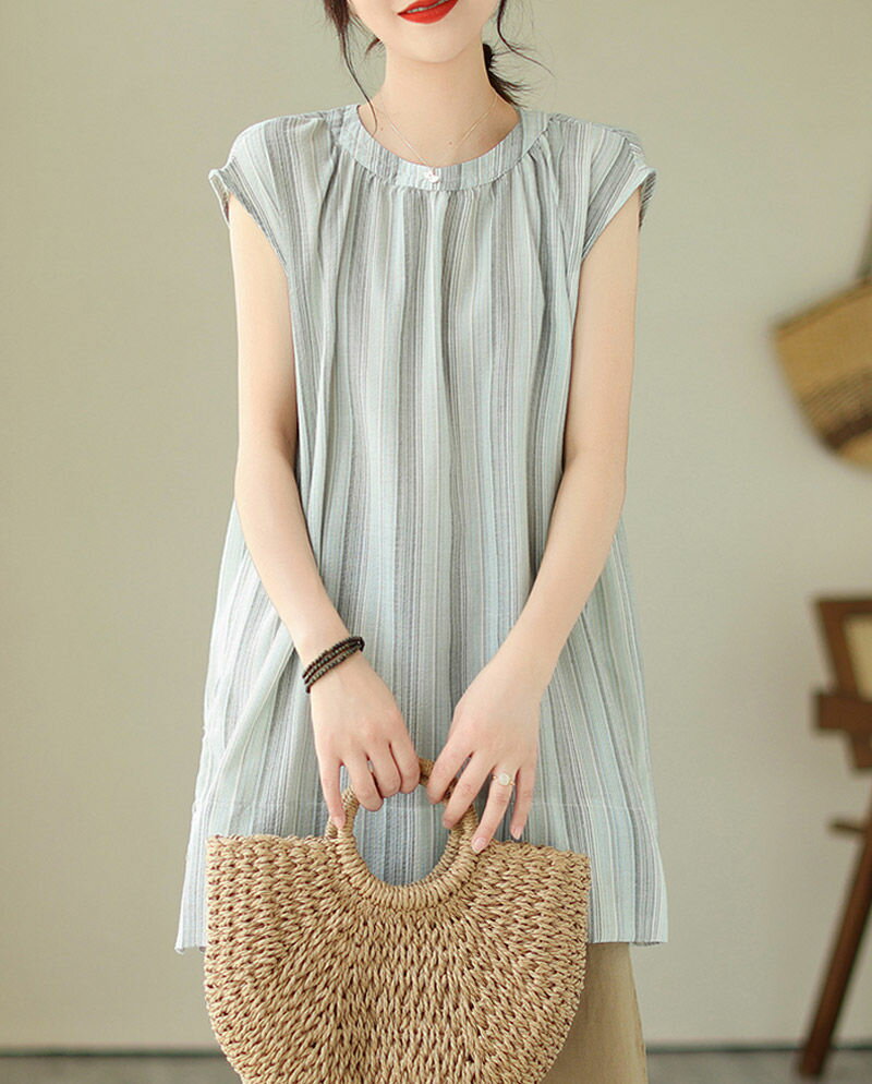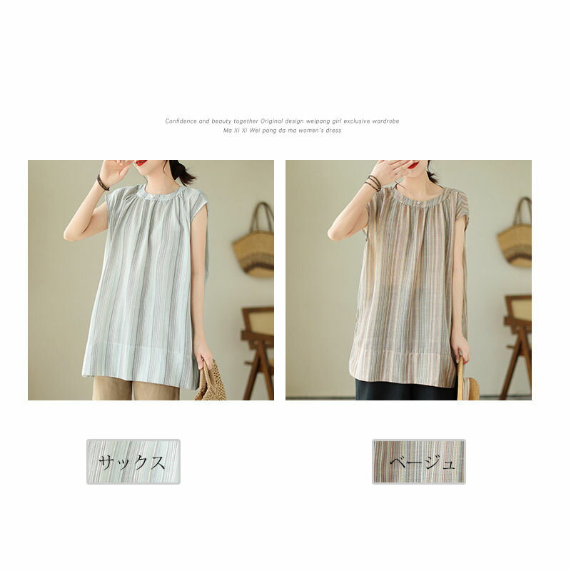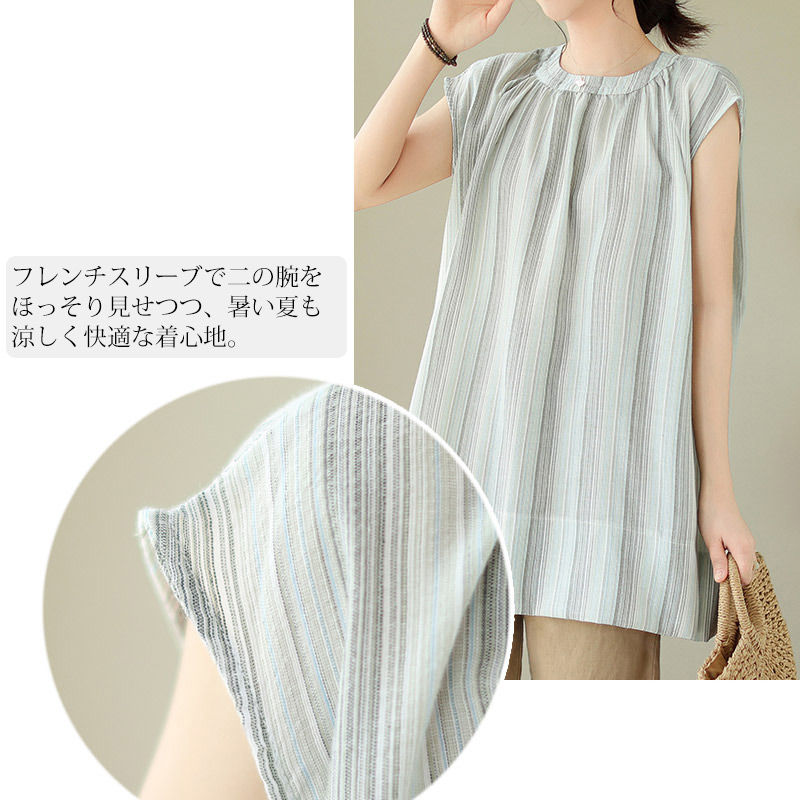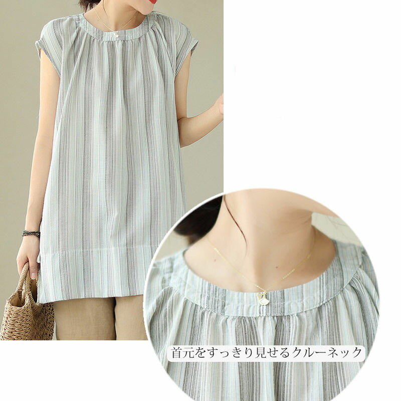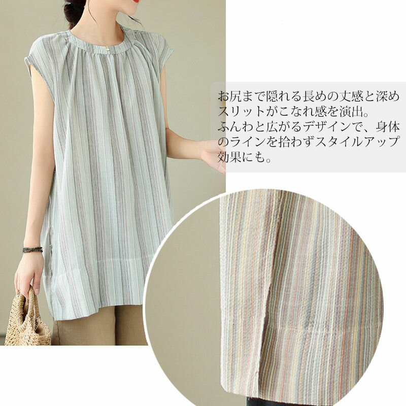 チュニック ブラウス 半袖 シャツ ストライプ ロング レディース トップス 夏 ノースリーブ フレンチスリーブ きれいめ シャツブラウス ロングシャツ サイドスリット 落ち感 お洒落 ギャザー 半袖シャツ ロング丈 大きいサイズ おしゃれ ゆったり 50代 40代 30代 送料無料