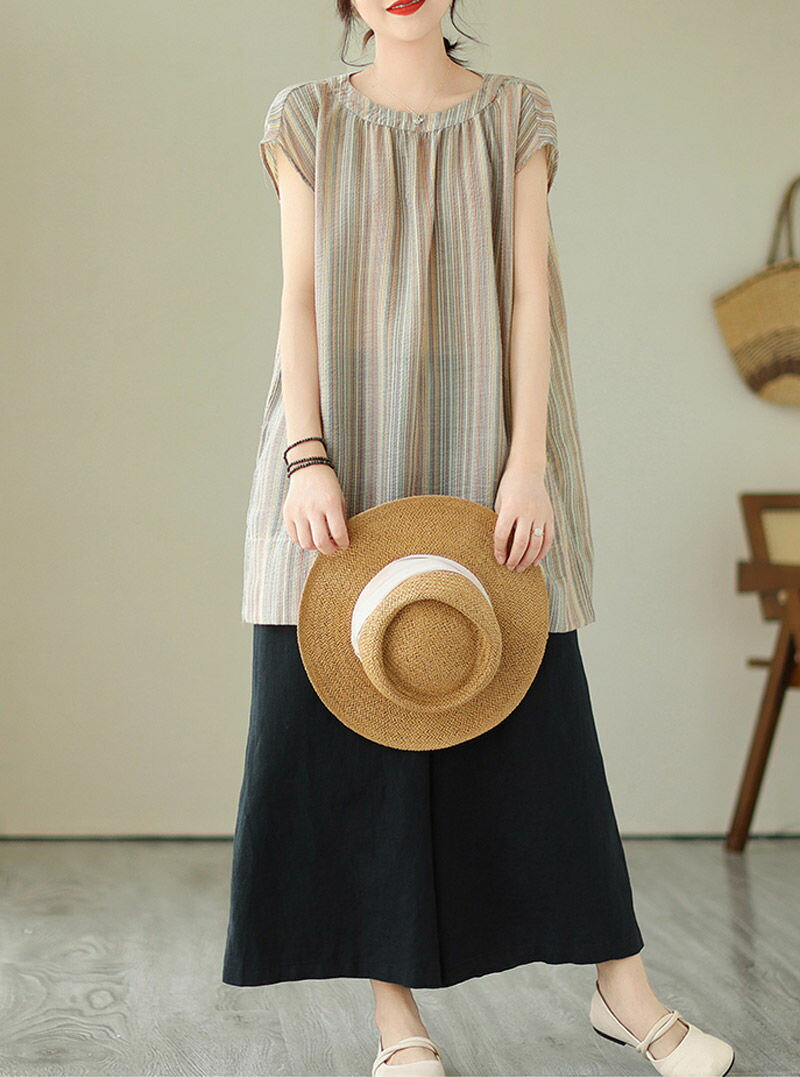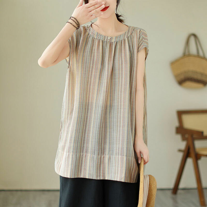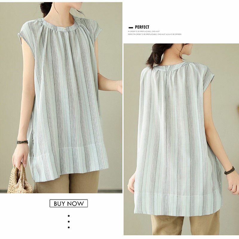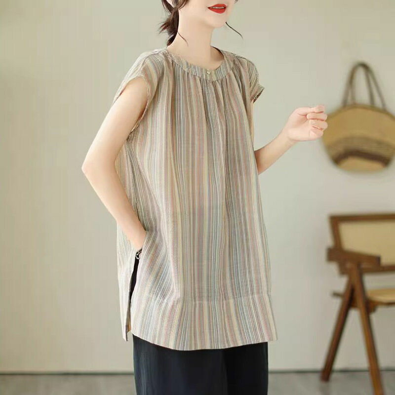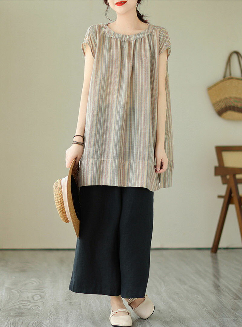 チュニック ブラウス 半袖 シャツ ストライプ ロング レディース トップス 夏 ノースリーブ フレンチスリーブ きれいめ シャツブラウス ロングシャツ サイドスリット 落ち感 お洒落 ギャザー 半袖シャツ ロング丈 大きいサイズ おしゃれ ゆったり 50代 40代 30代 送料無料