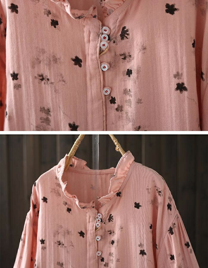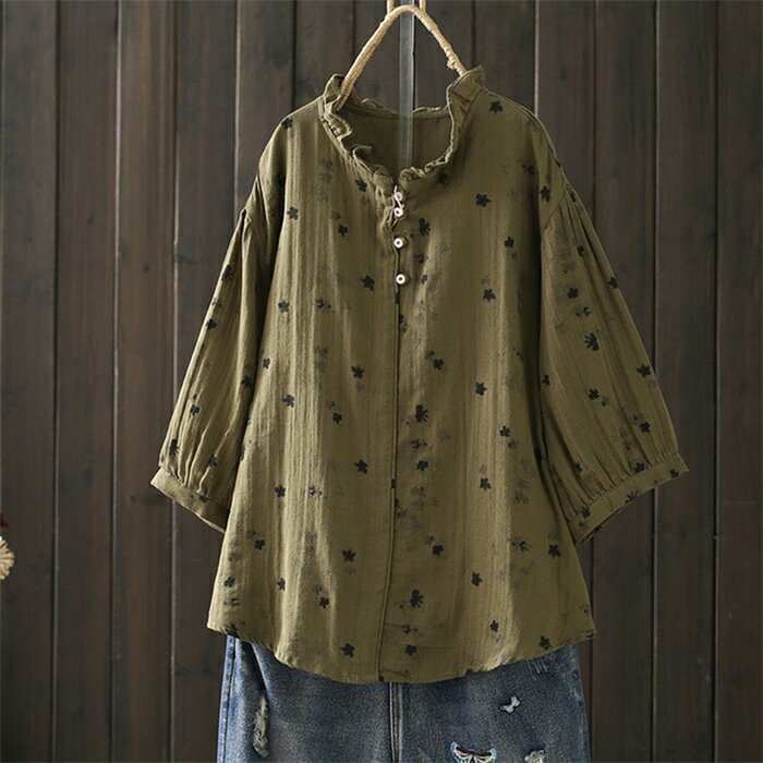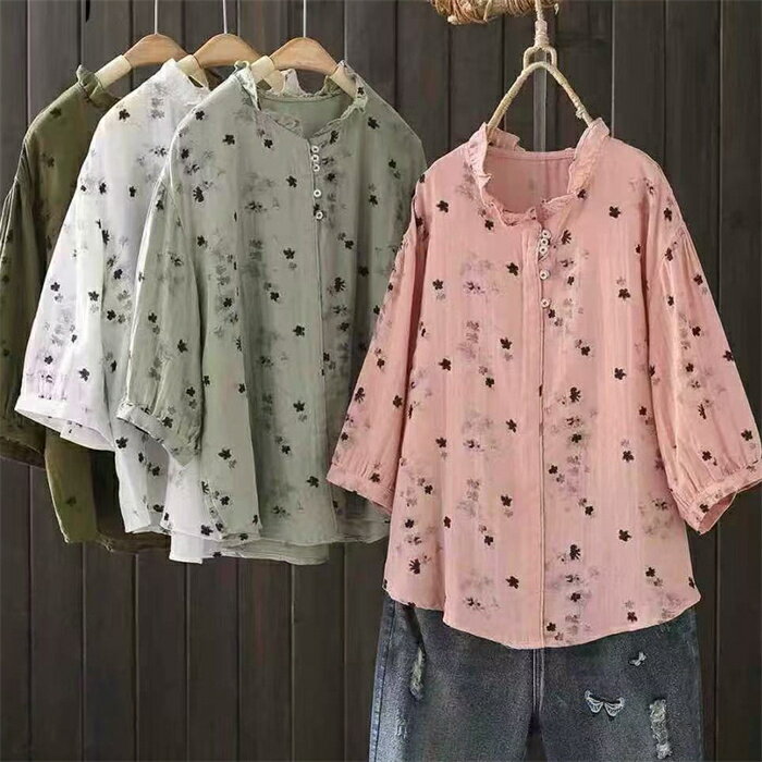 7分袖シャツ ガーゼシャツ 七分袖 レディース 半袖シャツ ホワイトシャツ シャツブラウス 綿シャツ コットンシャツ 白シャツ ショート丈 花柄 花柄シャツ フリルネック ゆったり ギャザー ダブルガーゼ スタンドカラー 半開け 通気性 通勤 カジュアル 送料無料