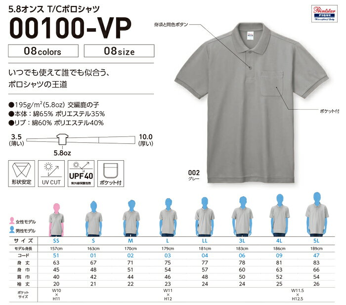 綿×ポリT/Cポロシャツ00100-VPプリント加工のみ!ポケット付オリジナルポロシャツが作成できます。安心のプロ工場。
