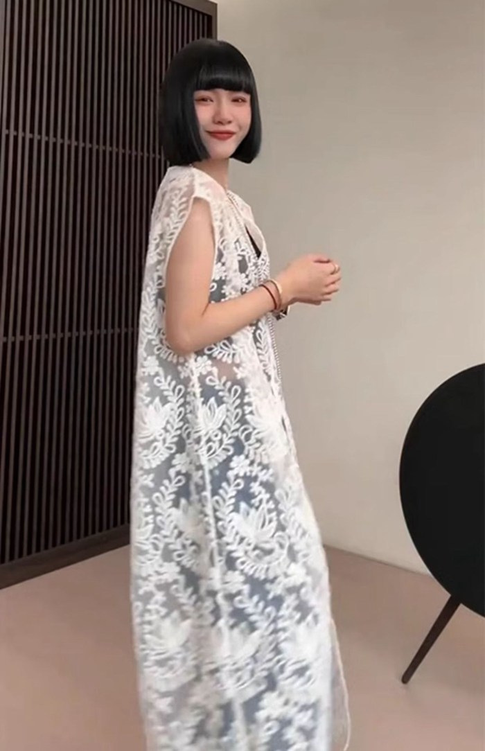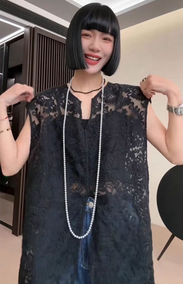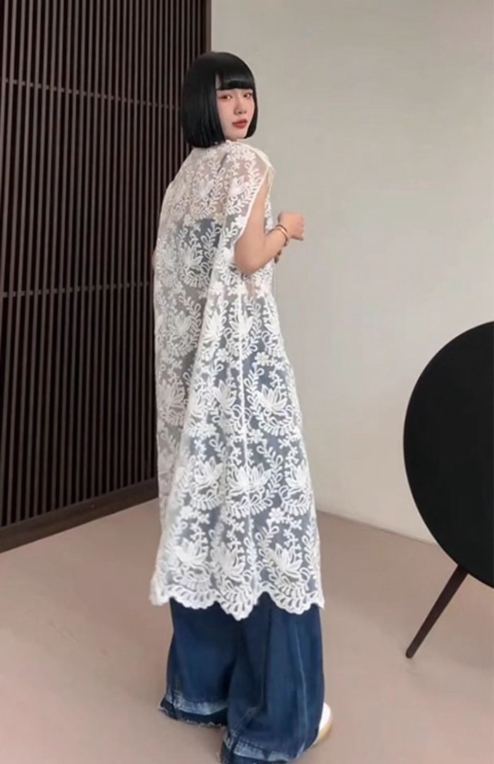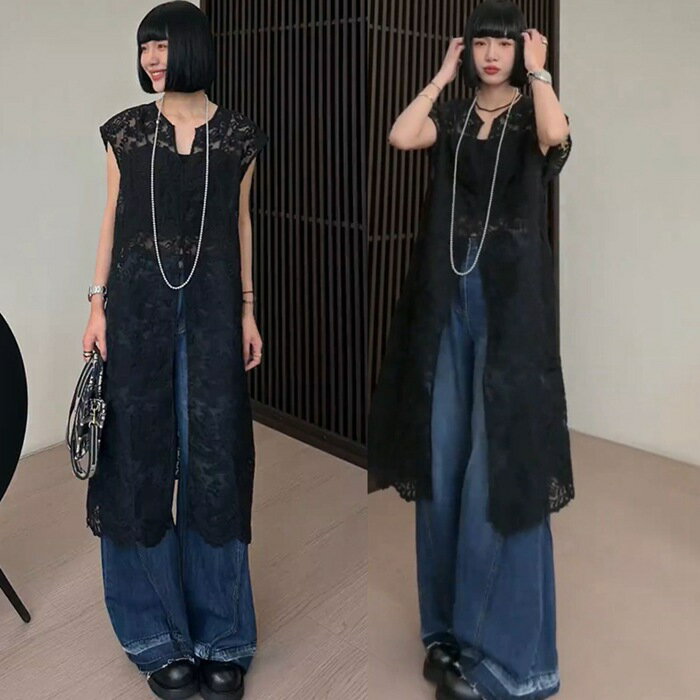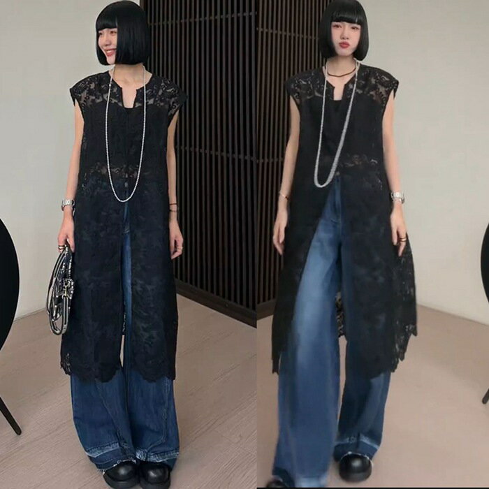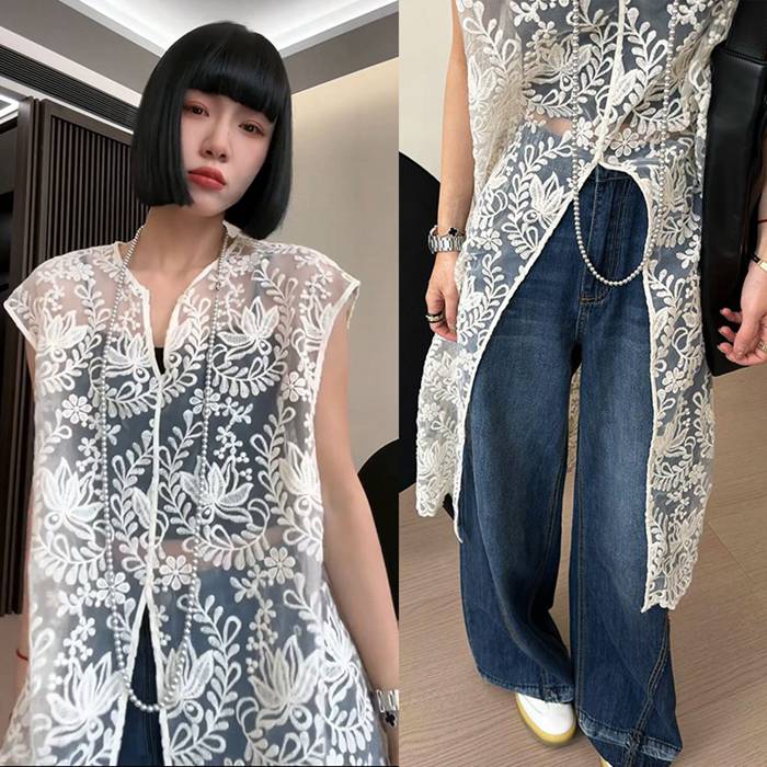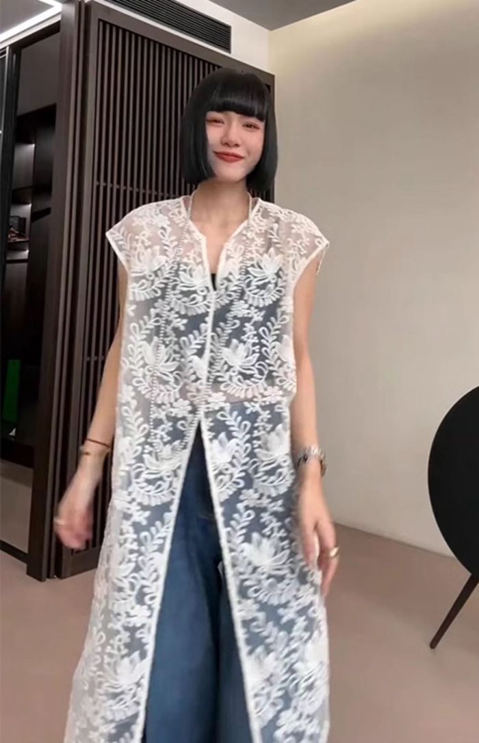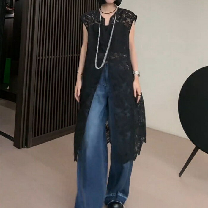 総レースベスト ロング丈 刺繍 上品 レディース 夏 vネック ベスト レディース 総レース ロングベスト 透け感 シースルー トップス ロング ノースリーブ 羽織り 重ね着 レイヤード 上品 エレガント フェミニン おしゃれ