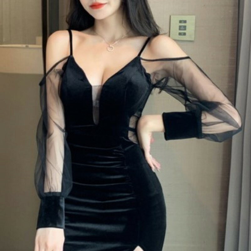 ロング スリット ワンピース キャミソール タイト マキシ イブニングドレス オフショルダー シースルー 長袖 レディース DV8 ミリア