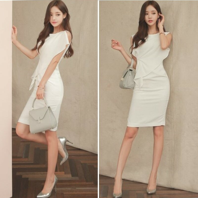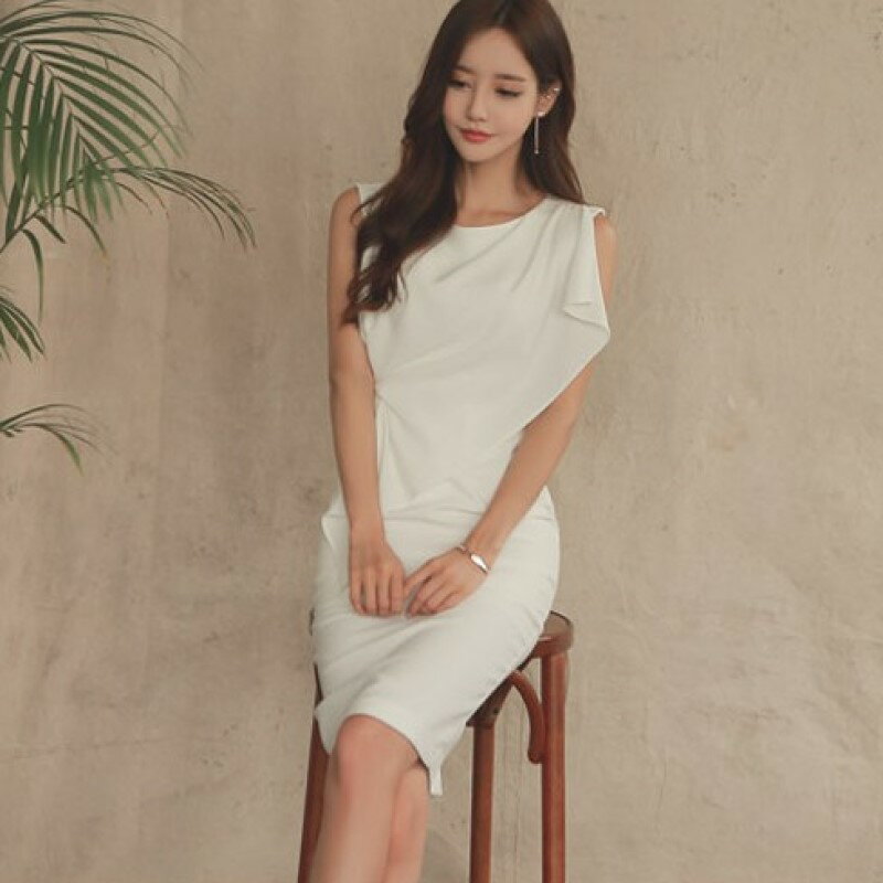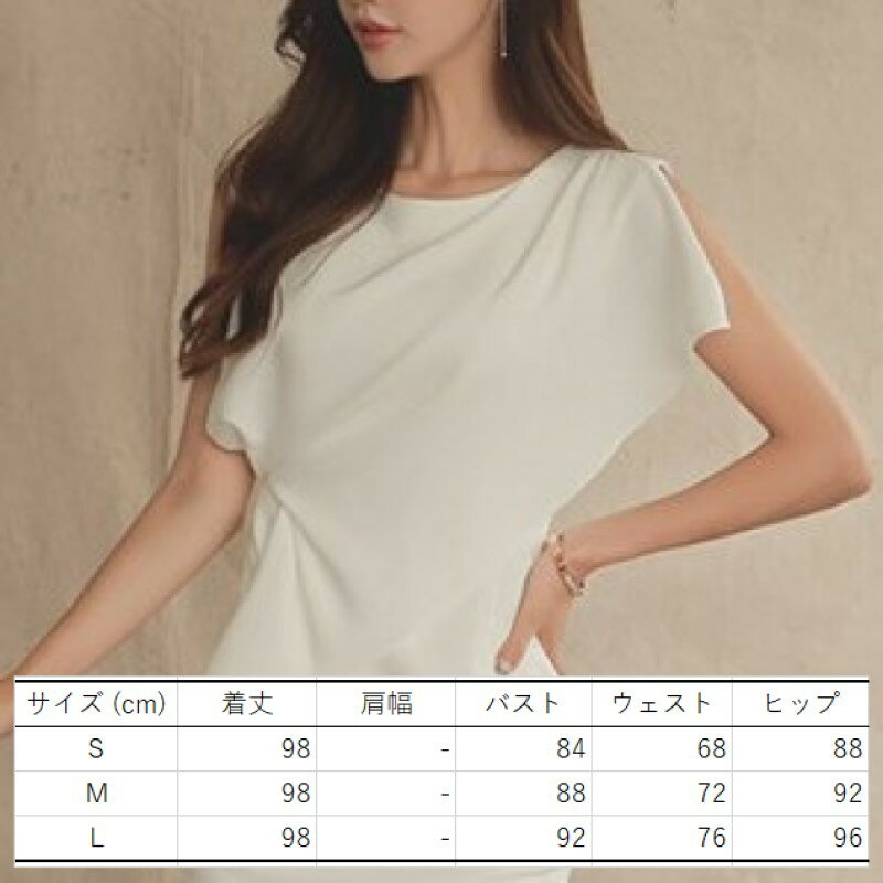 フリル ワンピース ノースリーブ タイト クラブドレス クルーネック アシンメトリー ハイウエスト 切り換え ひざ丈 レディース C04 リオナ