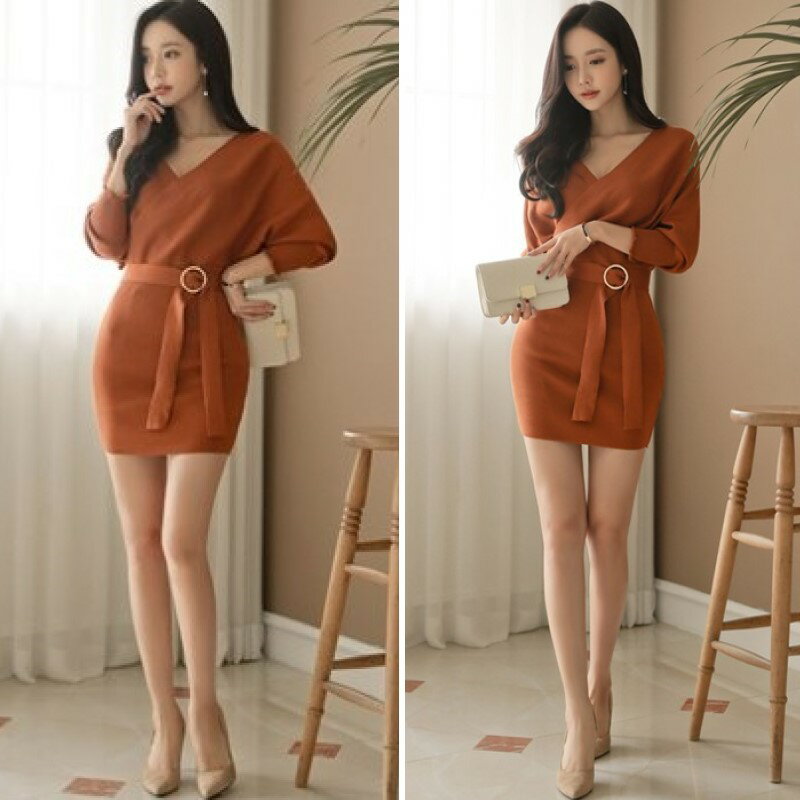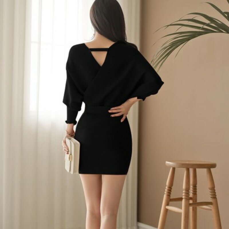 ニット ワンピース カシュクール タイトミニ クラブドレス Vネック 七分袖 ドルマンスリーブ ベルト リボン ミニ レディース CO6 アデール