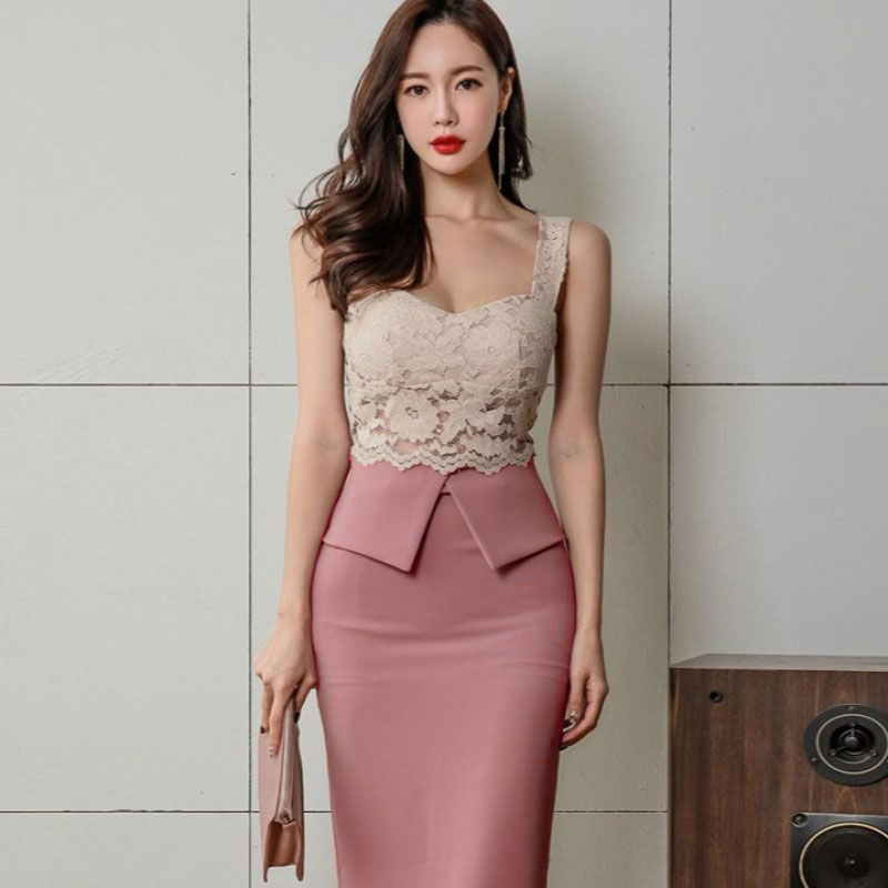ペプラム ワンピース キャミソール タイト クラブドレス レース シースルー ノースリーブ ウエストマーク ひざ丈 レディース D81 チェリア