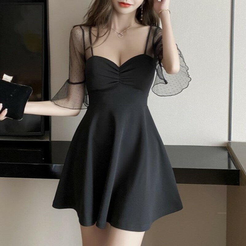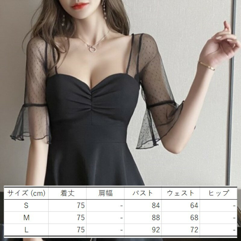 シースルー ワンピース ベアトップ フレア ミニ クラブドレス ベルスリーブ 五分袖 オープンバック ハイウエスト レディース D93 ティアナ