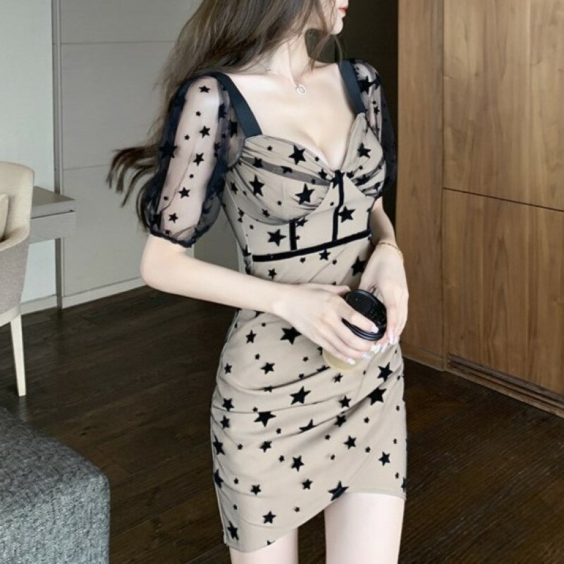 星柄 ワンピース スクエアネック タイトミニ クラブドレス 五分袖 シースルー ウエストマーク カシュクール レディース DC9 ダリア