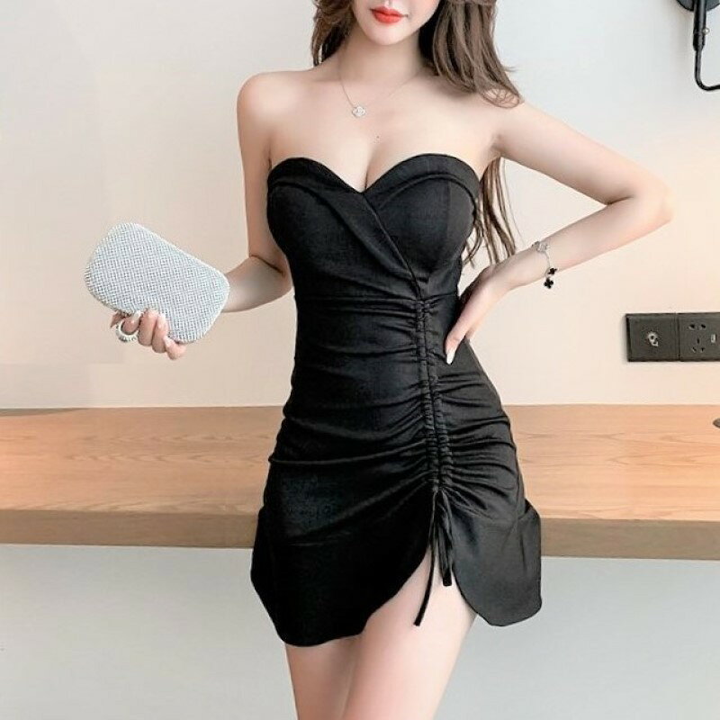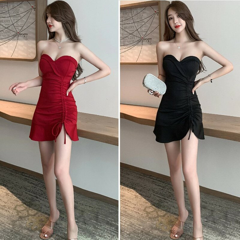 ベアトップ ワンピース オープンバック タイトミニ クラブドレス ノースリーブ ギャザー リボン スリット ミニ レディース DF9 カリン