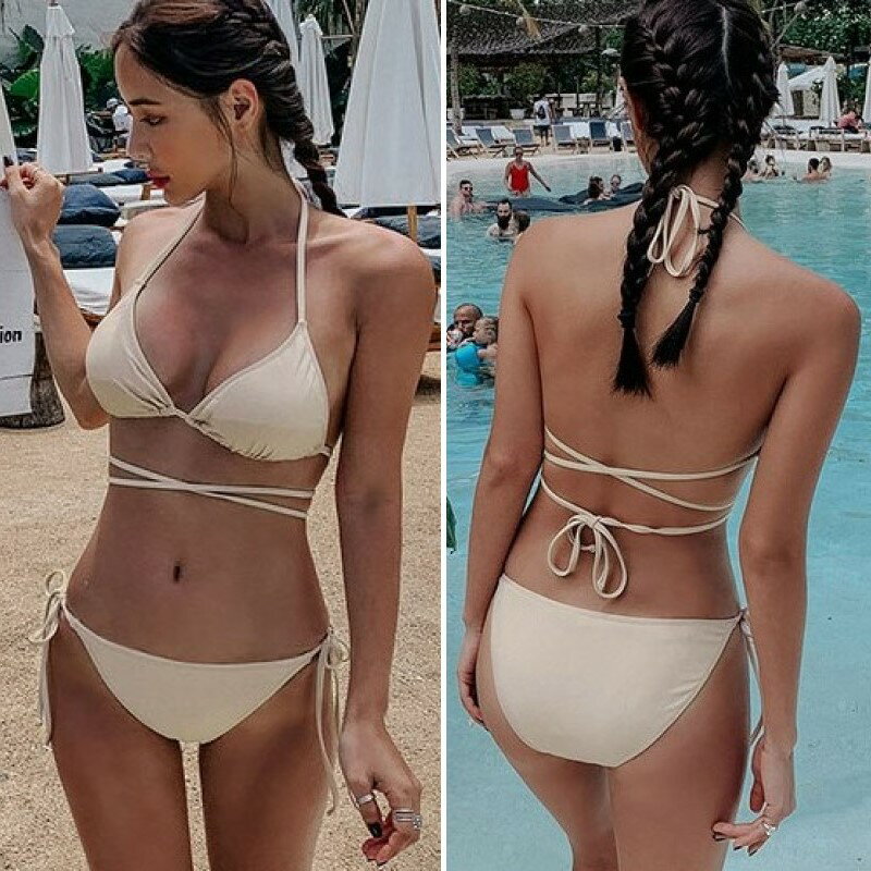 ビキニ セット 水着 ホルターネック ロング ストラップ スイムドレス 三角 紐 ラップ パッド入り ワイヤーなし レディース DJ0 チェリー