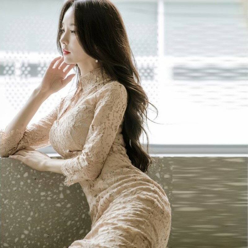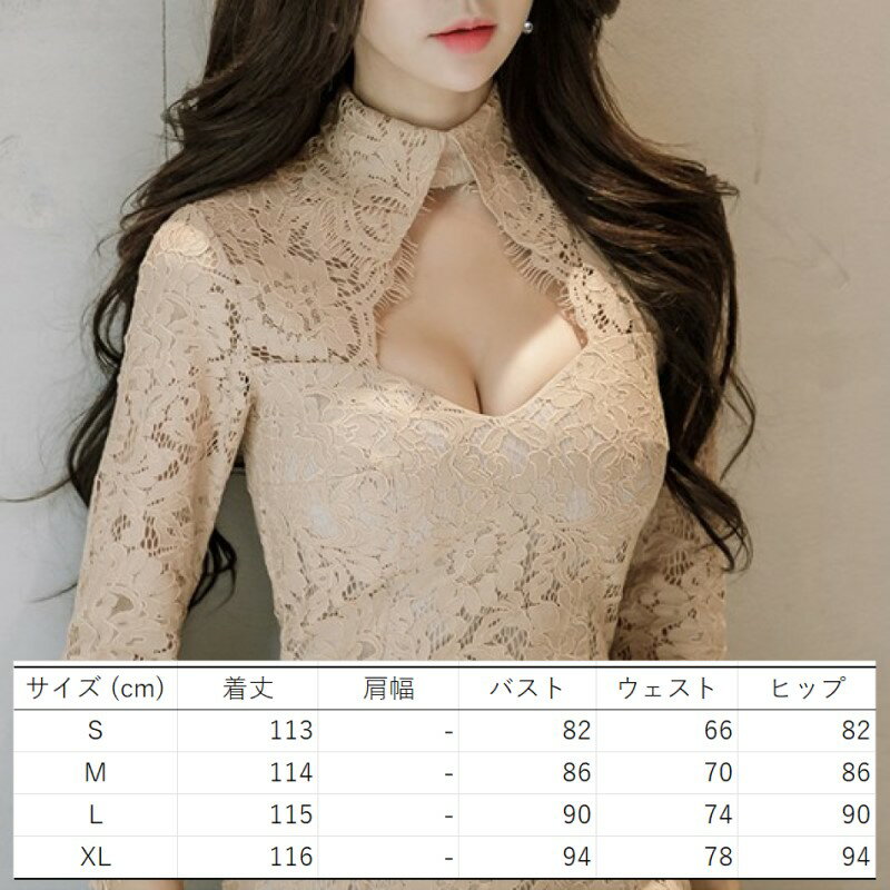 レース ワンピース シースルー タイト ミモレ クラブドレス えり付き ベアトップ 七分袖 ハイウエスト スリット レディース DJ3 メロディ