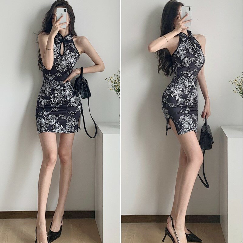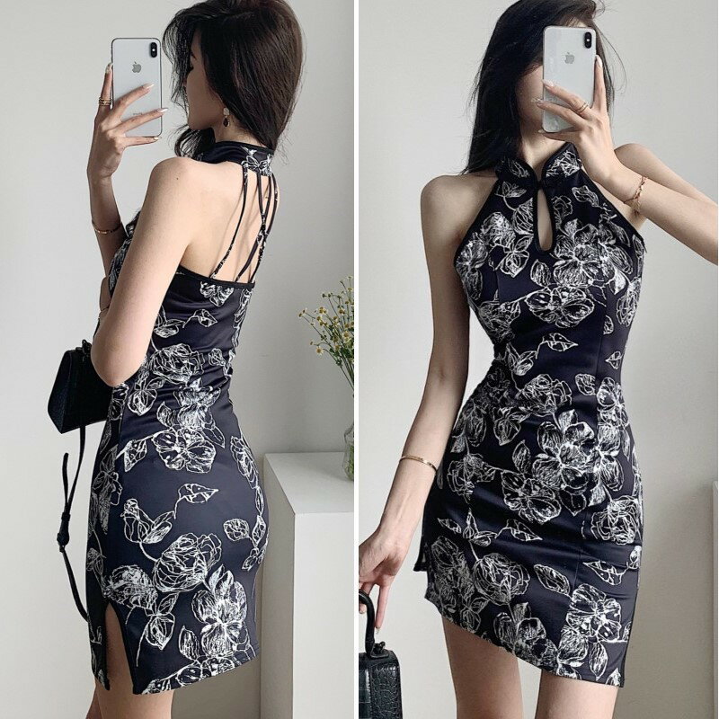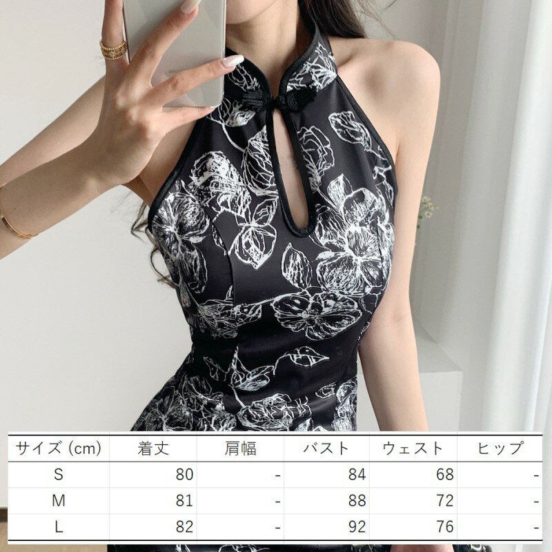 チャイナ ドレス ワンピース ホルターネック タイトミニ クラブドレス ボタニカル ノースリーブ スリット ミニ レディース DM4 シャロン