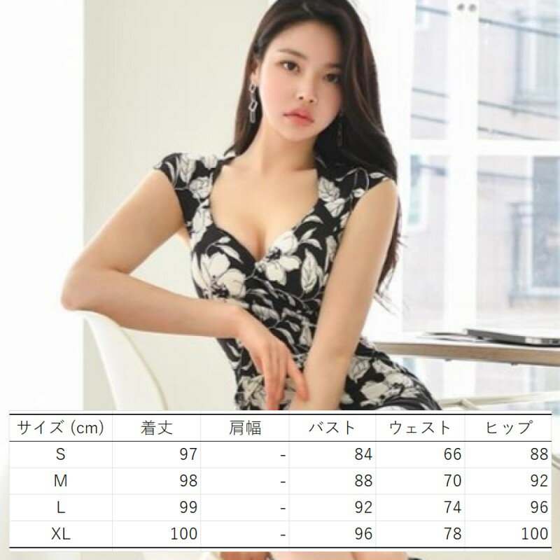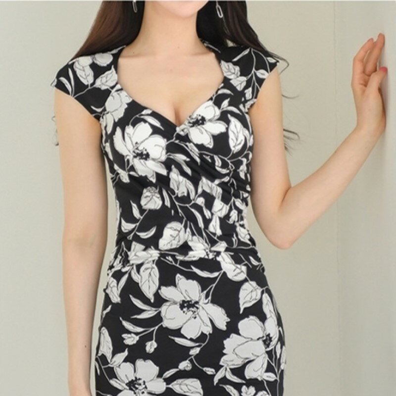 ボタニカル ワンピース カシュクール タイト ミディ クラブドレス 花柄 Vネック ノースリーブ ハイウエスト ひざ丈 レディース DN2 エリナ