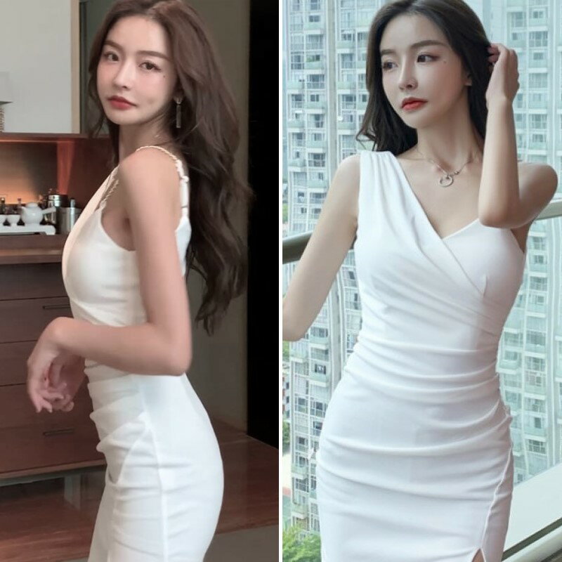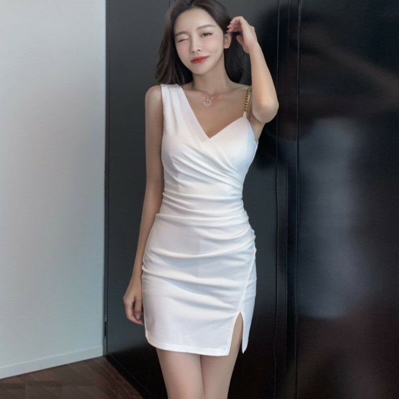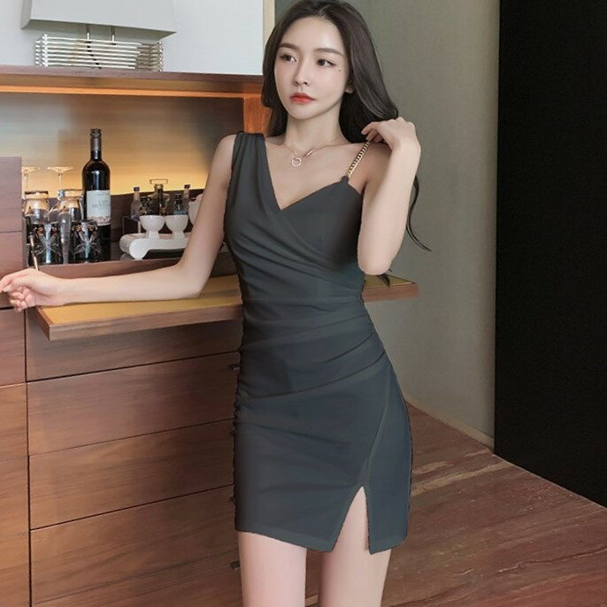 ワンショルダー ワンピース カシュクール タイトミニ クラブドレス ノースリーブ チェーン スリット ミニ タイト レディース DT4 フィラ
