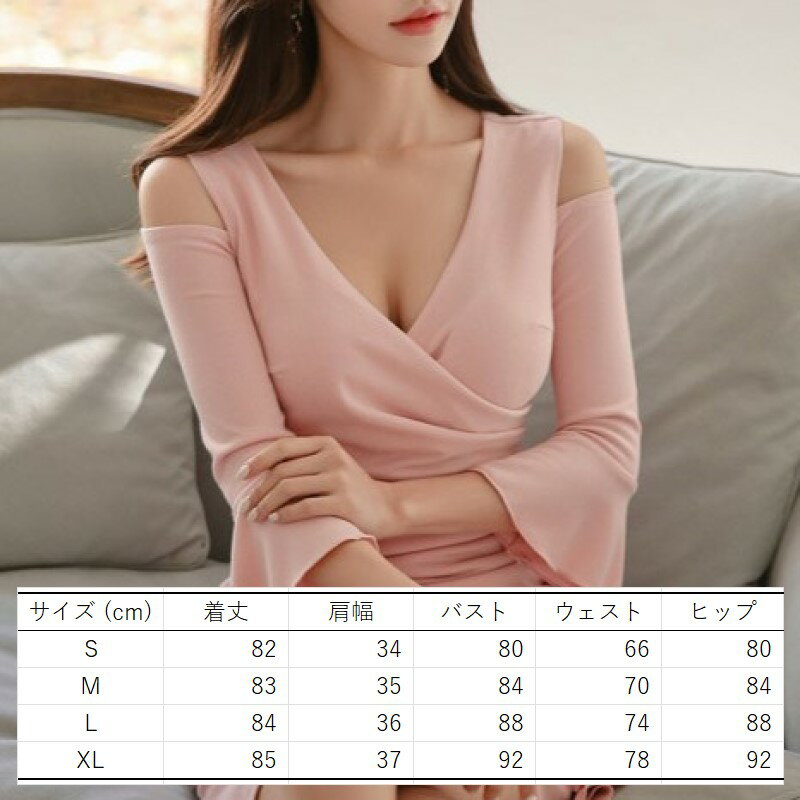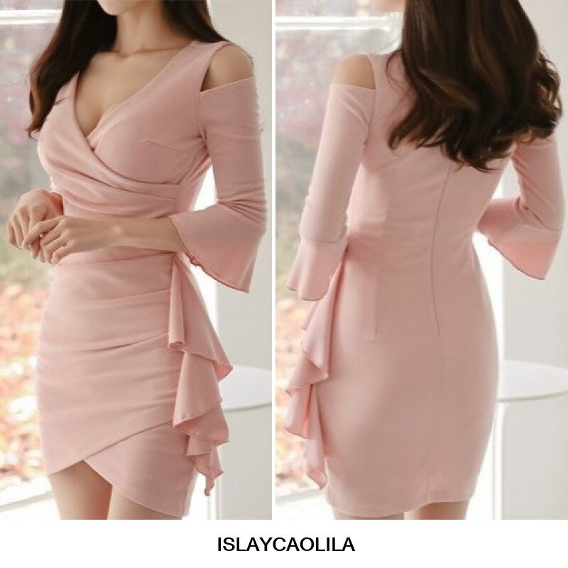 カシュクール ワンピース フリル タイトミニ クラブドレス Vネック 肩見せ 七分袖 アシンメトリー ハイウエスト ミニ レディース C89 リラ